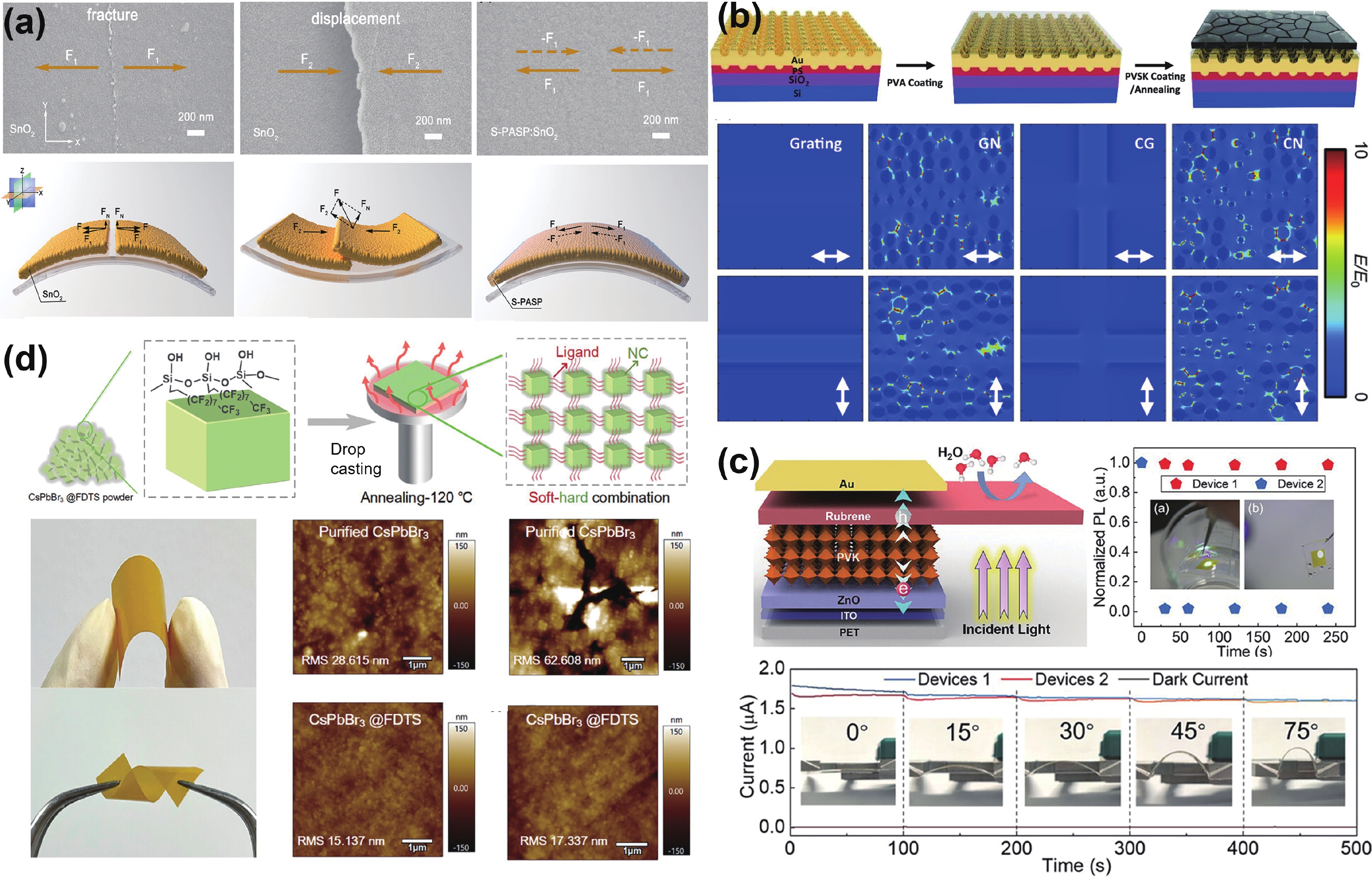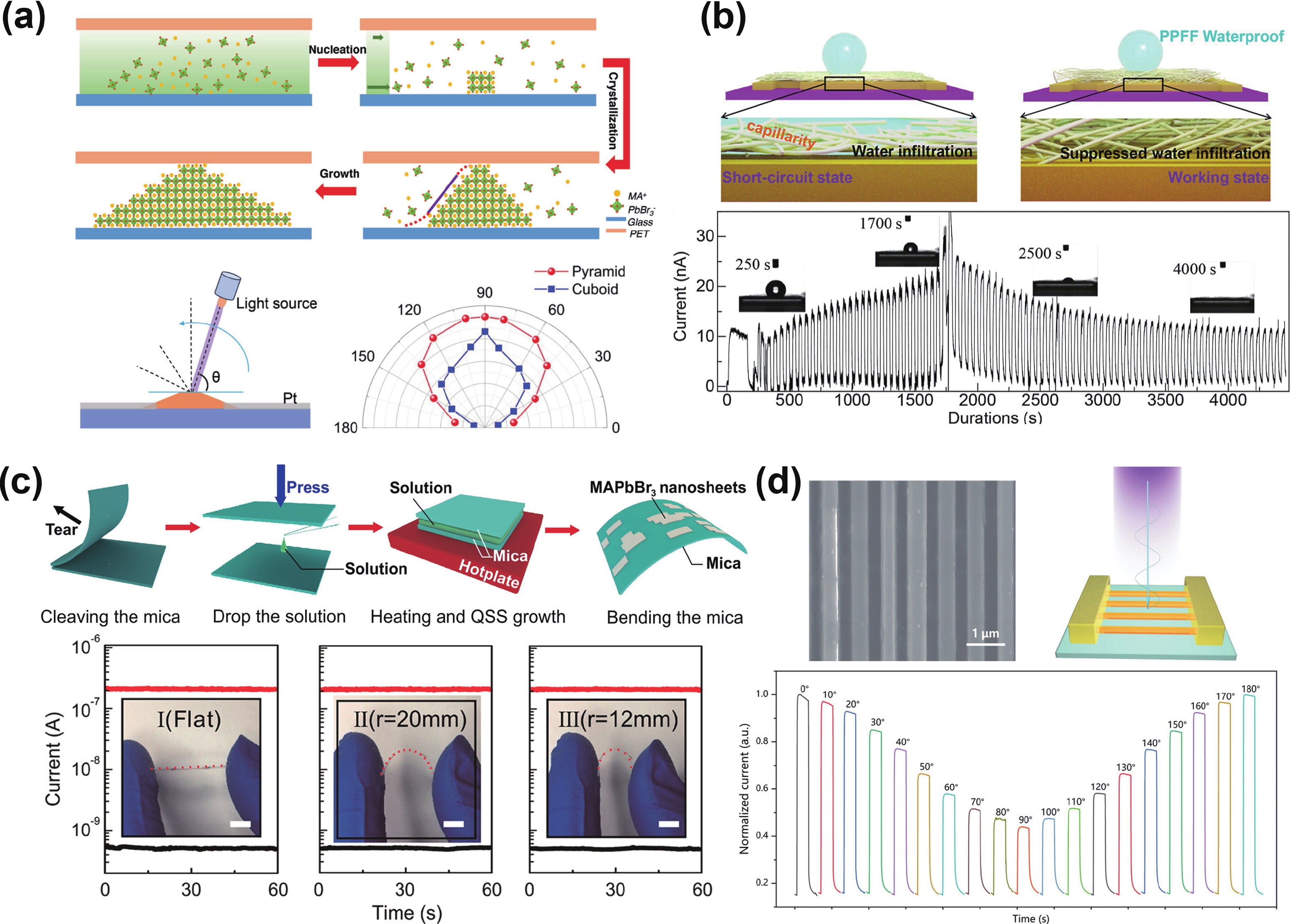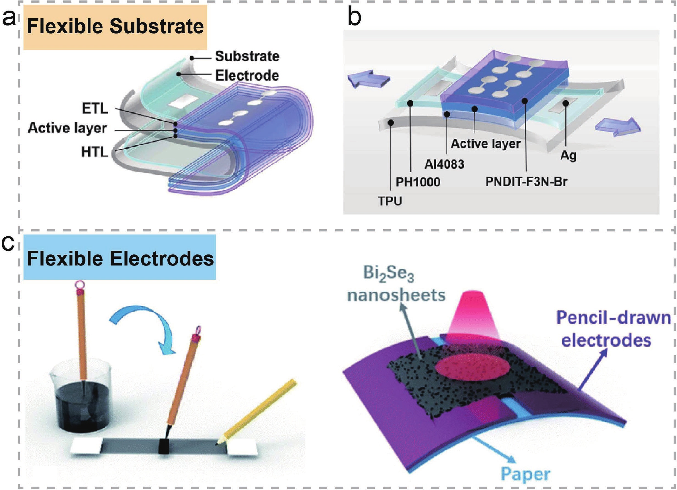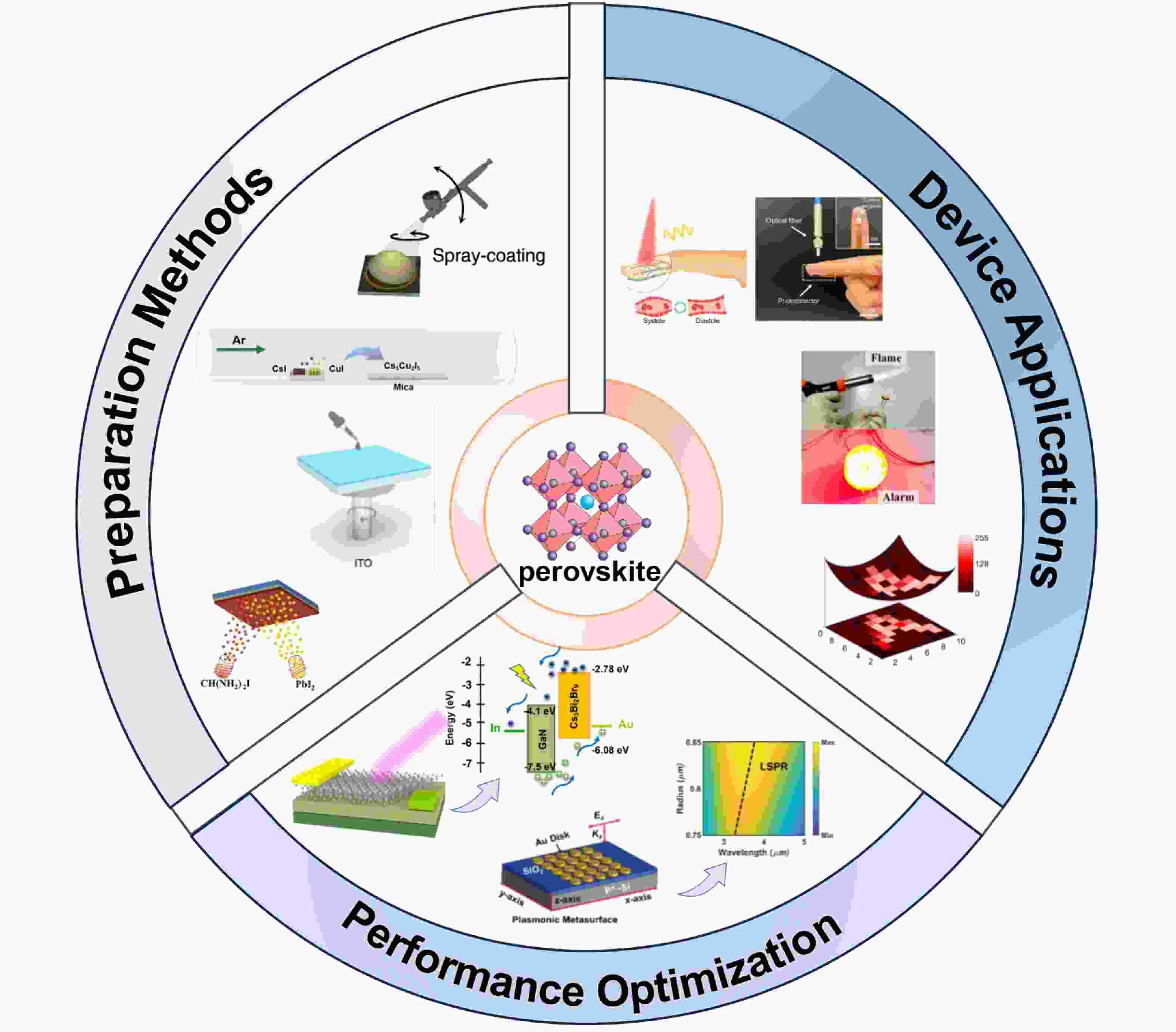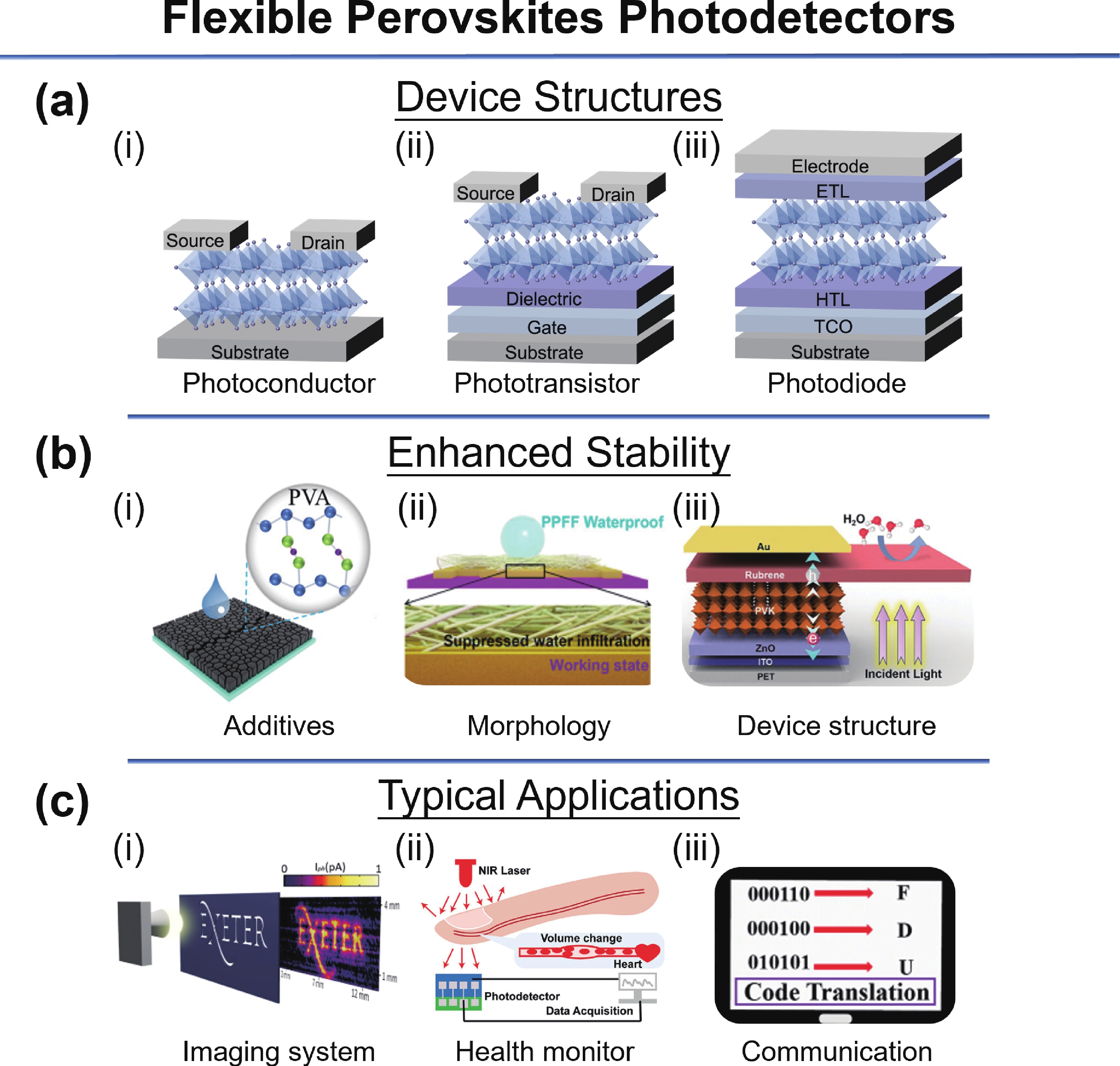 Flexible photodetectors have garnered significant attention by virtue of their potential applications in environmental monitoring, wearable healthcare, imaging sensing, and portable optical communications. Perovskites stand out as particularly promising materials for photodetectors, offering exceptional optoelectronic properties, tunable band gaps, low-temperature solution processing, and notable mechanical flexibility. In this review, we explore the latest progress in flexible perovskite photodetectors, emphasizing the strategies developed for photoactive materials and device structures to enhance optoelectronic performance and stability. Additionally, we discuss typical applications of these devices and offer insights into future directions and potential applications.