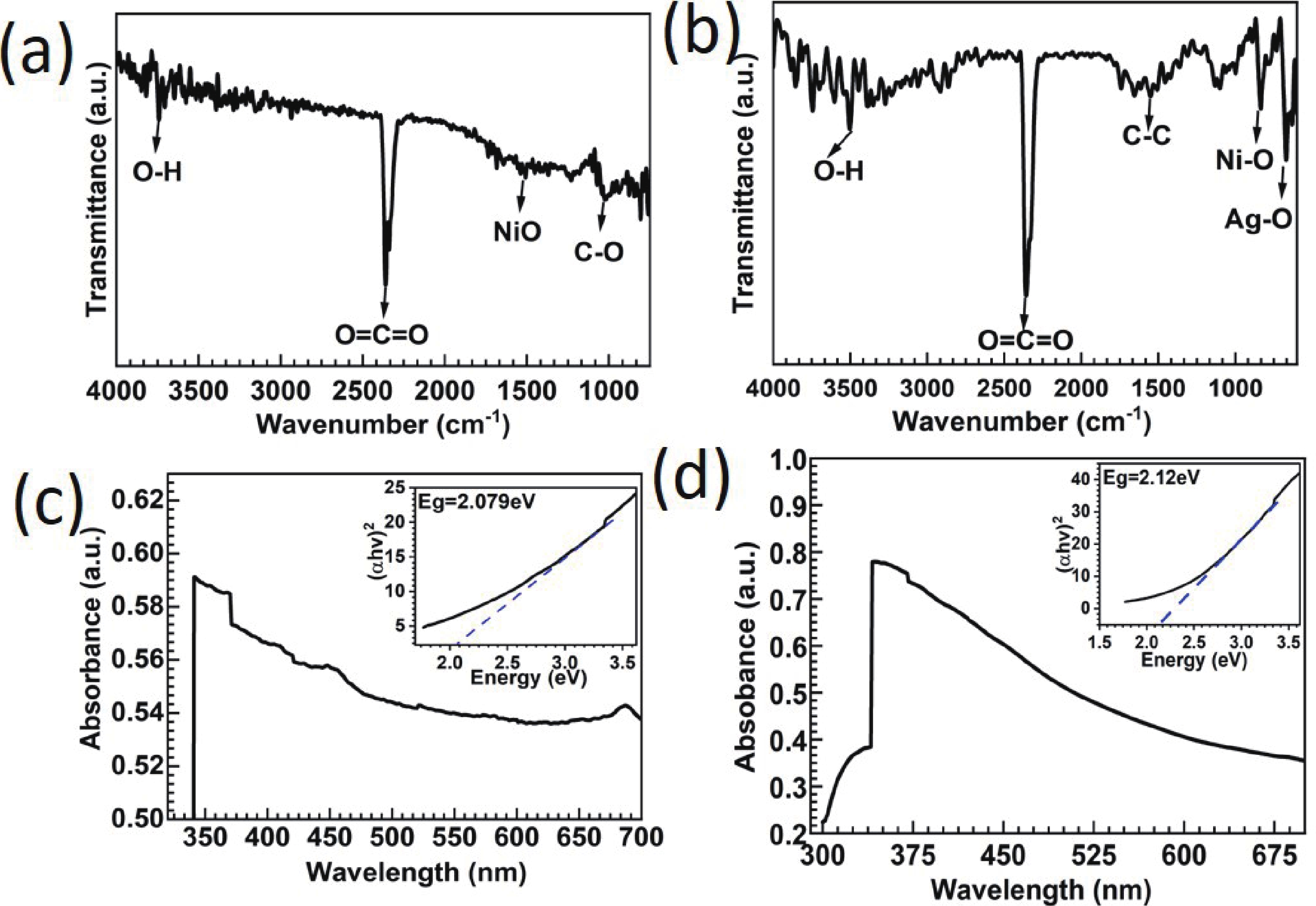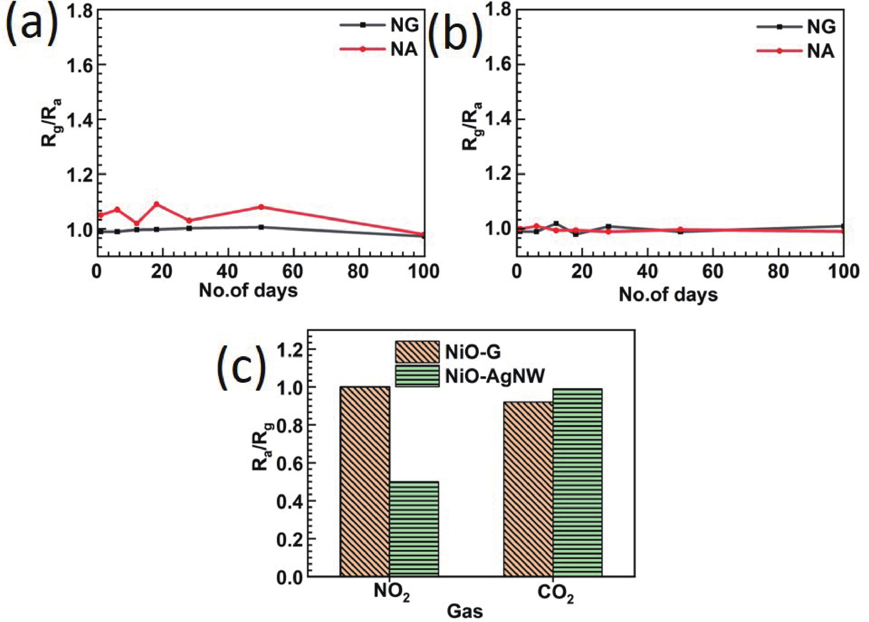 The rapid industrial growth and increasing population have led to significant pollution and deterioration of the natural atmospheric environment. Major atmospheric pollutants include NO2 and CO2. Hence, it is imperative to develop NO2 and CO2 sensors for ambient conditions, that can be used in indoor air quality monitoring, breath analysis, food spoilage detection, etc. In the present study, two thin film nanocomposite (nickel oxide-graphene and nickel oxide-silver nanowires) gas sensors are fabricated using direct ink writing. The nano-composites are investigated for their structural, optical, and electrical properties. Later the nano-composite is deposited on the interdigitated electrode (IDE) pattern to form NO2 and CO2 sensors. The deposited films are then exposed to NO2 and CO2 gases separately and their response and recovery times are determined using a custom-built gas sensing setup. Nickel oxide-graphene provides a good response time and recovery time of 10 and 9 s, respectively for NO2, due to the higher electron affinity of graphene towards NO2. Nickel oxide-silver nanowire nano-composite is suited for CO2 gas because silver is an excellent electrocatalyst for CO2 by giving response and recovery times of 11 s each. This is the first report showcasing NiO nano-composites for NO2 and CO2 sensing at room temperature.