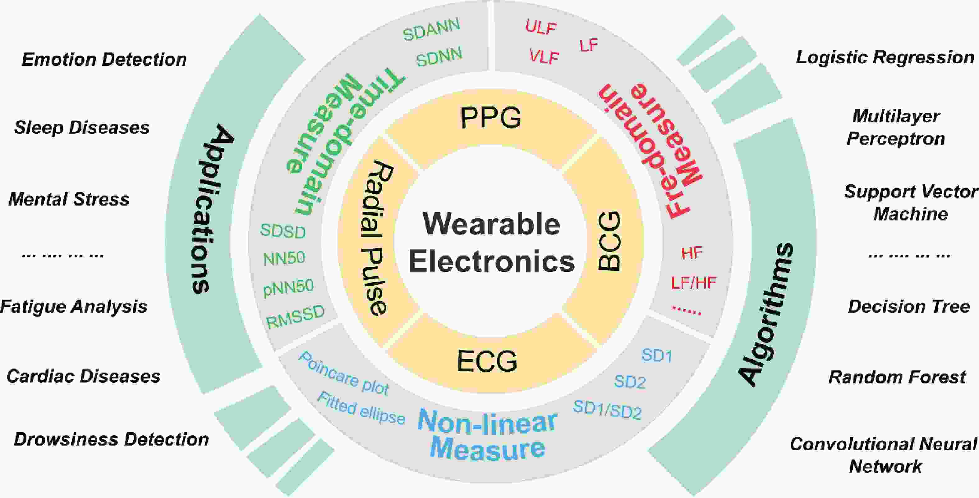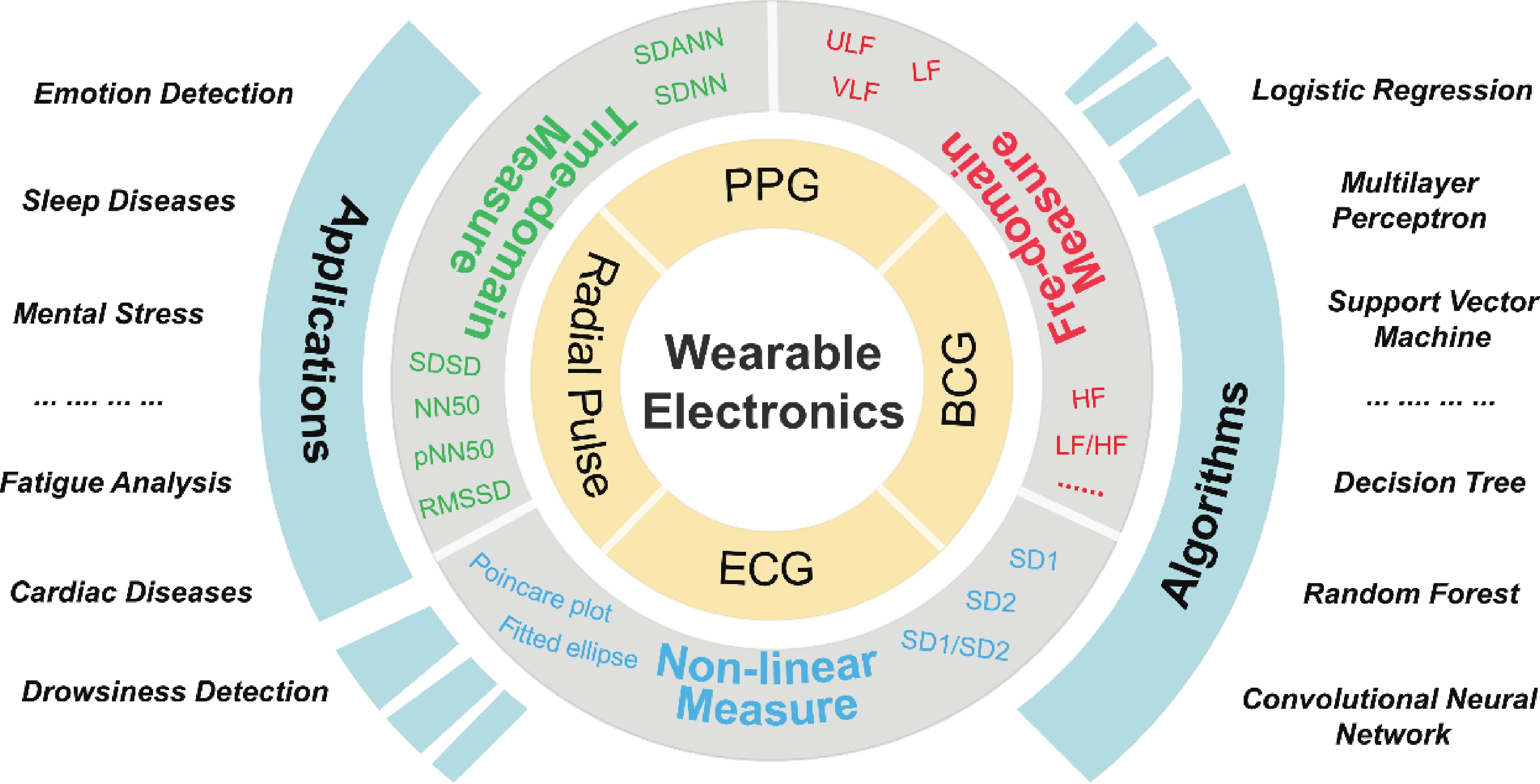 Heart rate variability (HRV) that can reflect the dynamic balance between the sympathetic nervous and parasympathetic nervous of human autonomic nervous system (ANS) has attracted considerable attention. However, traditional electrocardiogram (ECG) devices for HRV analysis are bulky, and hard wires are needed to attach measuring electrodes to the chest, resulting in the poor wearable experience during the long-term measurement. Compared with that, wearable electronics enabling continuously cardiac signals monitoring and HRV assessment provide a desirable and promising approach for helping subjects determine sleeping issues, cardiovascular diseases, or other threats to physical and mental well-being. Until now, significant progress and advances have been achieved in wearable electronics for HRV monitoring and applications for predicting human physical and mental well-being. In this review, the latest progress in the integration of wearable electronics and HRV analysis as well as practical applications in assessment of human physical and mental health are included. The commonly used methods and physiological signals for HRV analysis are briefly summarized. Furthermore, we highlighted the research on wearable electronics concerning HRV assessment and diverse applications such as stress estimation, drowsiness detection, etc. Lastly, the current limitations of the integrated wearable HRV system are concluded, and possible solutions in such a research direction are outlined.