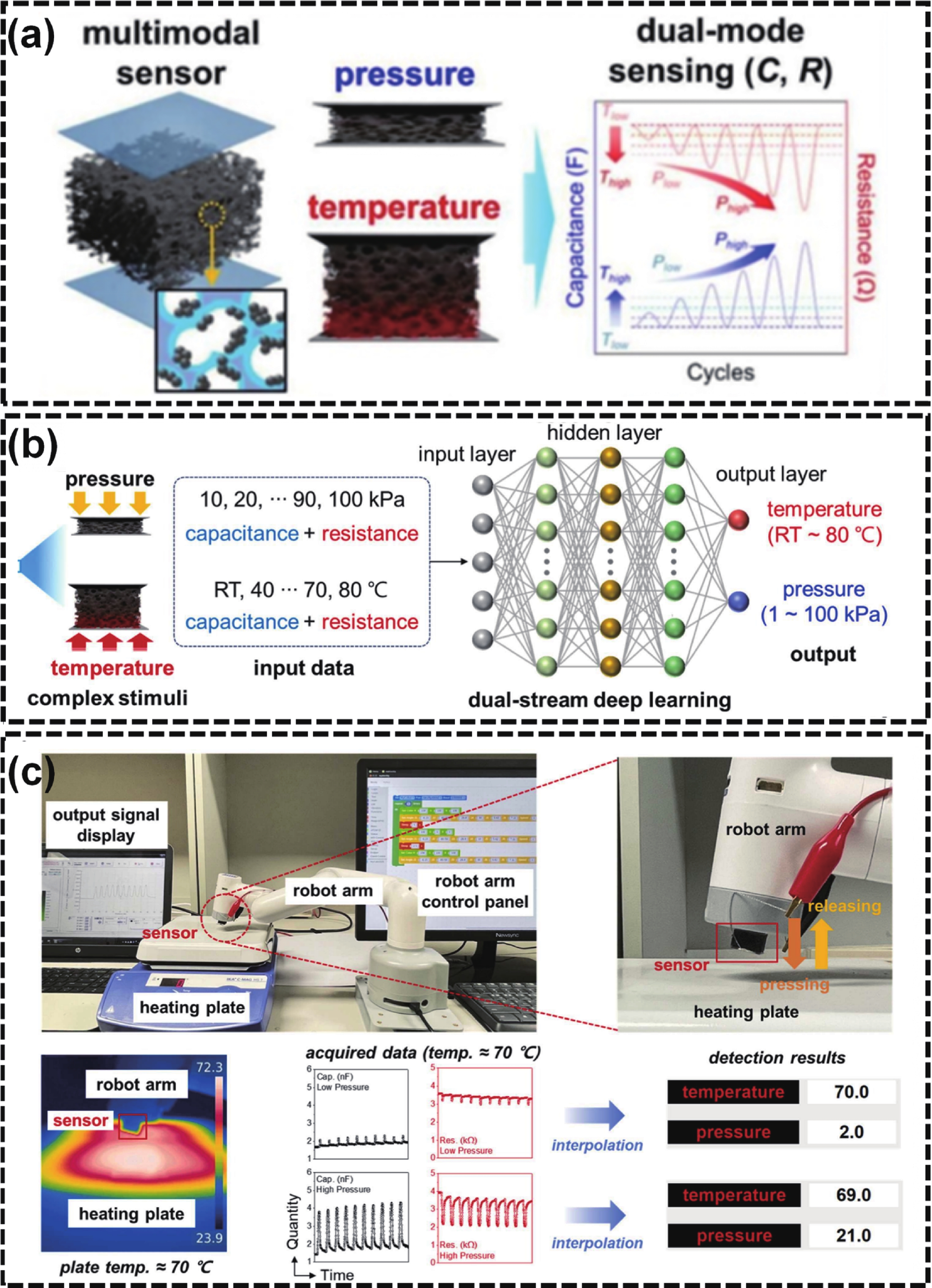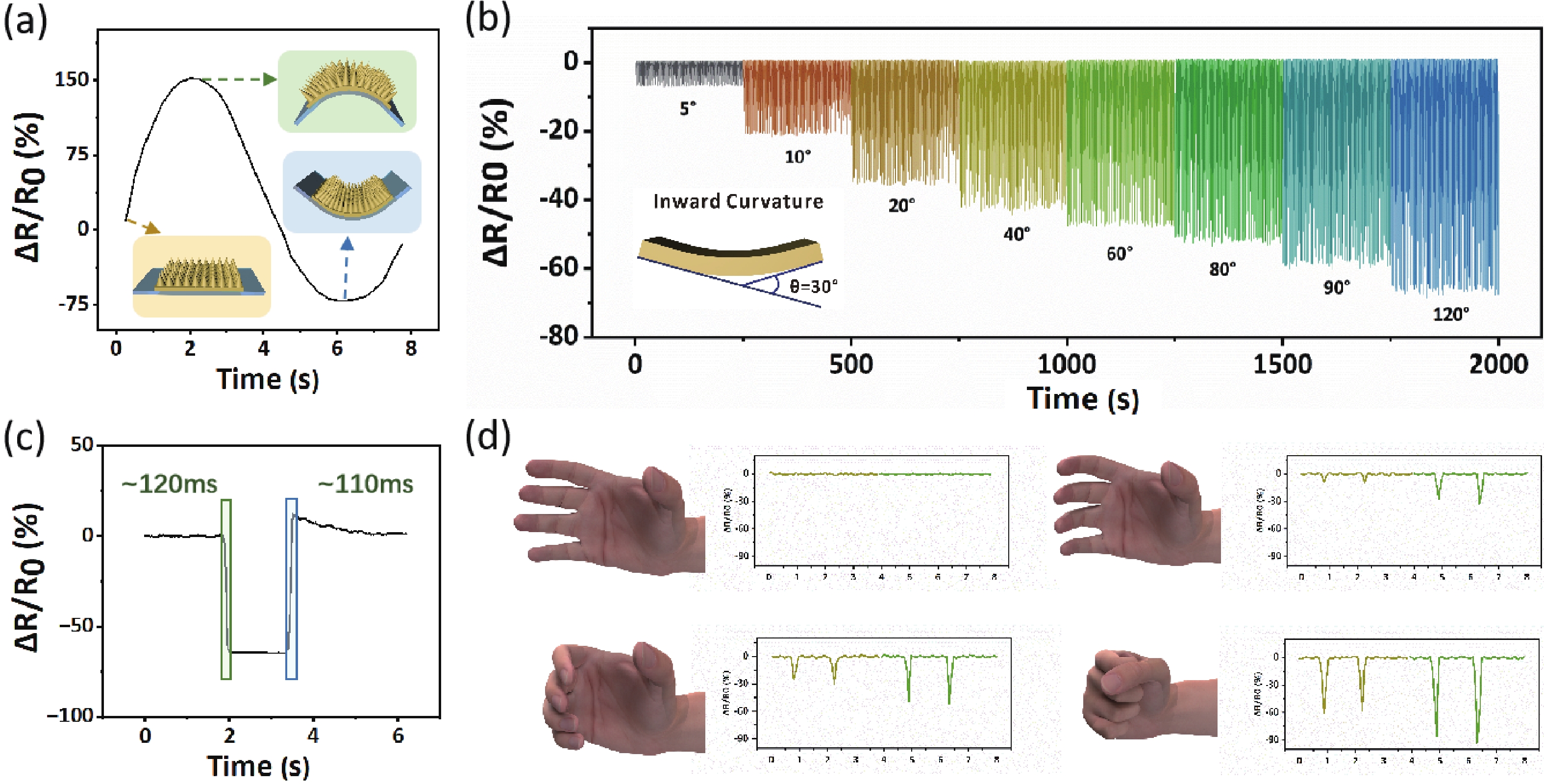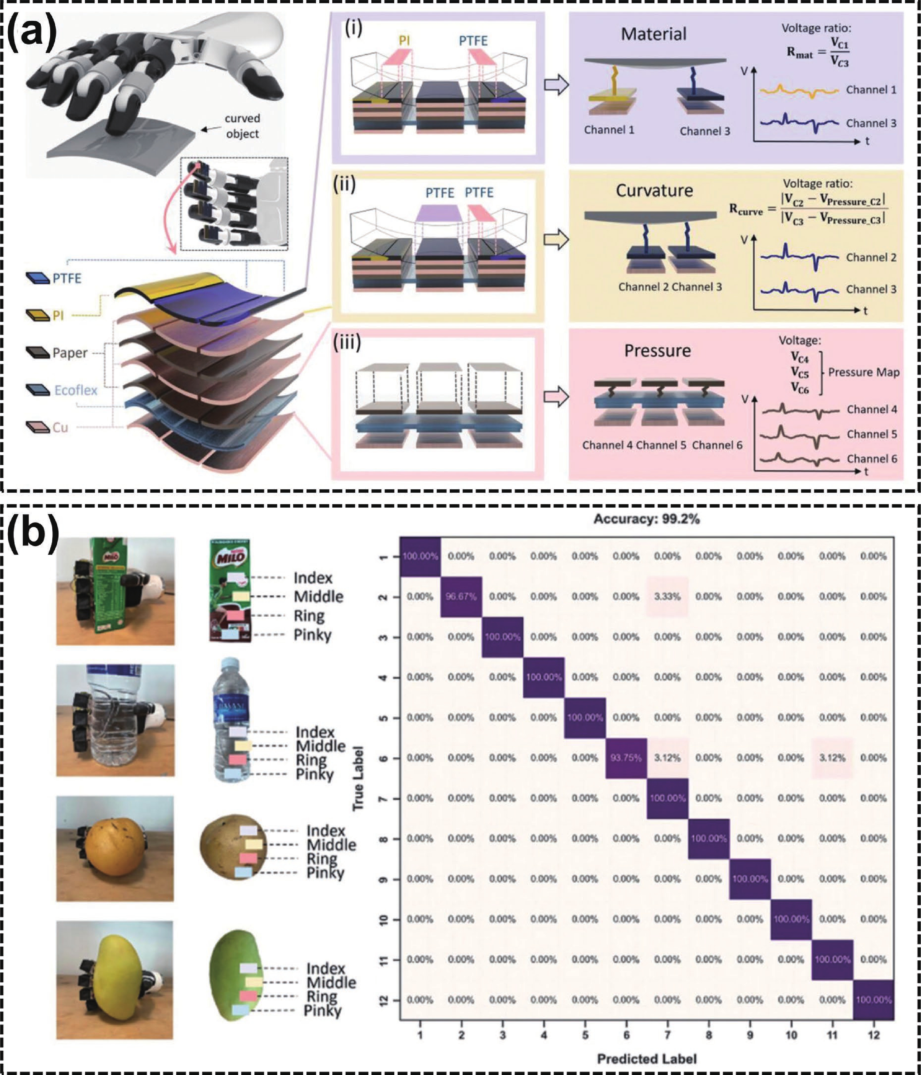In the era of Metaverse and virtual reality (VR)/augmented reality (AR), capturing finger motion and force interactions is crucial for immersive human-machine interfaces. This study introduces a flexible electronic skin for the index finger, addressing coupled perception of both state and process in dynamic tactile sensing. The device integrates resistive and giant magnetoelastic sensors, enabling detection of surface pressure and finger joint bending. This e-skin identifies three phases of finger action: bending state, dynamic normal force and tangential force (sweeping). The system comprises resistive carbon nanotubes (CNT)/polydimethylsiloxane (PDMS) films for bending sensing and magnetoelastic sensors (NdFeB particles, EcoFlex, and flexible coils) for pressure detection. The inward bending resistive sensor, based on self-assembled microstructures, exhibits directional specificity with a response time under 120 ms and bending sensitivity from 0° to 120°. The magnetoelastic sensors demonstrate specific responses to frequency and deformation magnitude, as well as sensitivity to surface roughness during sliding and material hardness. The system’s capability is demonstrated through tactile-based bread type and condition recognition, achieving 92% accuracy. This intelligent patch shows broad potential in enhancing interactions across various fields, from VR/AR interfaces and medical diagnostics to smart manufacturing and industrial automation.