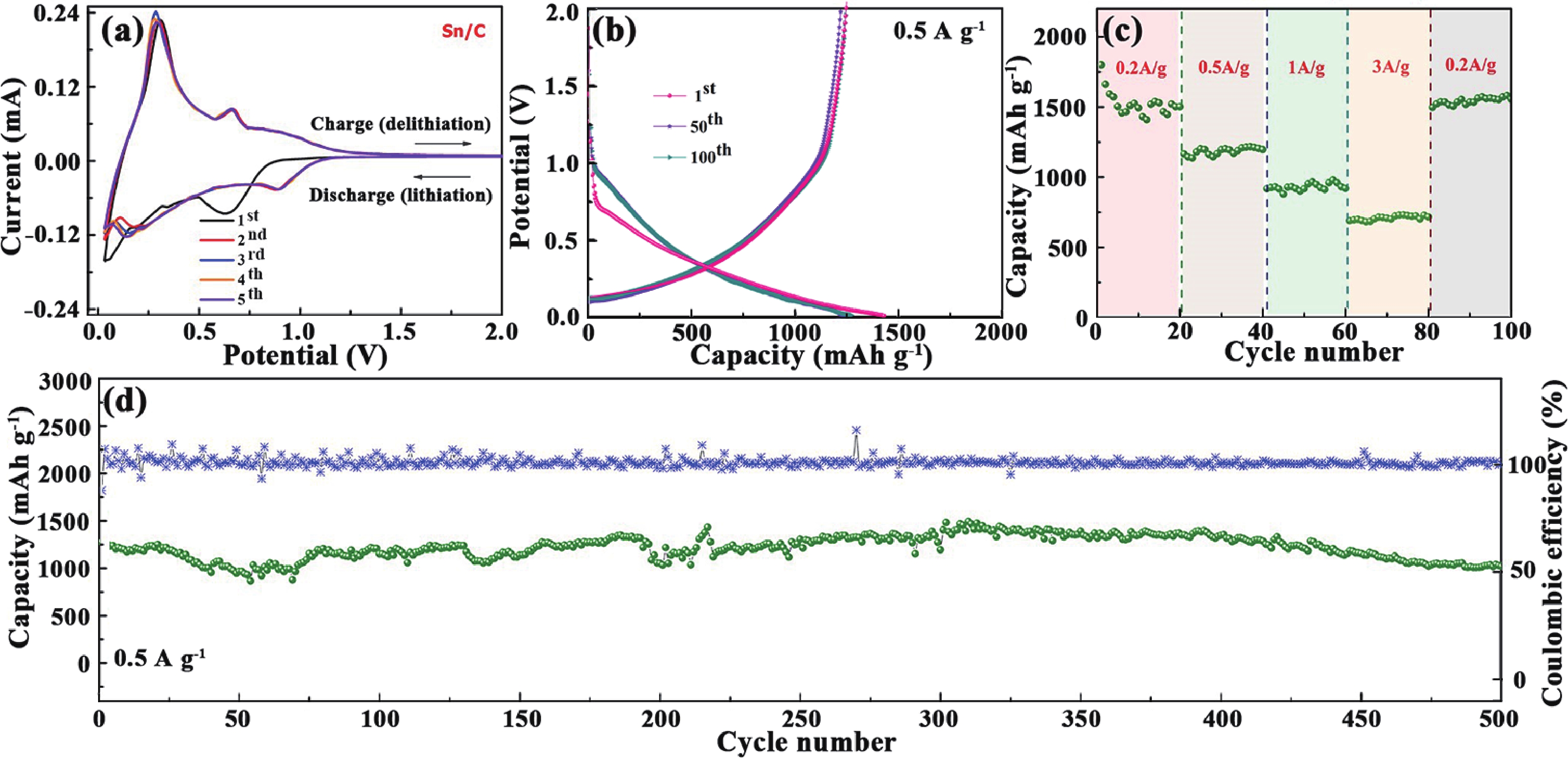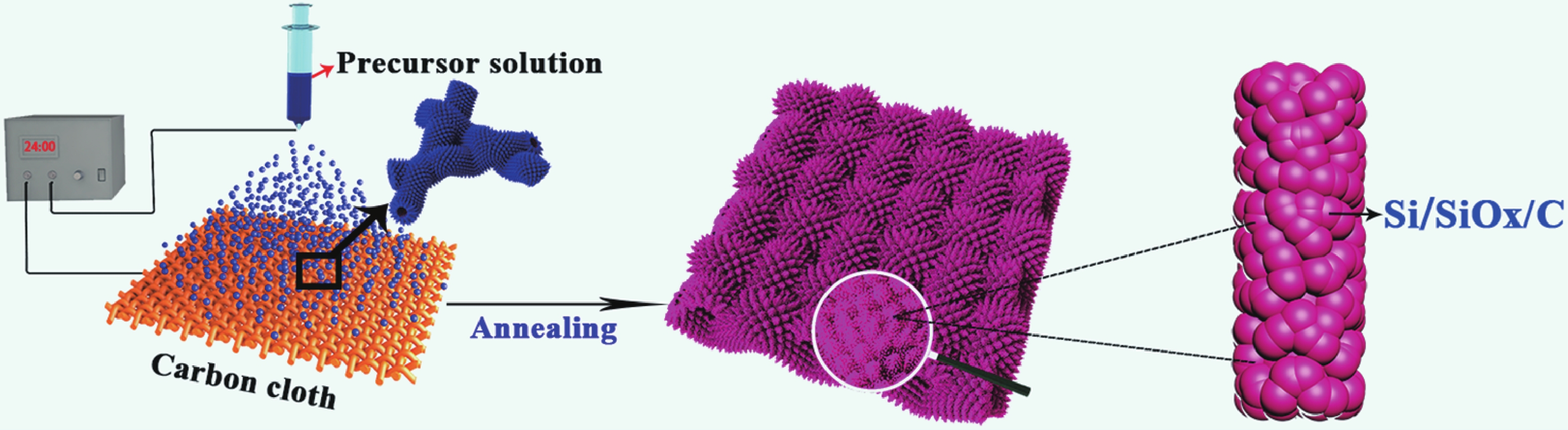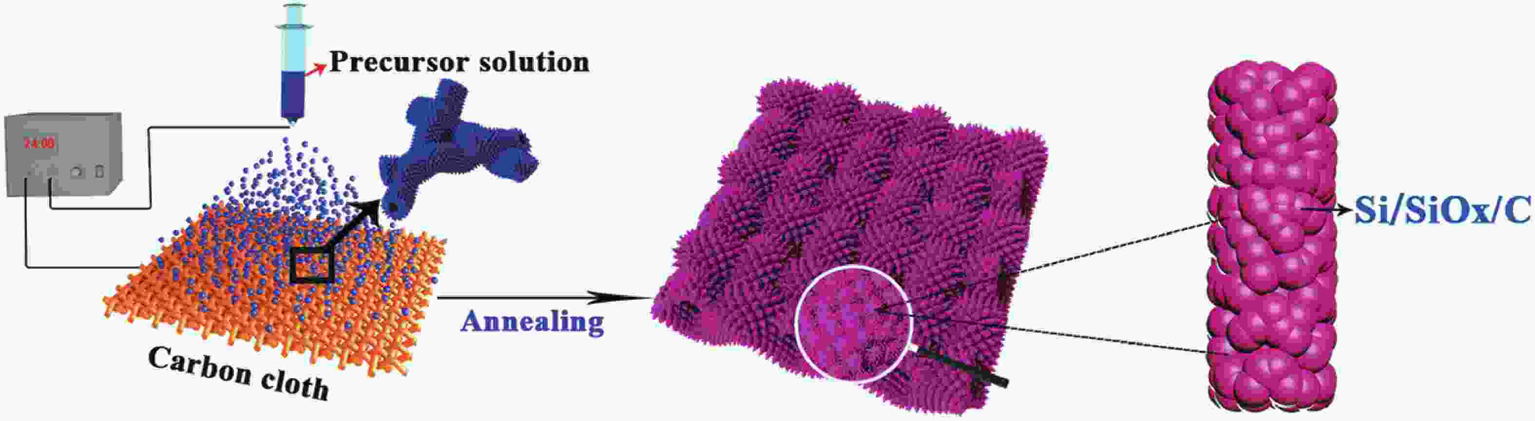 Exploring electrode materials with larger capacity, higher power density and longer cycle life was critical for developing advanced flexible lithium-ion batteries (LIBs). Herein, we used a controlled two-step method including electrospraying followed with calcination treatment by CVD furnace to design novel electrodes of Si/Six/C and Sn/C microrods array consisting of nanospheres on flexible carbon cloth substrate (denoted as Si/Six/C@CC, Sn/C@CC). Microrods composed of cumulated nanospheres (the diameter was approximately 120 nm) had a mean diameter of approximately 1.5 μm and a length of around 4.0 μm, distributing uniformly along the entire woven carbon fibers. Both of Si/Si/Six/C@CC and Sn/C@CC products were synthesized as binder-free anodes for Li-ion battery with the features of high reversible capacity and excellent cycling. Especially Si/Six/C electrode exhibited high specific capacity of about 1750 mA?h?g?1 at 0.5 A?g?1 and excellent cycling ability even after 1050 cycles with a capacity of 1388 mA?h?g?1. Highly flexible Si/Six/C@CC//LiCoO2 batteries based on liquid and solid electrolytes were also fabricated, exhibiting high flexibility, excellent electrical stability and potential applications in flexible wearable electronics.