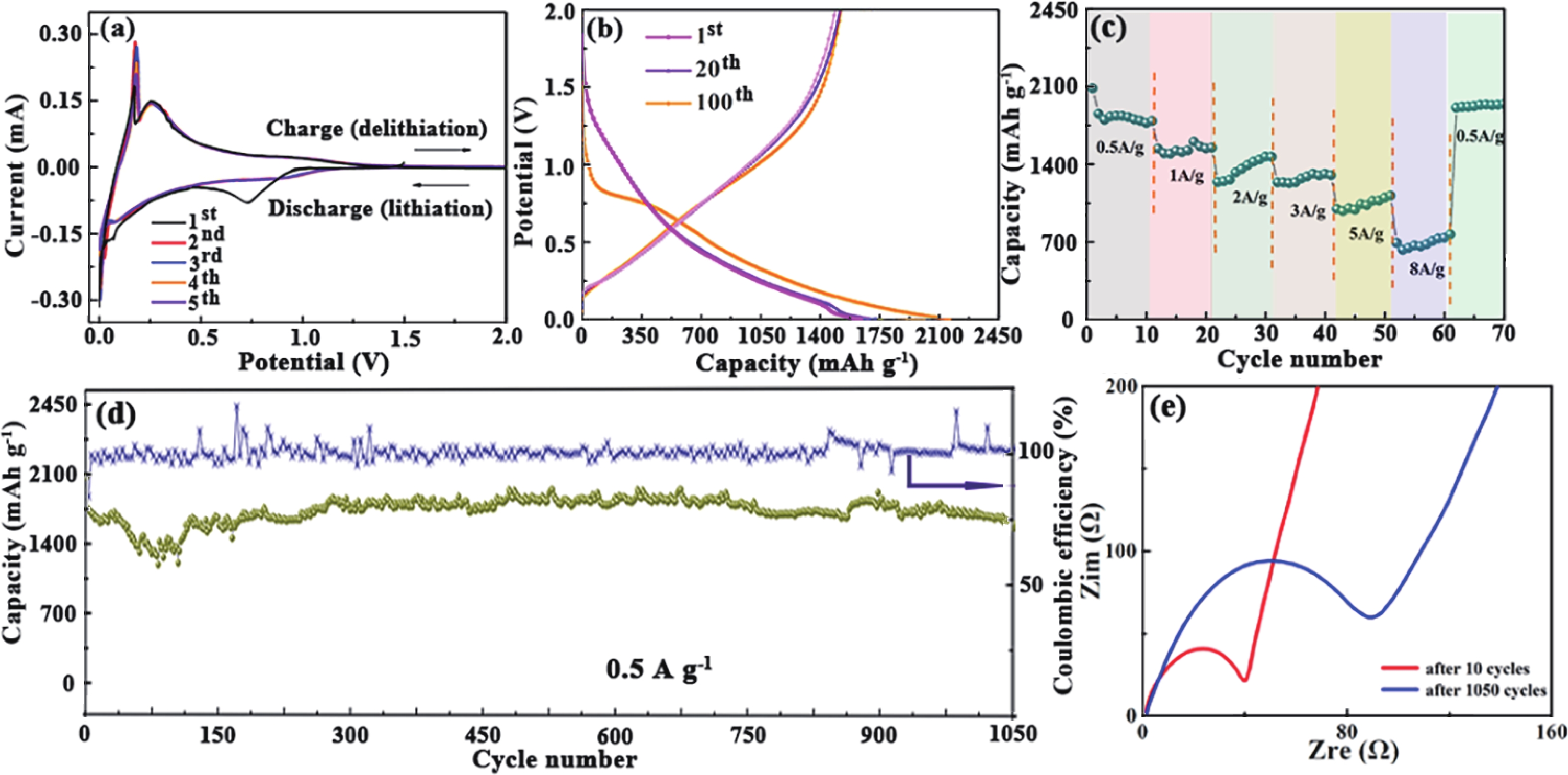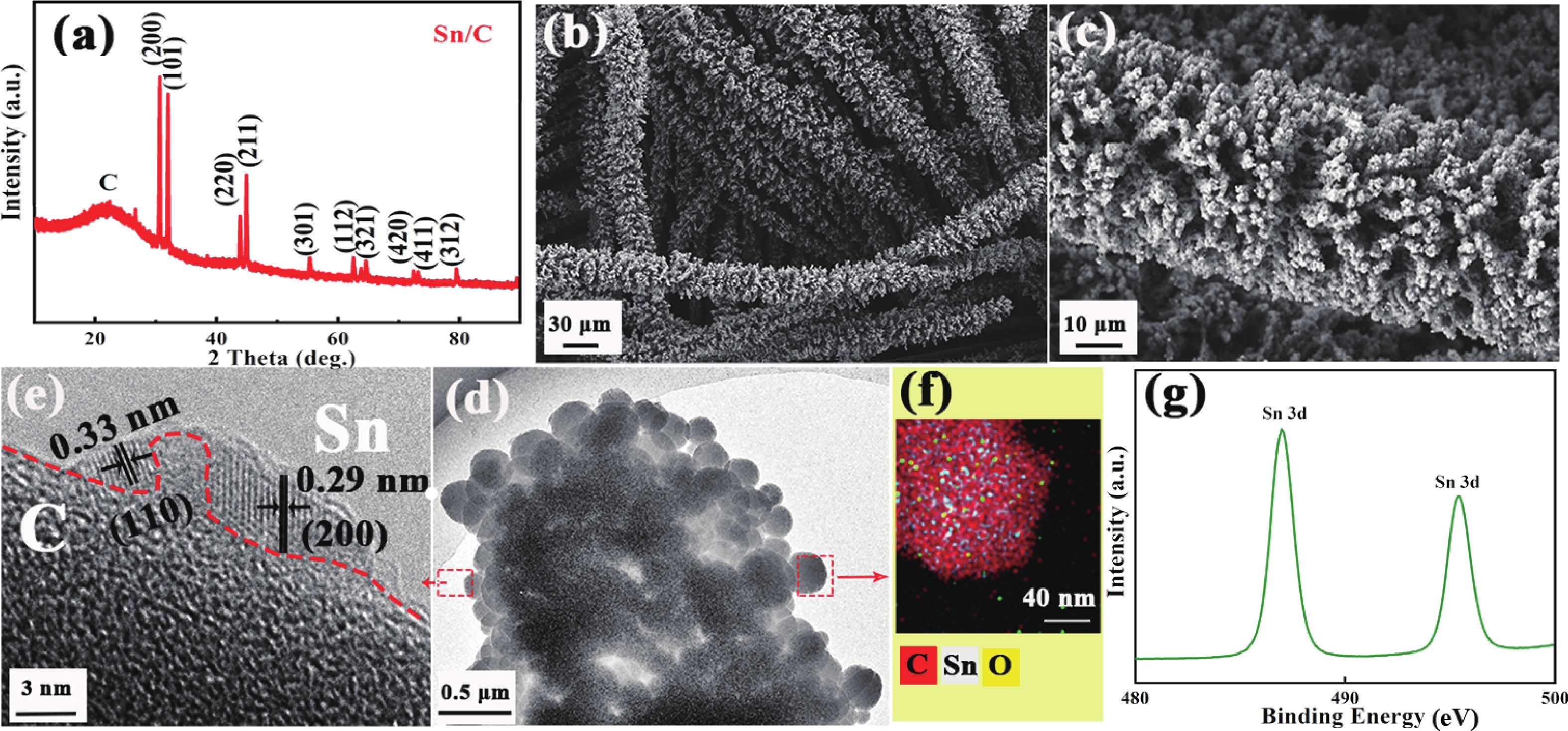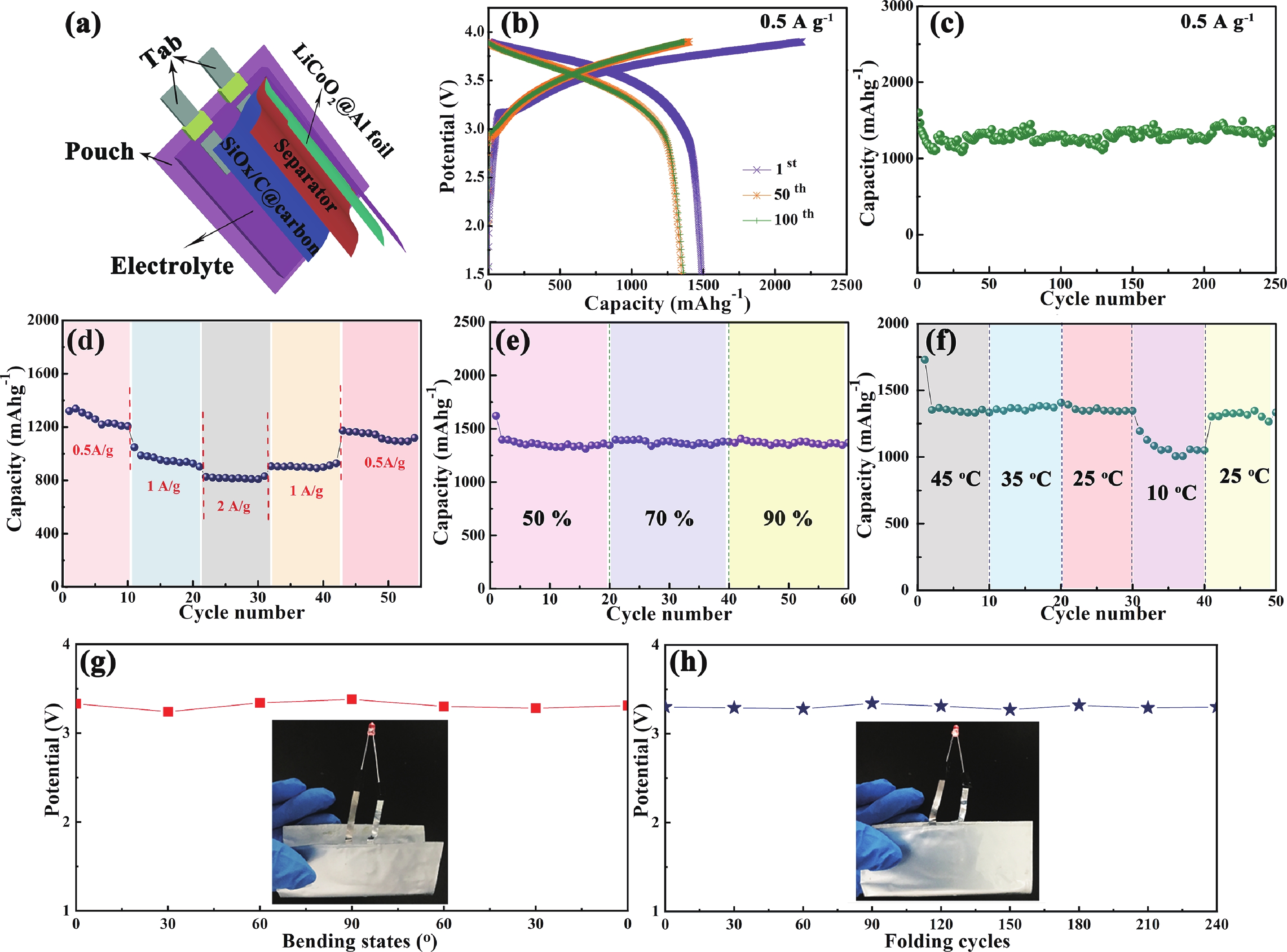 Exploring electrode materials with larger capacity, higher power density and longer cycle life was critical for developing advanced flexible lithium-ion batteries (LIBs). Herein, we used a controlled two-step method including electrospraying followed with calcination treatment by CVD furnace to design novel electrodes of Si/Six/C and Sn/C microrods array consisting of nanospheres on flexible carbon cloth substrate (denoted as Si/Six/C@CC, Sn/C@CC). Microrods composed of cumulated nanospheres (the diameter was approximately 120 nm) had a mean diameter of approximately 1.5 μm and a length of around 4.0 μm, distributing uniformly along the entire woven carbon fibers. Both of Si/Si/Six/C@CC and Sn/C@CC products were synthesized as binder-free anodes for Li-ion battery with the features of high reversible capacity and excellent cycling. Especially Si/Six/C electrode exhibited high specific capacity of about 1750 mA?h?g?1 at 0.5 A?g?1 and excellent cycling ability even after 1050 cycles with a capacity of 1388 mA?h?g?1. Highly flexible Si/Six/C@CC//LiCoO2 batteries based on liquid and solid electrolytes were also fabricated, exhibiting high flexibility, excellent electrical stability and potential applications in flexible wearable electronics.