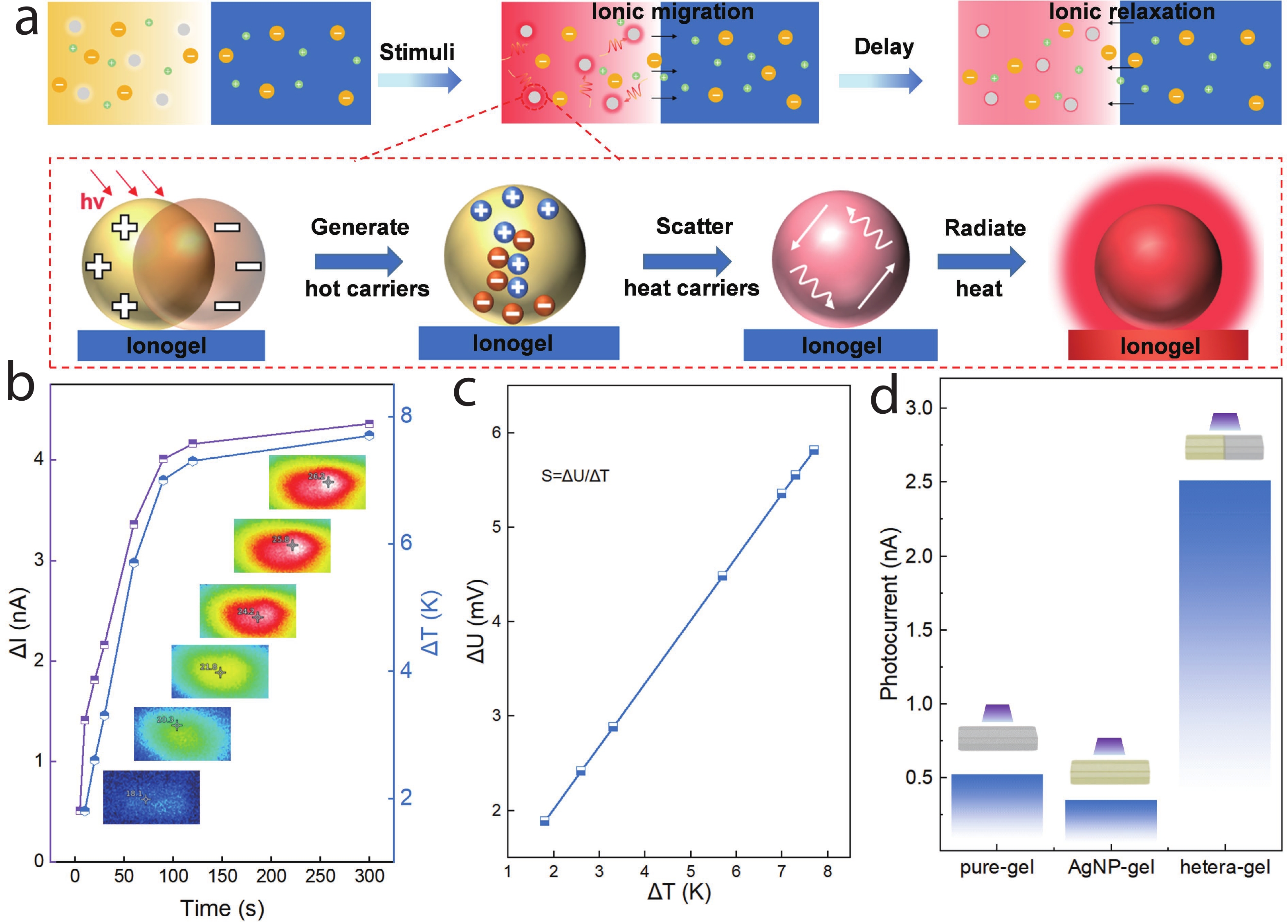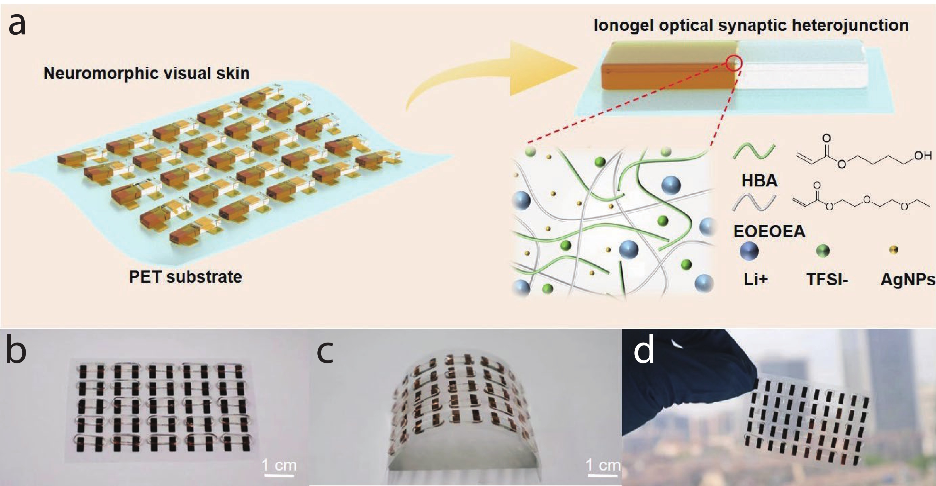 Artificial skin should embody a softly functional film that is capable of self-powering, healing and sensing with neuromorphic processing. However, the pursuit of a bionic skin that combines high flexibility, self-healability, and zero-powered photosynaptic functionality remains elusive. In this study, we report a self-powered and self-healable neuromorphic vision skin, featuring silver nanoparticle-doped ionogel heterostructure as photoacceptor. The localized surface plasmon resonance induced by light in the nanoparticles triggers temperature fluctuations within the heterojunction, facilitating ion migration for visual sensing with synaptic behaviors. The abundant reversible hydrogen bonds in the ionogel endow the skin with remarkable mechanical flexibility and self-healing properties. We assembled a neuromorphic visual skin equipped with a 5 × 5 photosynapse array, capable of sensing and memorizing diverse light patterns.