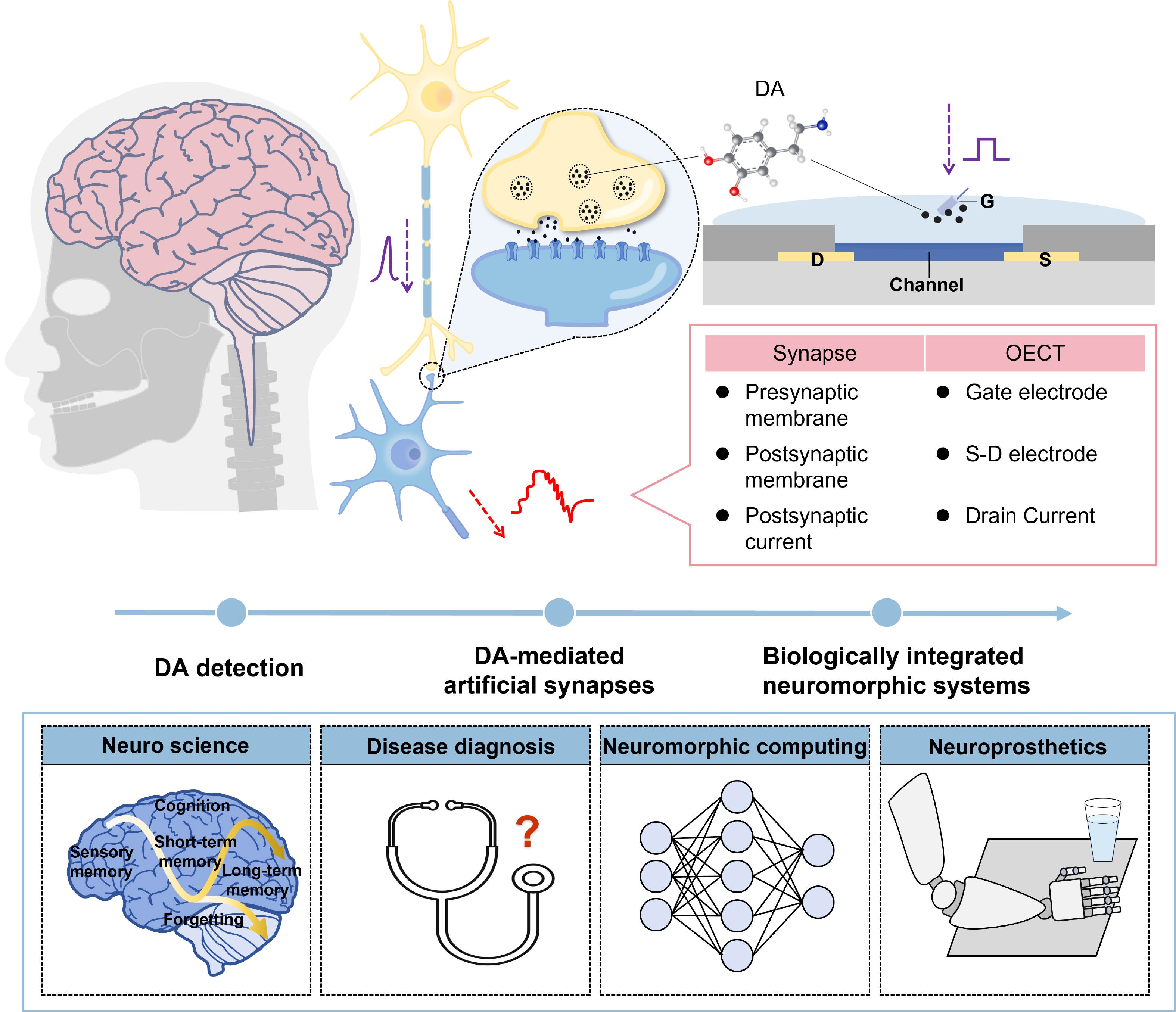 Organic electrochemical transistors have emerged as a solution for artificial synapses that mimic the neural functions of the brain structure, holding great potentials to break the bottleneck of von Neumann architectures. However, current artificial synapses rely primarily on electrical signals, and little attention has been paid to the vital role of neurotransmitter-mediated artificial synapses. Dopamine is a key neurotransmitter associated with emotion regulation and cognitive processes that needs to be monitored in real time to advance the development of disease diagnostics and neuroscience. To provide insights into the development of artificial synapses with neurotransmitter involvement, this review proposes three steps towards future biomimic and bioinspired neuromorphic systems. We first summarize OECT-based dopamine detection devices, and then review advances in neurotransmitter-mediated artificial synapses and resultant advanced neuromorphic systems. Finally, by exploring the challenges and opportunities related to such neuromorphic systems, we provide a perspective on the future development of biomimetic and bioinspired neuromorphic systems.