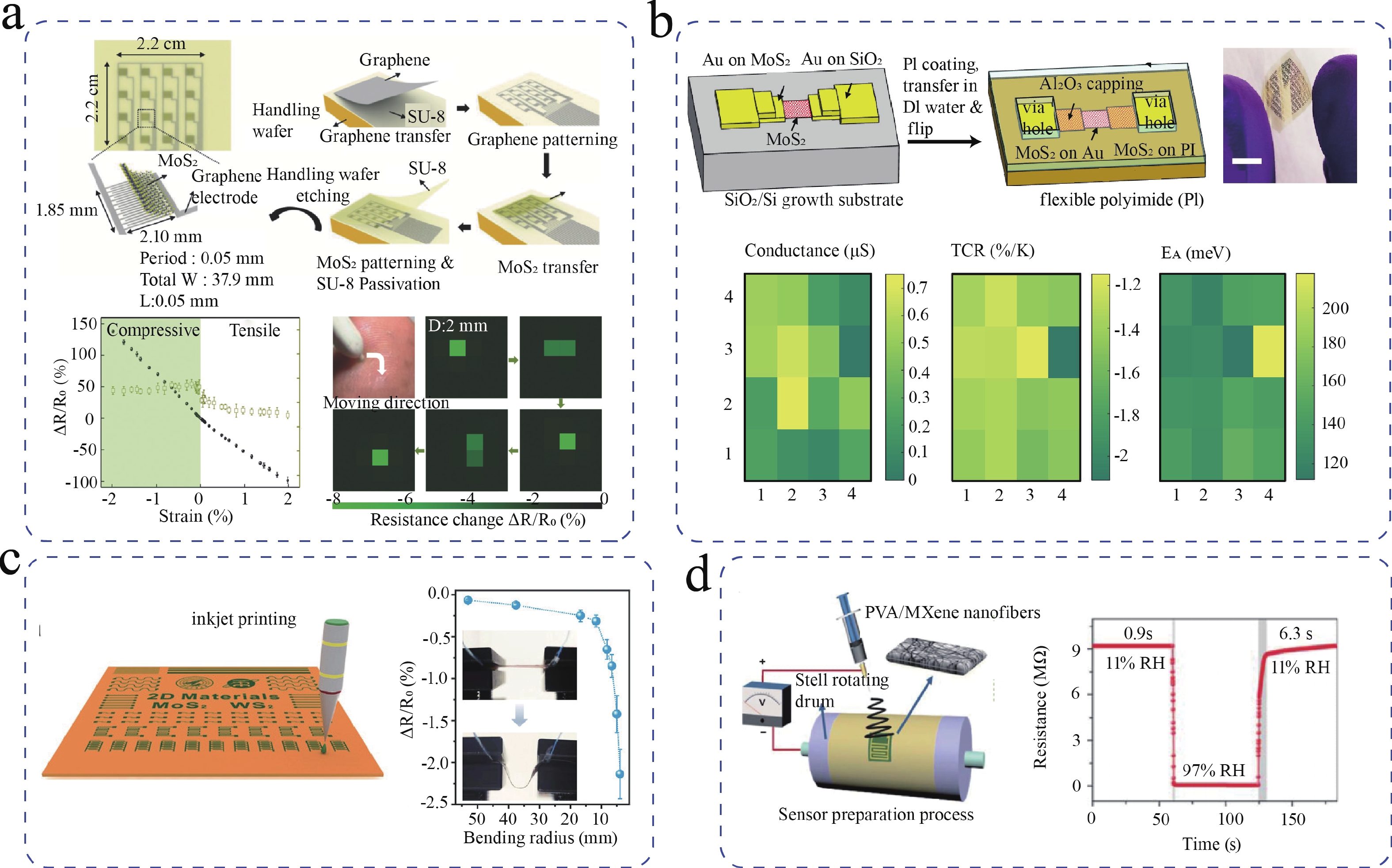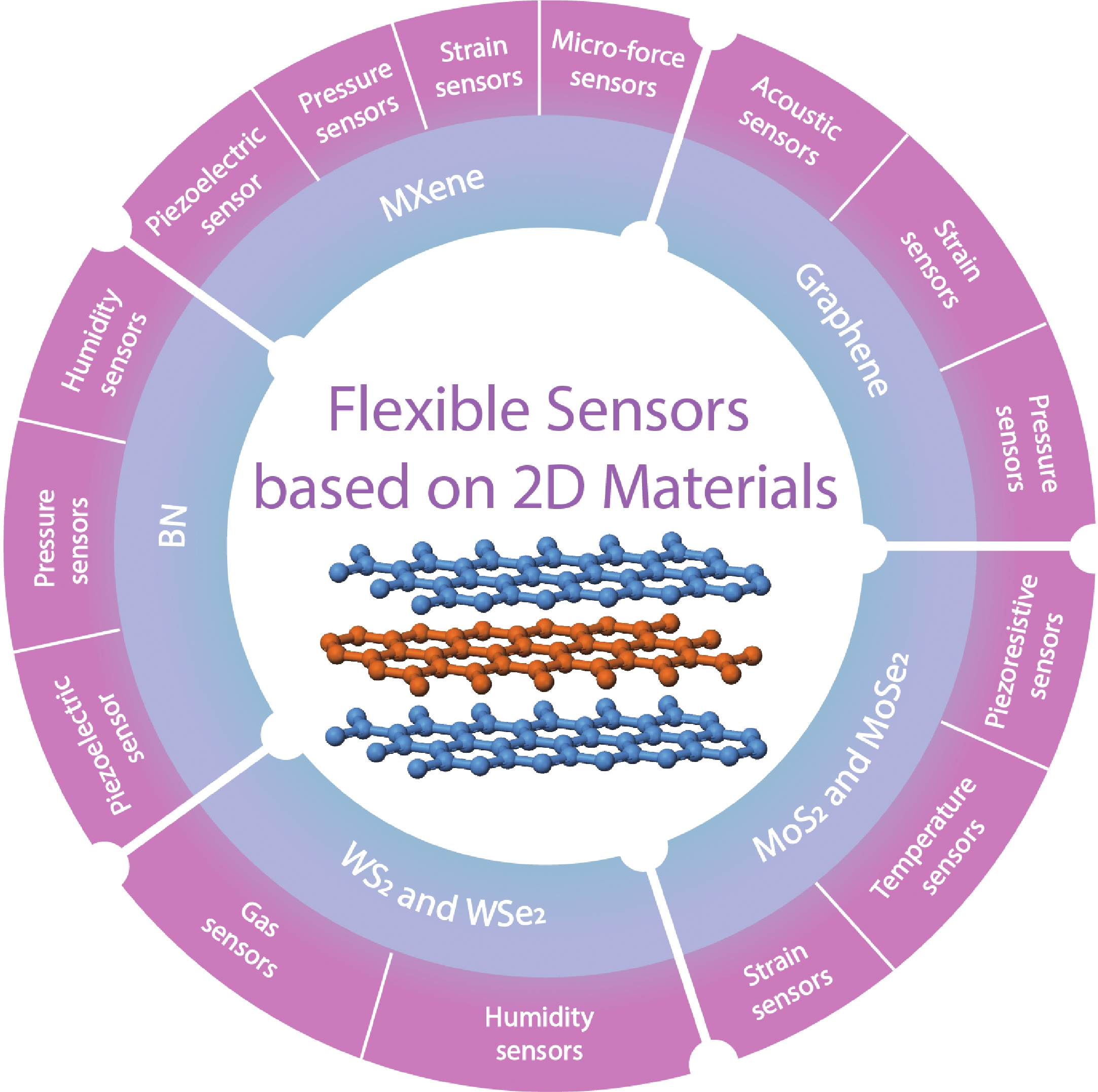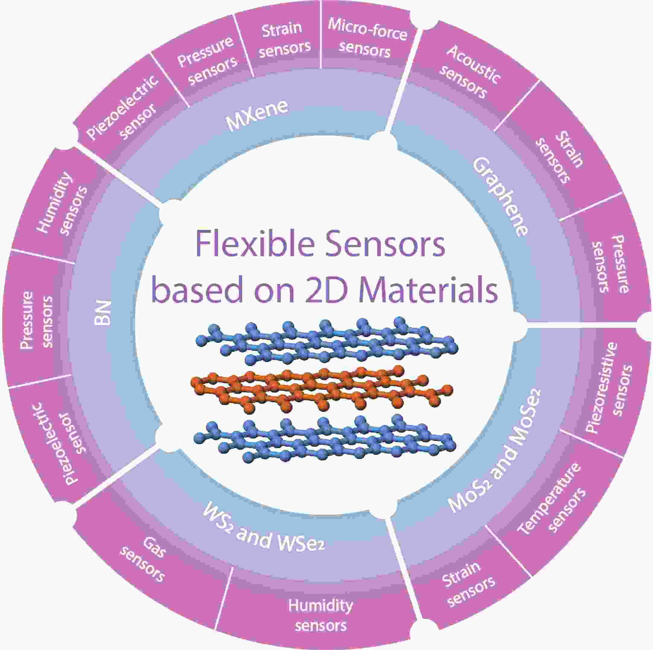 With the rapid development of the internet of things (IoT) and wearable electronics, the role of flexible sensors is becoming increasingly irreplaceable, due to their ability to process and convert information acquisition. Two-dimensional (2D) materials have been widely welcomed by researchers as sensitive layers, which broadens the range and application of flexible sensors due to the advantages of their large specific surface area, tunable energy bands, controllable thickness at the atomic level, stable mechanical properties, and excellent optoelectronic properties. This review focuses on five different types of 2D materials for monitoring pressure, humidity, sound, gas, and so on, to realize the recognition and conversion of human body and environmental signals. Meanwhile, the main problems and possible solutions of flexible sensors based on 2D materials as sensitive layers are summarized.