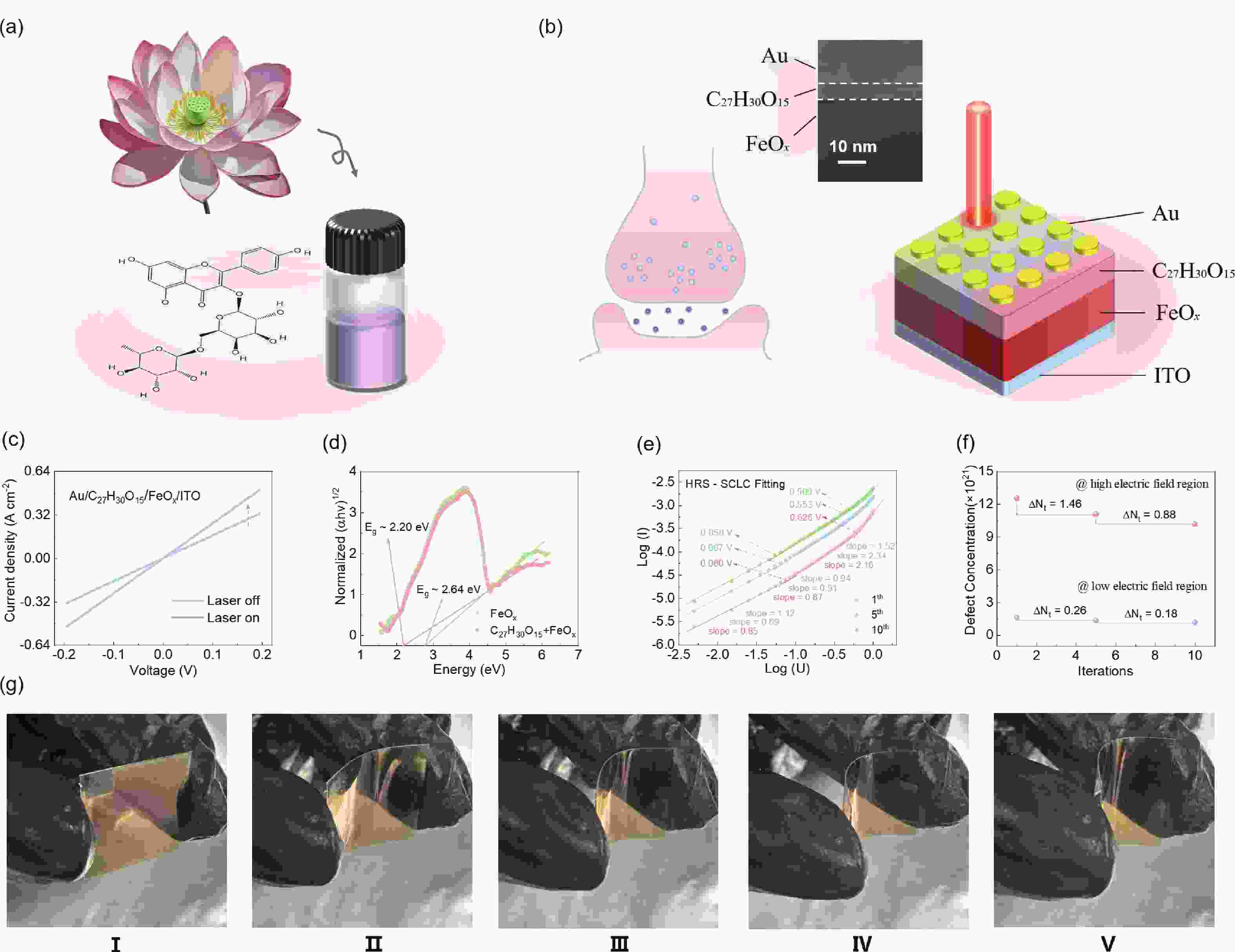 With the advancement of artificial intelligence, optic in-sensing reservoir computing based on emerging semiconductor devices is high desirable for real-time analog signal processing. Here, we disclose a flexible optomemristor based on C27H30O15/FeOx heterostructure that presents a highly sensitive to the light stimuli and artificial optic synaptic features such as short- and long-term plasticity (STP and LTP), enabling the developed optomemristor to implement complex analogy signal processing through building a real-physical dynamic-based in-sensing reservoir computing algorithm and yielding an accuracy of 94.88% for speech recognition. The charge trapping and detrapping mediated by the optic active layer of C27H30O15 that is extracted from the lotus flower is response for the positive photoconductance memory in the prepared optomemristor. This work provides a feasible organic?inorganic heterostructure as well as an optic in-sensing vision computing for an advanced optic computing system in future complex signal processing.