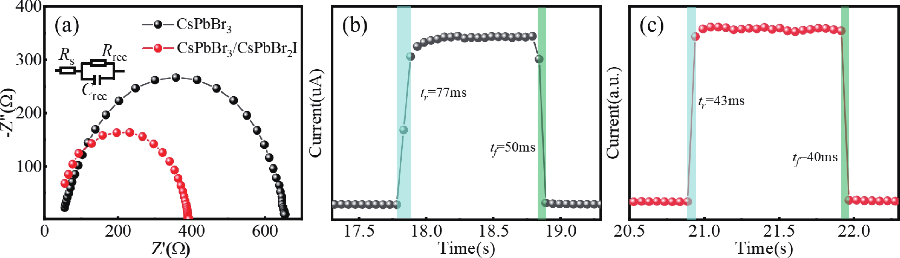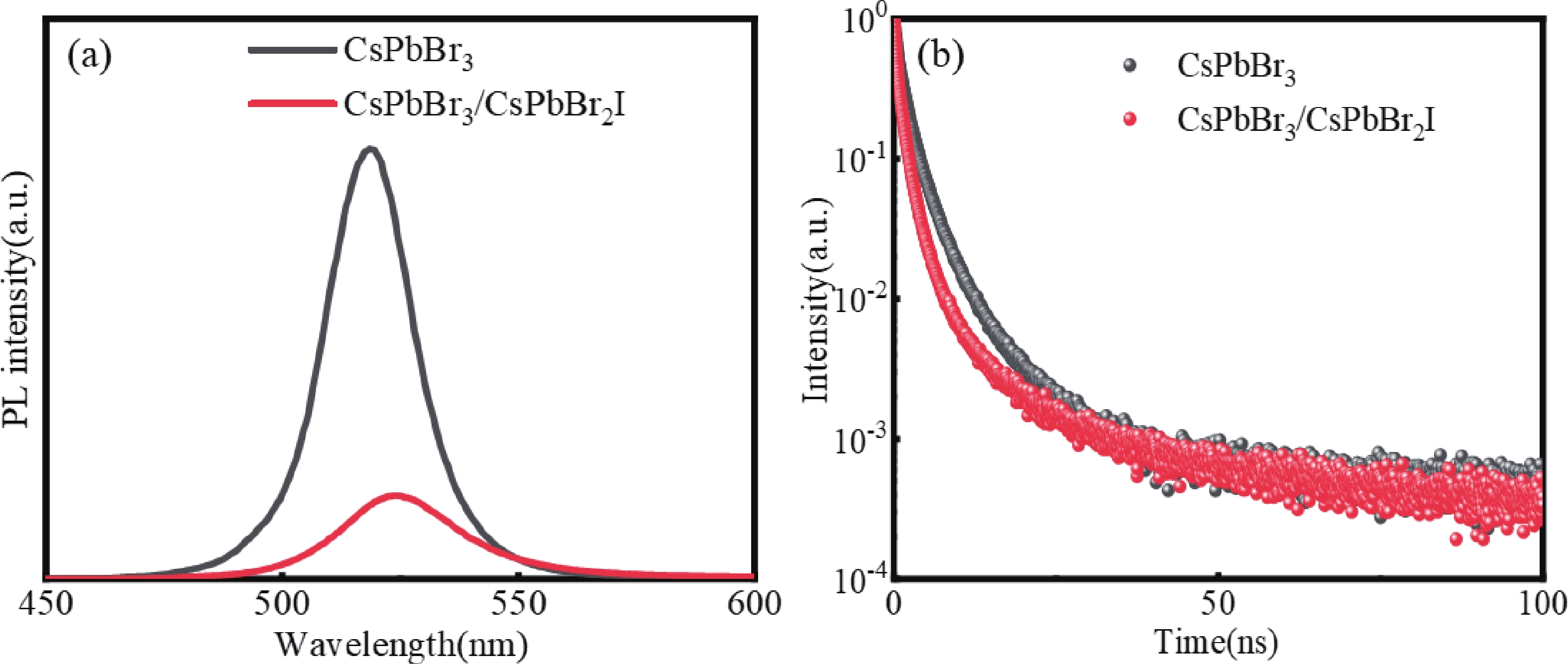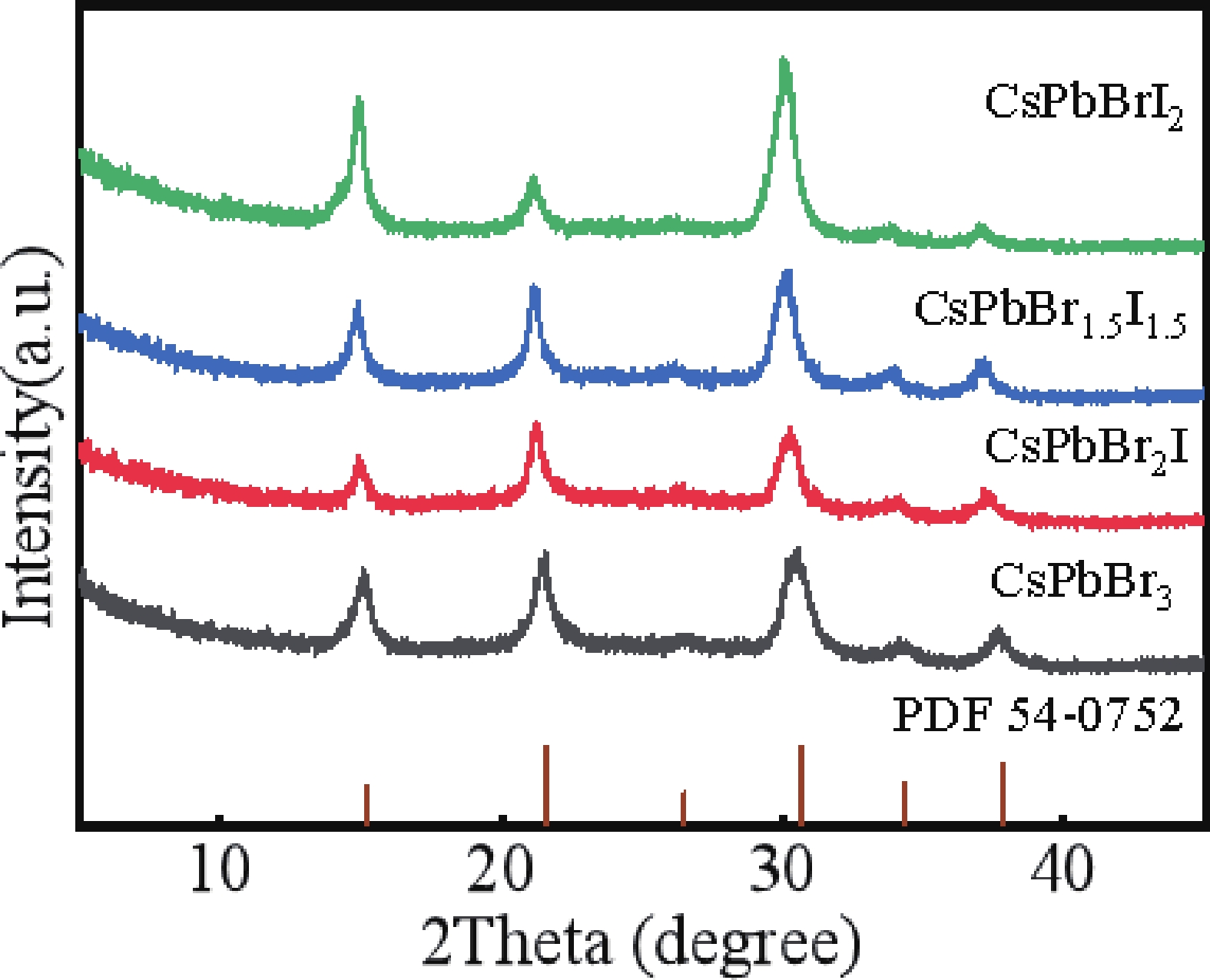 All-inorganic CsPbBr3 perovskite quantum dots (QDs) have attracted extensive attention in photoelectric detection for their excellent photoelectric properties and stability. However, the CsPbBr3 quantum dot film exhibits a high non-radiative recombination rate, and the mismatch in energy levels with the carbon electrode weakens hole extraction efficiency. These reduces the device's performance. To improve this, a semiconductor photodetector based on fluorine-doped tin oxide (FTO)/dense titanium dioxide (c-TiO2)/mesoporous titanium dioxide (m-TiO2)/CsPbBr3 QDs/CsPbBrxI3–x (x = 2, 1.5, 1) QDs/C structure was studied. By adjusting the Br– : I– ratio, the synthesized CsPbBrxI3–x (x = 2, 1.5, 1) QDs showed an adjustable band gap width of 2.284?2.394 eV. And forming a type Ⅱ band structure with CsPbBr3 QDs, which reduced the valence band offset between the active layer and the carbon electrode, this promoted carrier extraction and reduced non-radiative recombination rate. Compared with the original device (the photosensitive layer is CsPbBr3 QDs), the performance of the photodetector based on the CsPbBr3 QDs/CsPbBr2I QDs heterostructure is significantly improved, the responsivity (R) increased by 73%, the specific detectivity rate (D*) increased from 6.98 × 1012 to 3.19 × 1013 Jones, the on/off ratio reached 106. This study provides a new idea for the development of semiconductor tandem detectors.