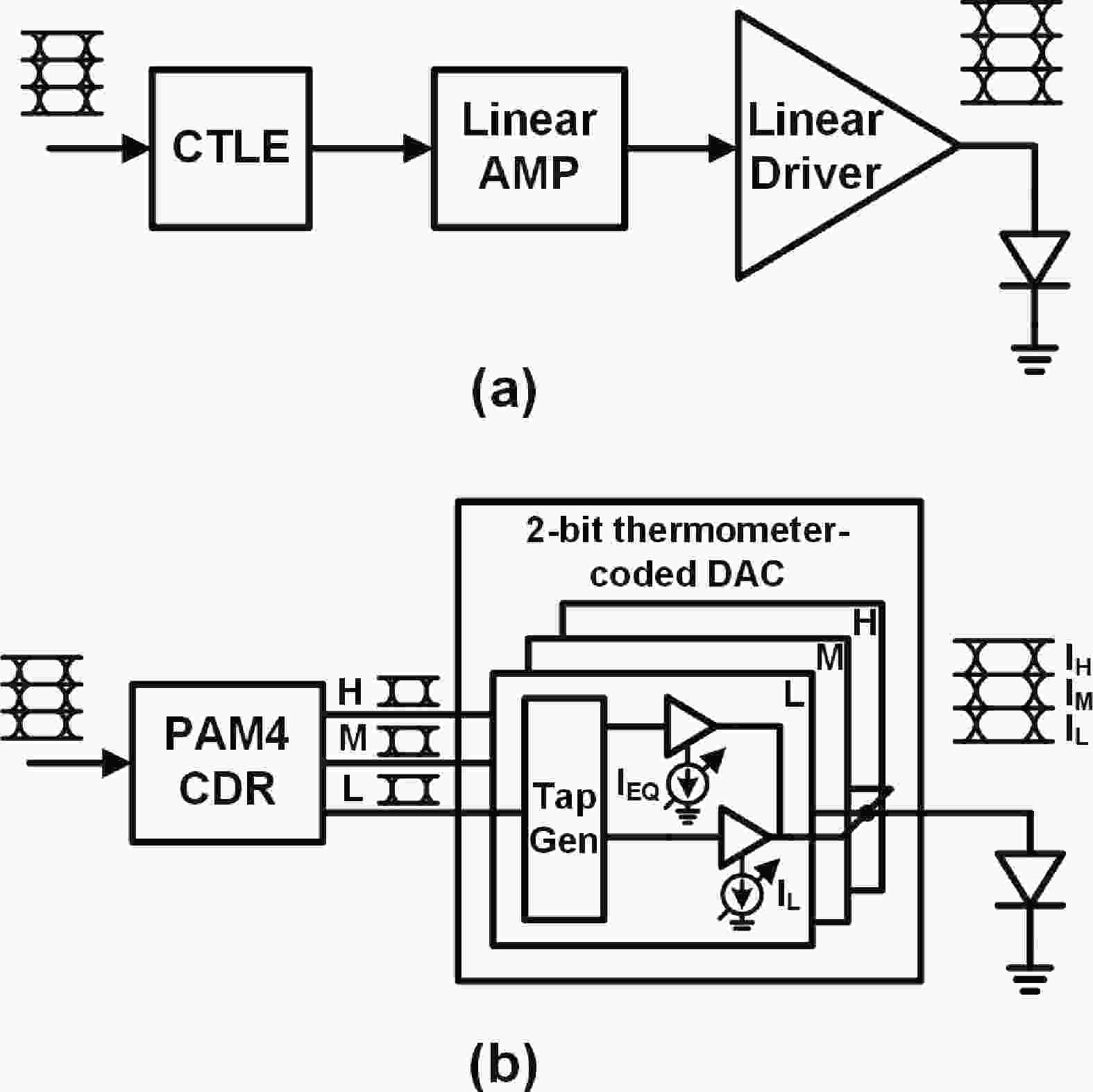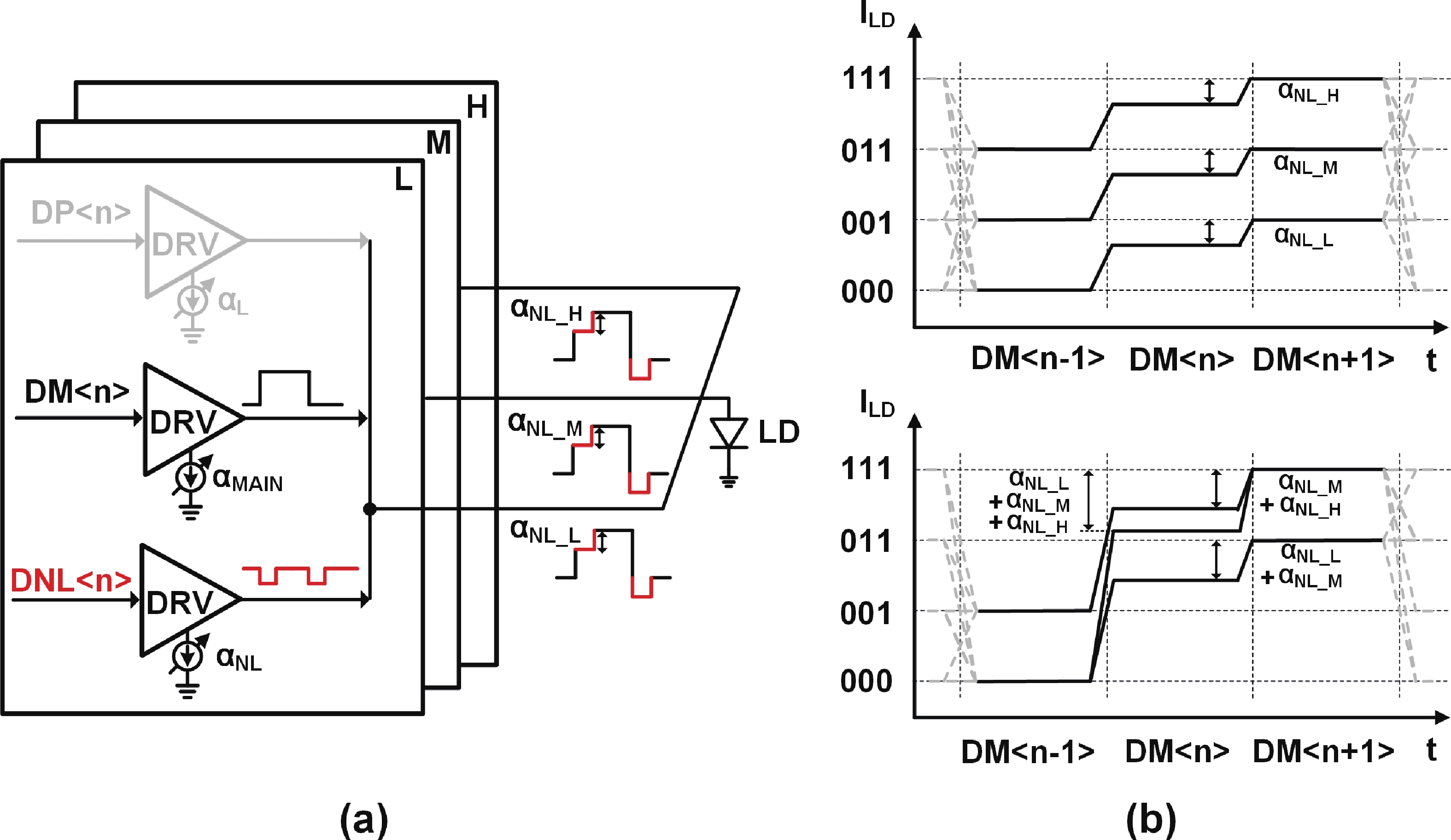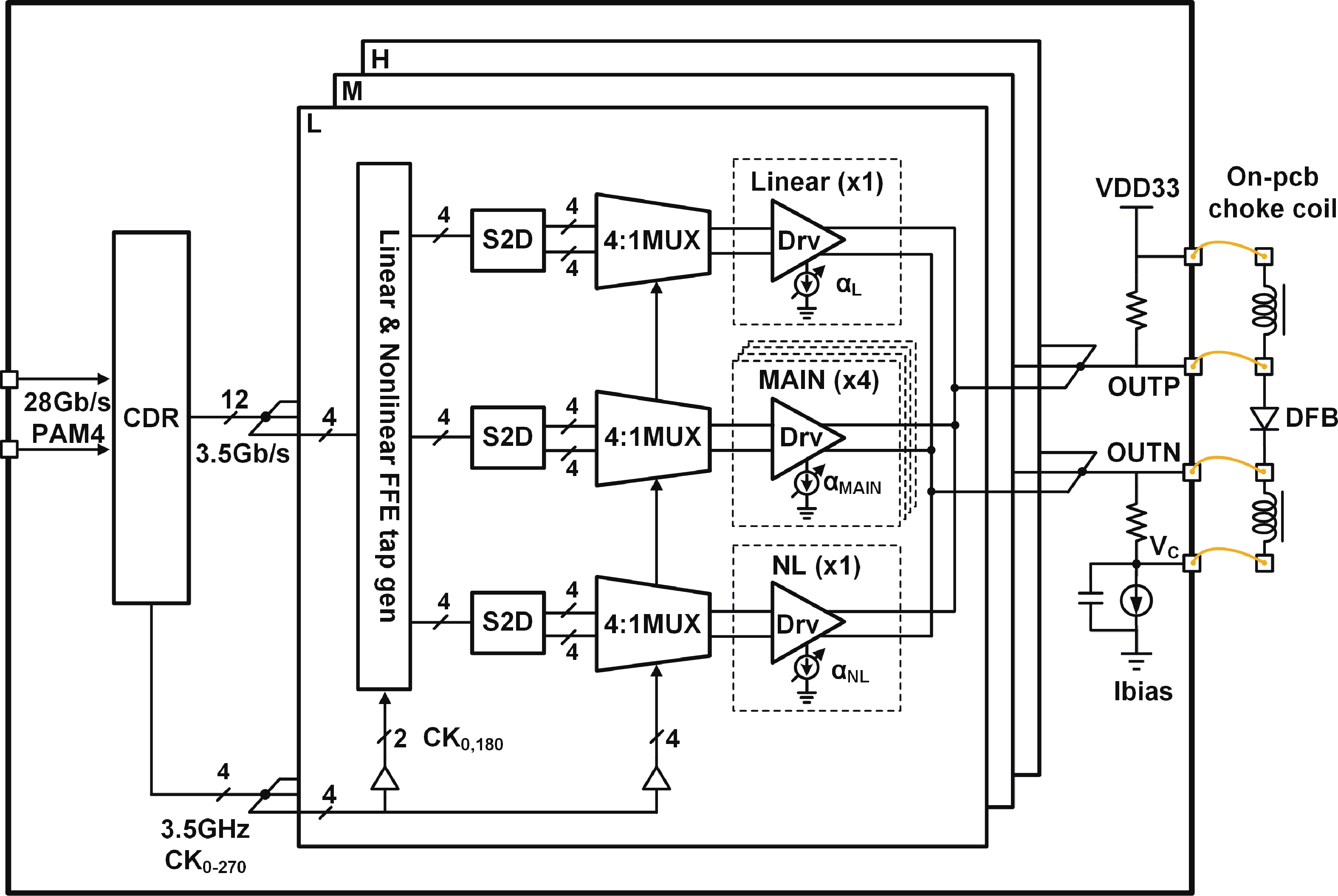 This paper presents a 4-level pulse amplitude modulation (PAM-4) distributed feedback (DFB) laser driver. The driver adopts a digital slicing architecture to achieve high linearity by adjusting the weights of three thermometer-coded main paths. An efficient-biased output stage structure is proposed to reduce power consumption while avoiding the degradation of output node bandwidth typically induced by parasitic capacitance in high-current bias path. A two-tap linear and nonlinear feed-forward equalizer (FFE) is implemented in the digital domain to extend bandwidth limitations and compensate for the dynamic nonlinearity of the DFB laser. The nonlinear FFE is realized at the cost of lower power consumption and smaller area by utilizing the simultaneity of low-speed parallel data. The chip is fabricated in 28 nm CMOS process. Measurement results indicate that, with a laser bias current of 40 mA, a modulation current of 20 mApp, and an operating rate of 32 Gb/s PAM-4, the overall power consumption of the chip is 372 mW, corresponding to an energy efficiency of 11.6 pJ/b.