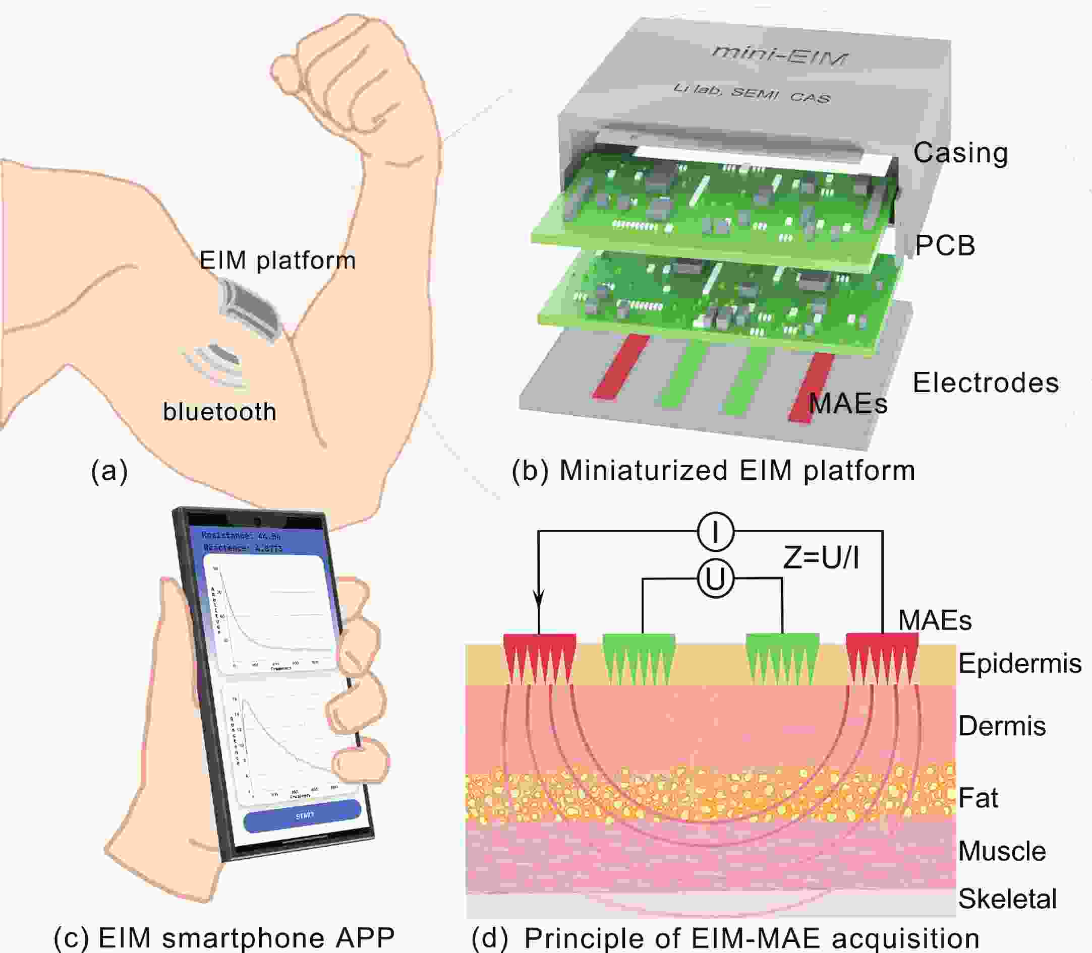 Accurate quantification of exercise interventions and changes in muscle function is essential for personalized health management. Electrical impedance myography (EIM) technology offers an innovative, noninvasive, painless, and easy-to-perform solution for muscle health monitoring. However, current EIM platforms face a number of limitations, including large device size, wired connections, and instability of the electrode-skin interface, which limit their applicability for monitoring muscle movement. In this study, a miniature wireless EIM platform with a user-friendly smartphone app is proposed and developed. The miniature, wireless, multi-frequency (20 kHz?1 MHz) EIM platform is equipped with flexible microneedle array electrodes (MAE). The advantages of MAEs over conventional electrodes were demonstrated by physical field modeling simulations and skin-electrode contact impedance comparison tests. The smartphone APP was developed to wirelessly operate the EIM platform, and to transmit and process real-time muscle impedance data. To validate its effectiveness, a seven-day adaptive fatigue training study was conducted, which demonstrated that the EIM platform was able to detect muscle adaptations and serve as a reliable indicator of fatigue. This study presents an innovative approach to applying EIM technology to muscle health monitoring and exercise testing, thereby advancing the development of personalized health management and athletic performance assessment.