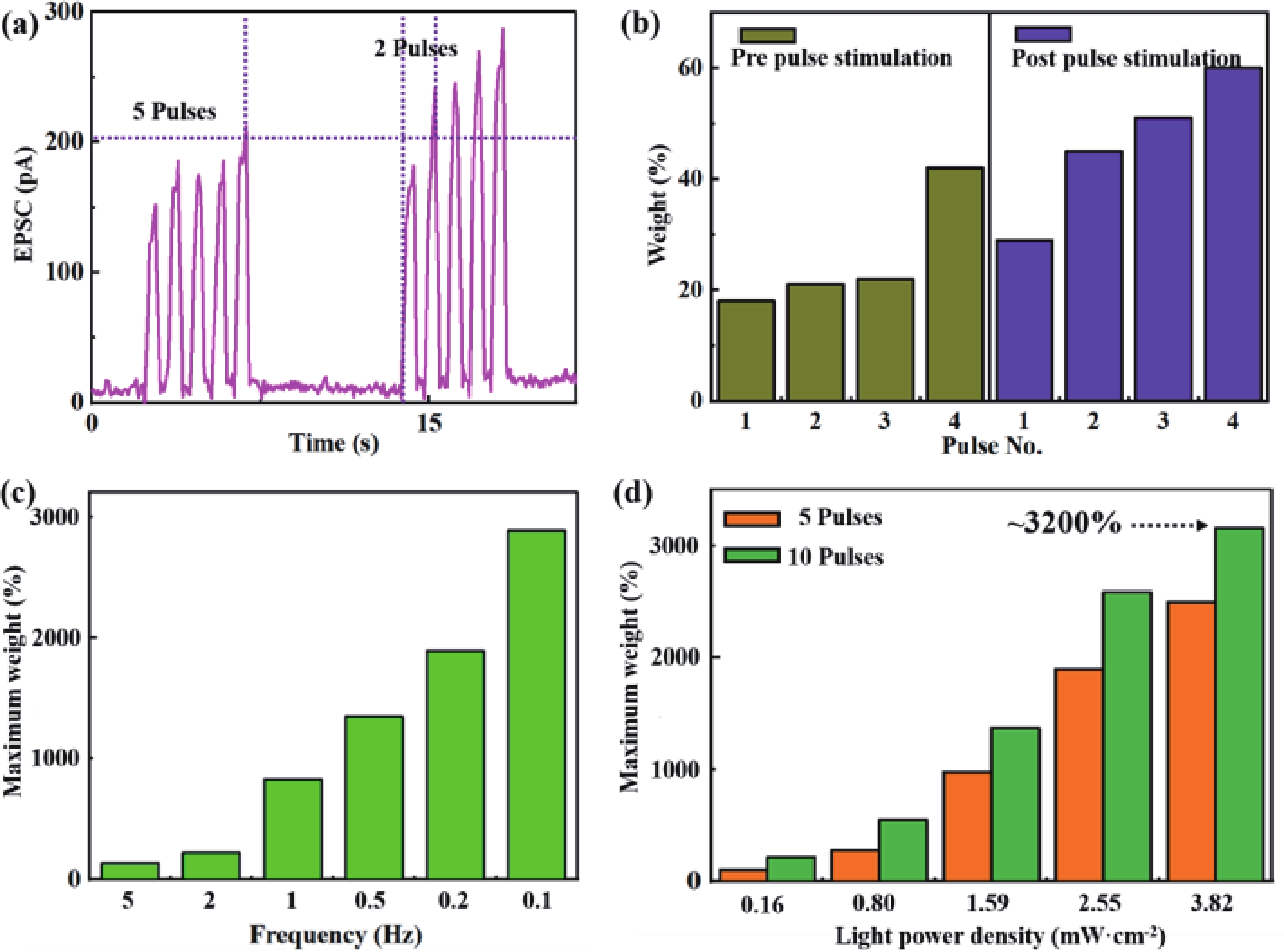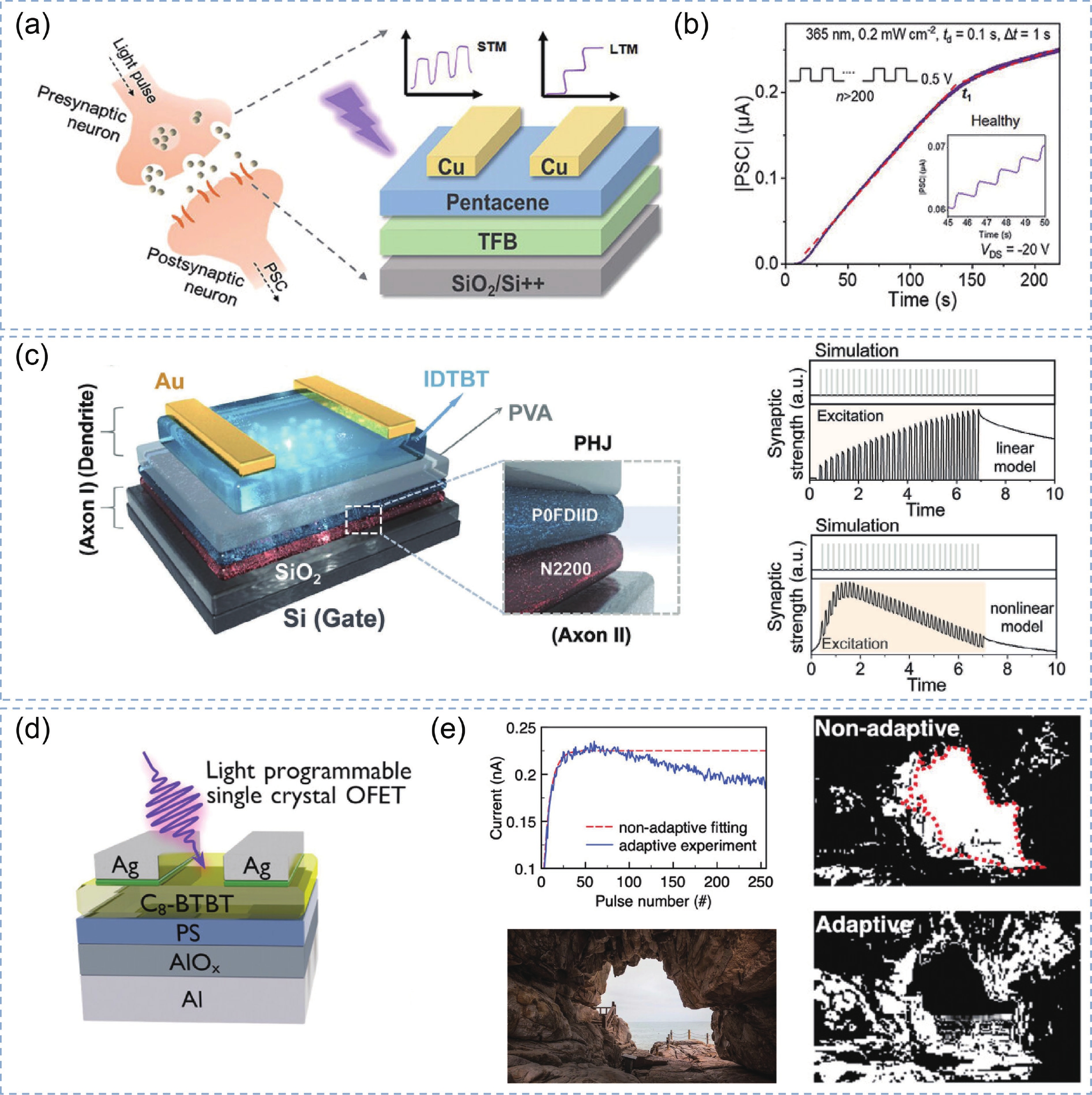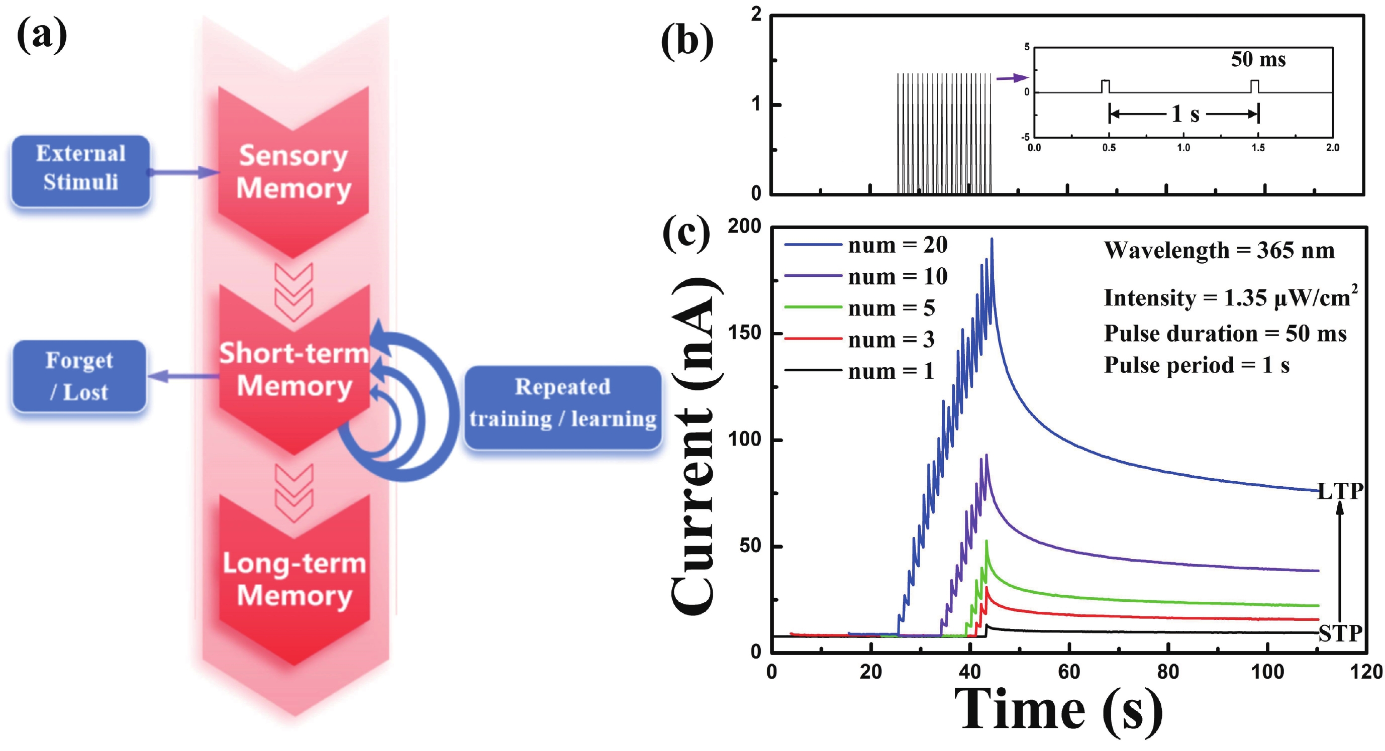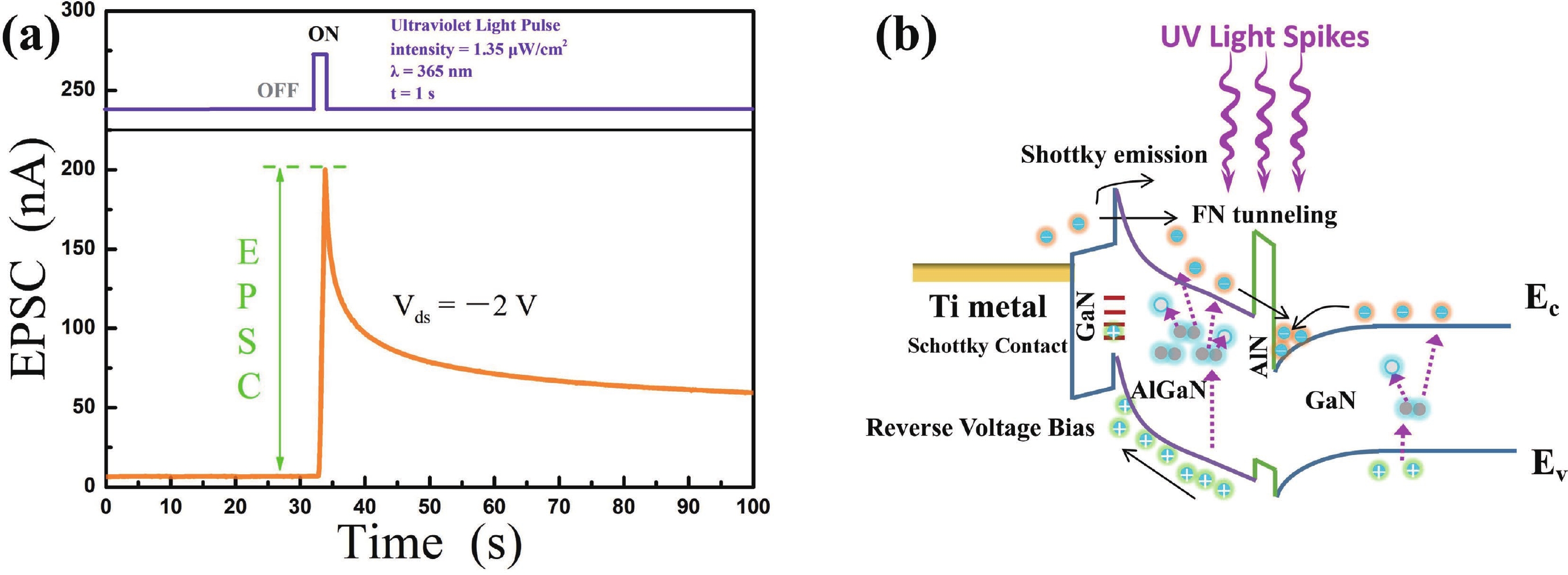 In recent years, research focusing on synaptic device based on phototransistors has provided a new method for associative learning and neuromorphic computing. A TiO2/AlGaN/GaN heterostructure-based synaptic phototransistor is fabricated and measured, integrating a TiO2 nanolayer gate and a two-dimensional electron gas (2DEG) channel to mimic the synaptic weight and the synaptic cleft, respectively. The maximum drain to source current is 10 nA, while the device is driven at a reverse bias not exceeding ?2.5 V. A excitatory postsynaptic current (EPSC) of 200 nA can be triggered by a 365 nm UVA light spike with the duration of 1 s at light intensity of 1.35 μW?cm?2. Multiple synaptic neuromorphic functions, including EPSC, short-term/long-term plasticity (STP/LTP) and paried-pulse facilitation (PPF), are effectively mimicked by our GaN-based heterostructure synaptic device. In the typical Pavlov’s dog experiment, we demonstrate that the device can achieve "retraining" process to extend memory time through enhancing the intensity of synaptic weight, which is similar to the working mechanism of human brain.