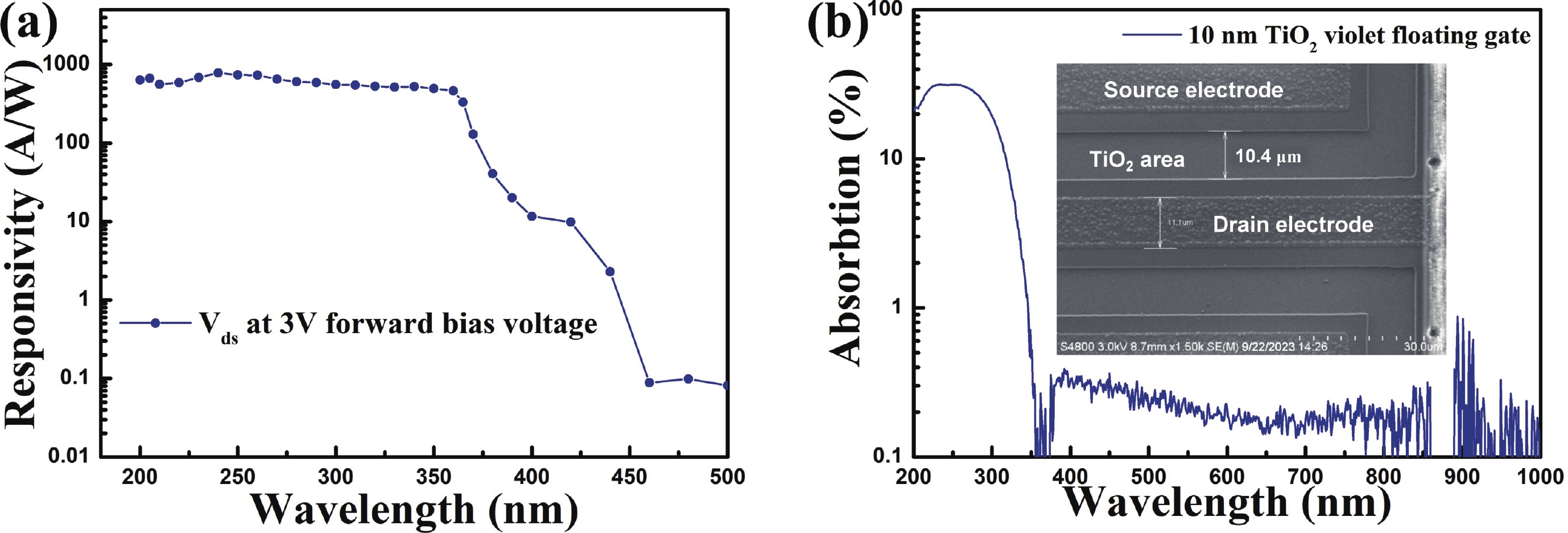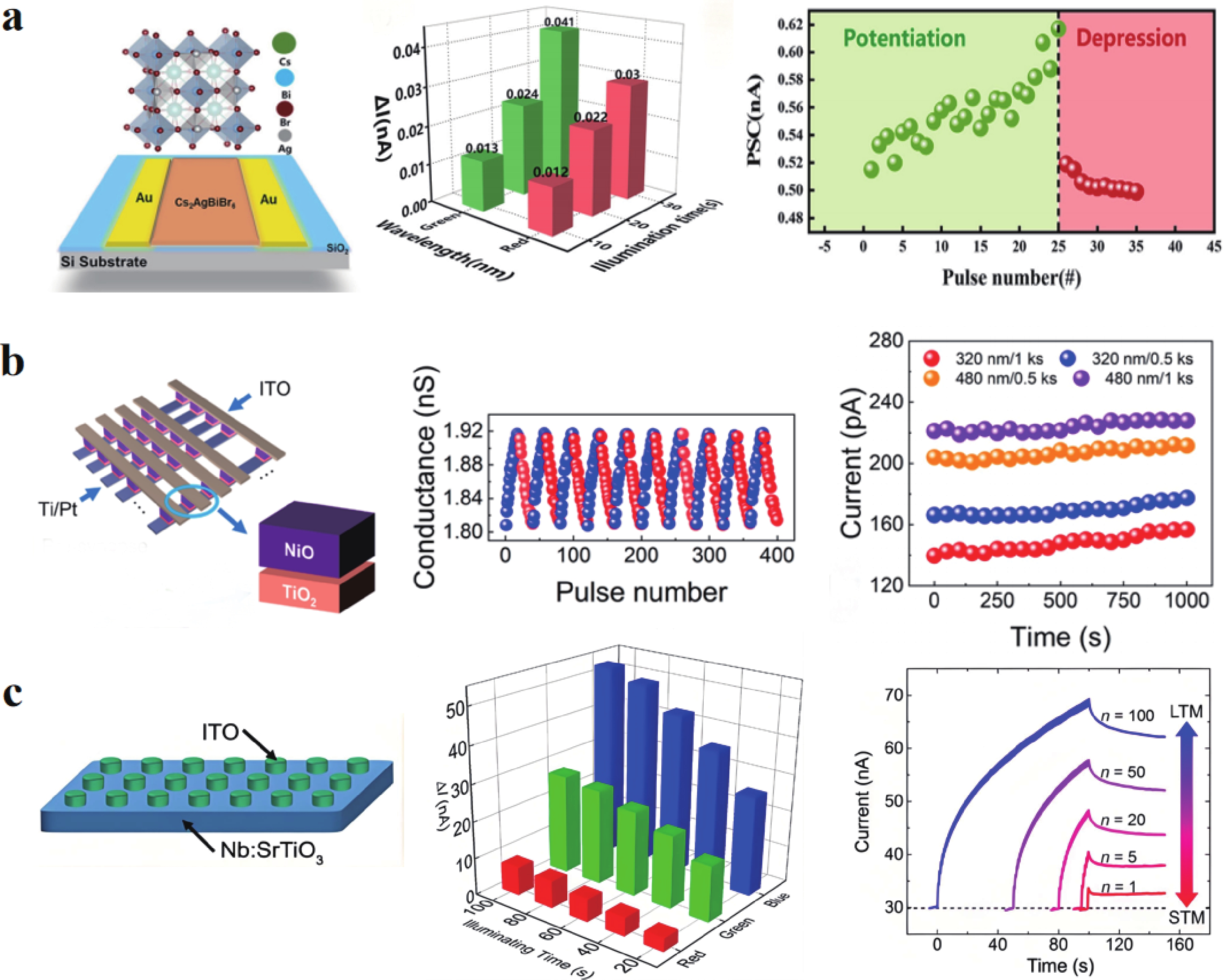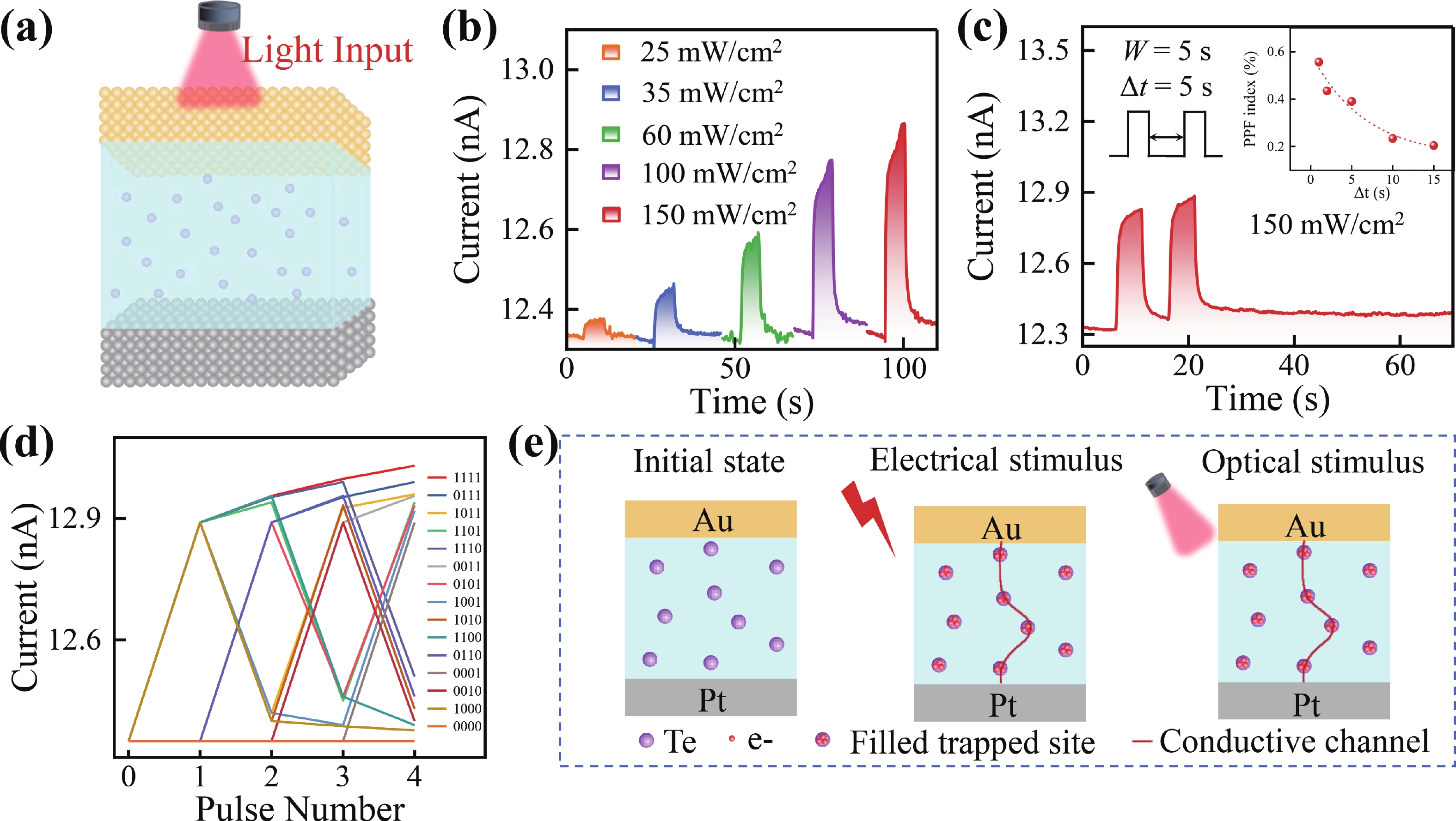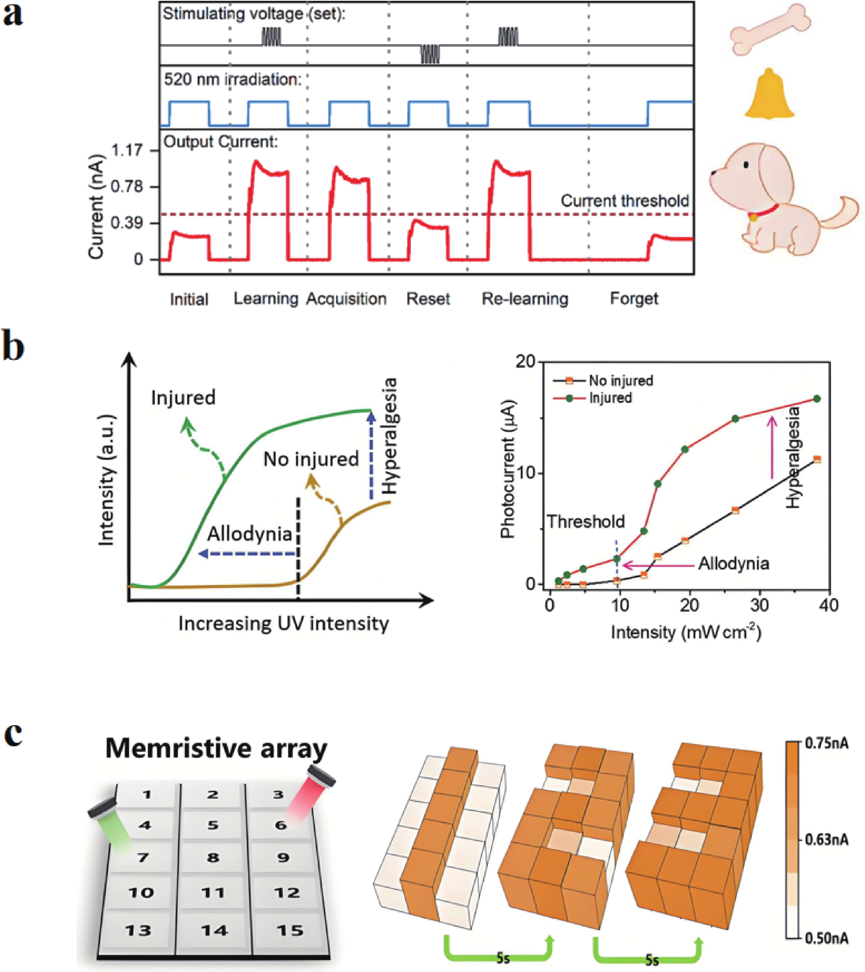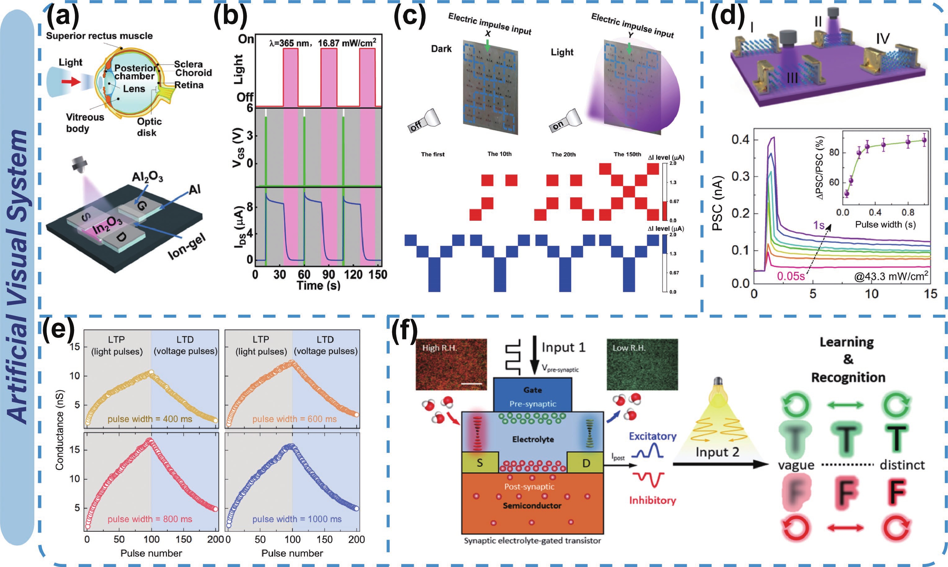 In recent years, research focusing on synaptic device based on phototransistors has provided a new method for associative learning and neuromorphic computing. A TiO2/AlGaN/GaN heterostructure-based synaptic phototransistor is fabricated and measured, integrating a TiO2 nanolayer gate and a two-dimensional electron gas (2DEG) channel to mimic the synaptic weight and the synaptic cleft, respectively. The maximum drain to source current is 10 nA, while the device is driven at a reverse bias not exceeding ?2.5 V. A excitatory postsynaptic current (EPSC) of 200 nA can be triggered by a 365 nm UVA light spike with the duration of 1 s at light intensity of 1.35 μW?cm?2. Multiple synaptic neuromorphic functions, including EPSC, short-term/long-term plasticity (STP/LTP) and paried-pulse facilitation (PPF), are effectively mimicked by our GaN-based heterostructure synaptic device. In the typical Pavlov’s dog experiment, we demonstrate that the device can achieve "retraining" process to extend memory time through enhancing the intensity of synaptic weight, which is similar to the working mechanism of human brain.