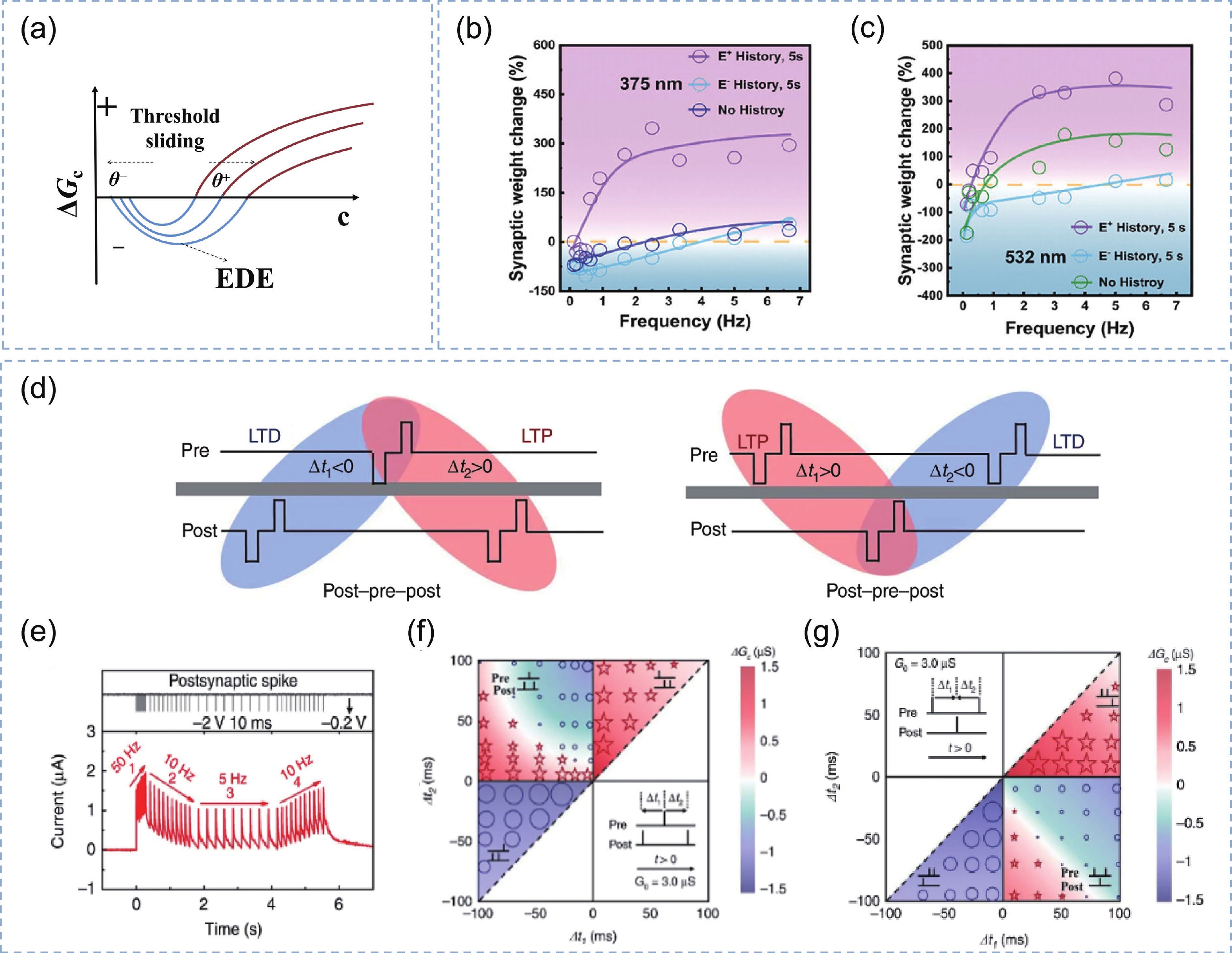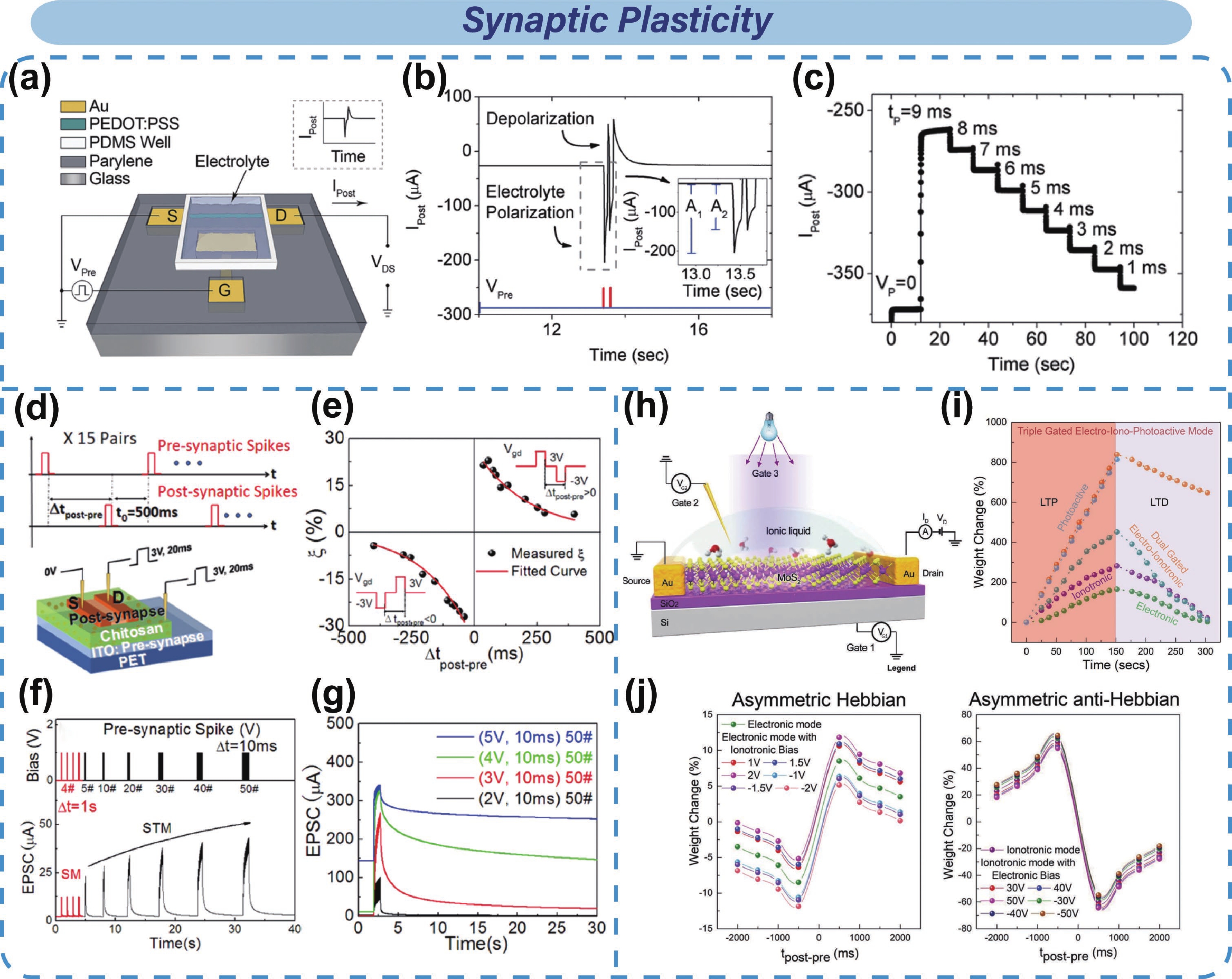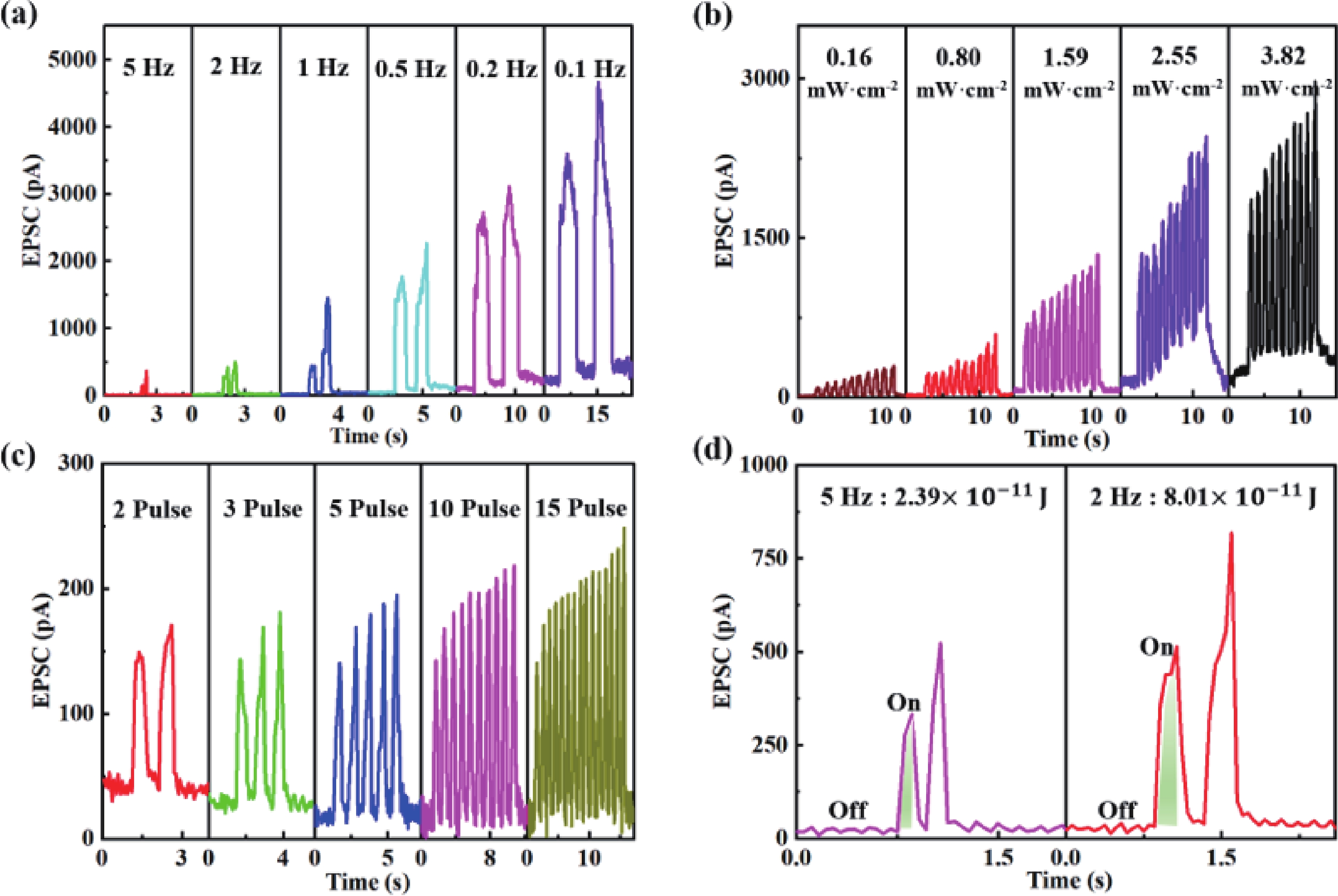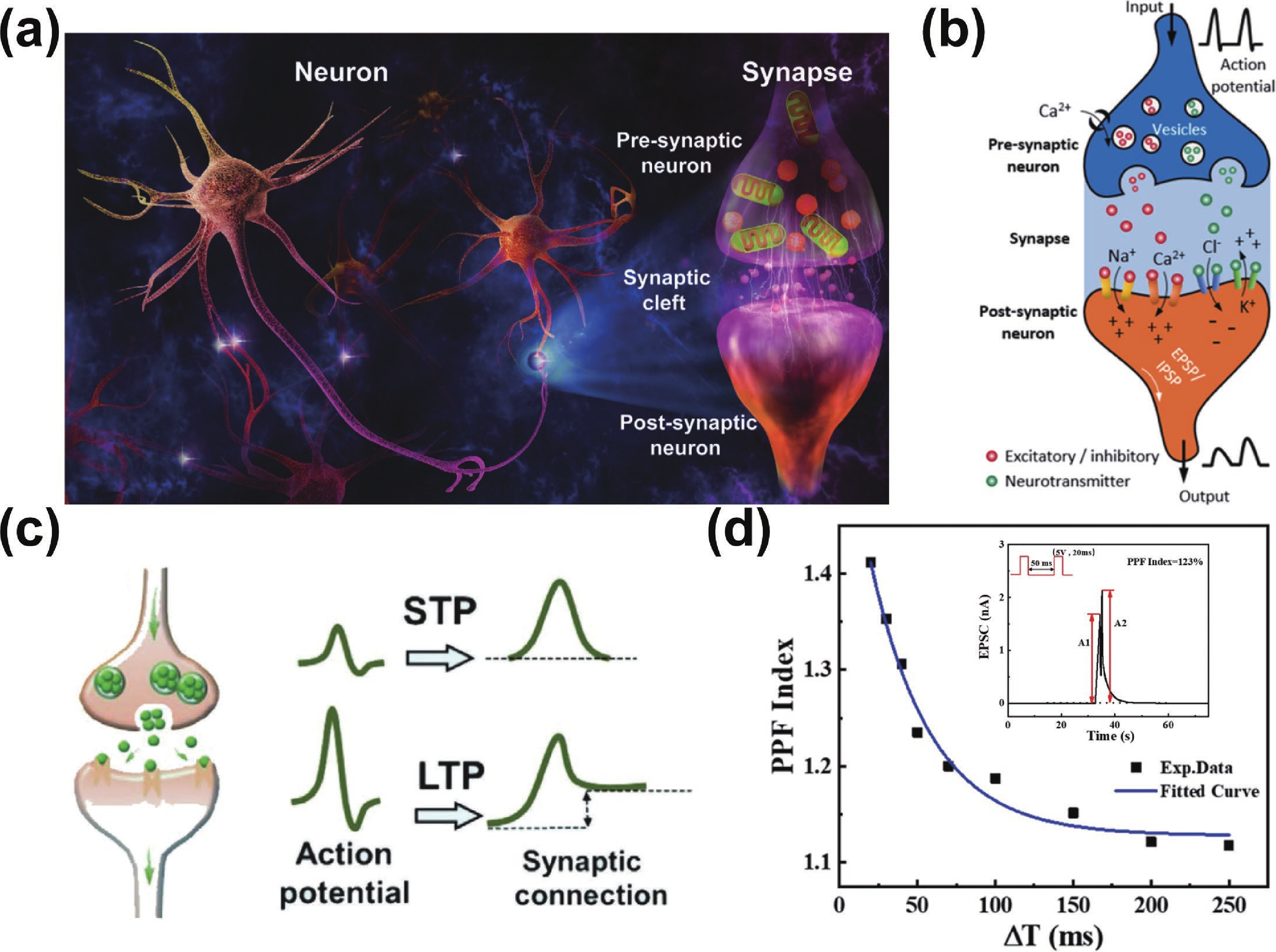 In recent years, research focusing on synaptic device based on phototransistors has provided a new method for associative learning and neuromorphic computing. A TiO2/AlGaN/GaN heterostructure-based synaptic phototransistor is fabricated and measured, integrating a TiO2 nanolayer gate and a two-dimensional electron gas (2DEG) channel to mimic the synaptic weight and the synaptic cleft, respectively. The maximum drain to source current is 10 nA, while the device is driven at a reverse bias not exceeding ?2.5 V. A excitatory postsynaptic current (EPSC) of 200 nA can be triggered by a 365 nm UVA light spike with the duration of 1 s at light intensity of 1.35 μW?cm?2. Multiple synaptic neuromorphic functions, including EPSC, short-term/long-term plasticity (STP/LTP) and paried-pulse facilitation (PPF), are effectively mimicked by our GaN-based heterostructure synaptic device. In the typical Pavlov’s dog experiment, we demonstrate that the device can achieve "retraining" process to extend memory time through enhancing the intensity of synaptic weight, which is similar to the working mechanism of human brain.