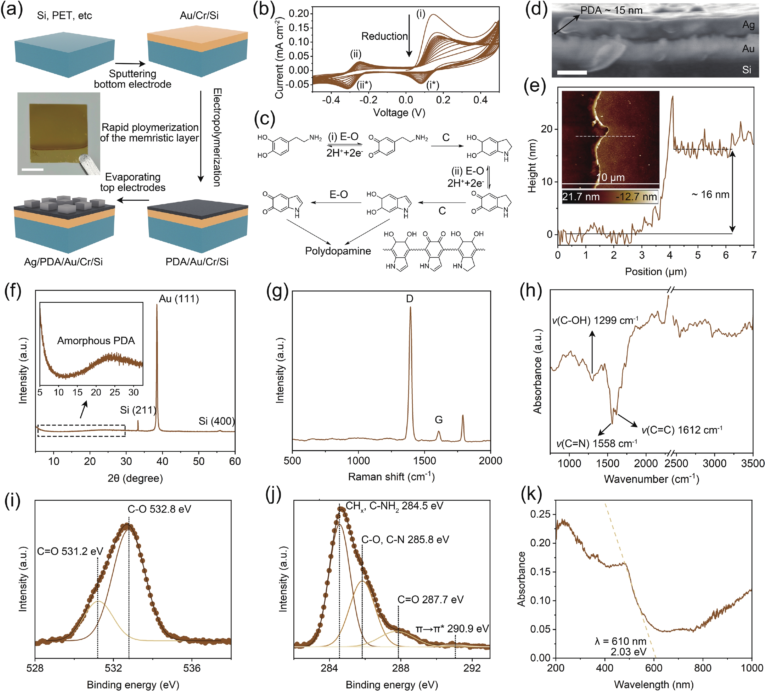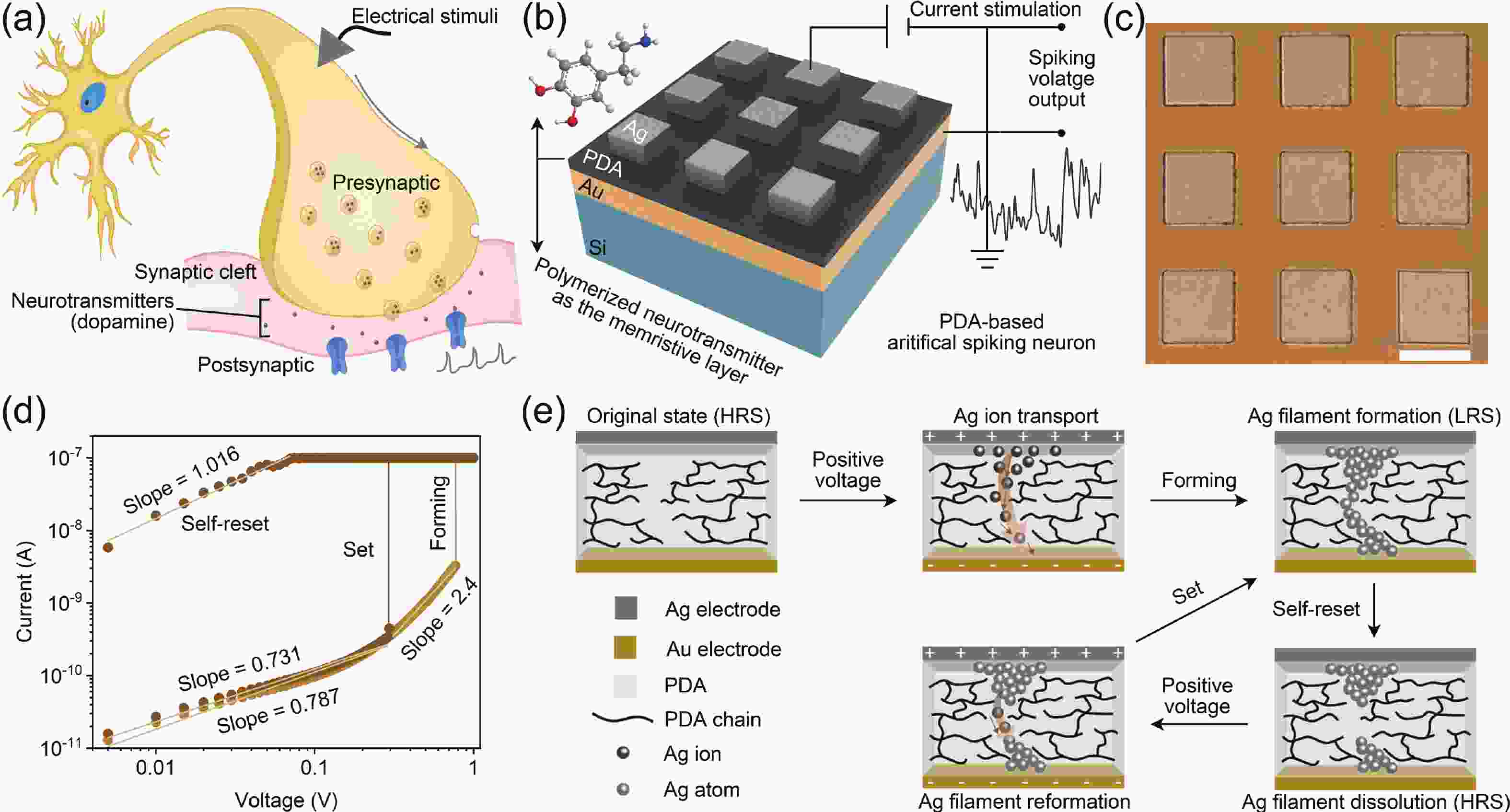 Electropolymerized dopamine-based memristors using threshold switching behaviors for artificial current-activated spiking neurons