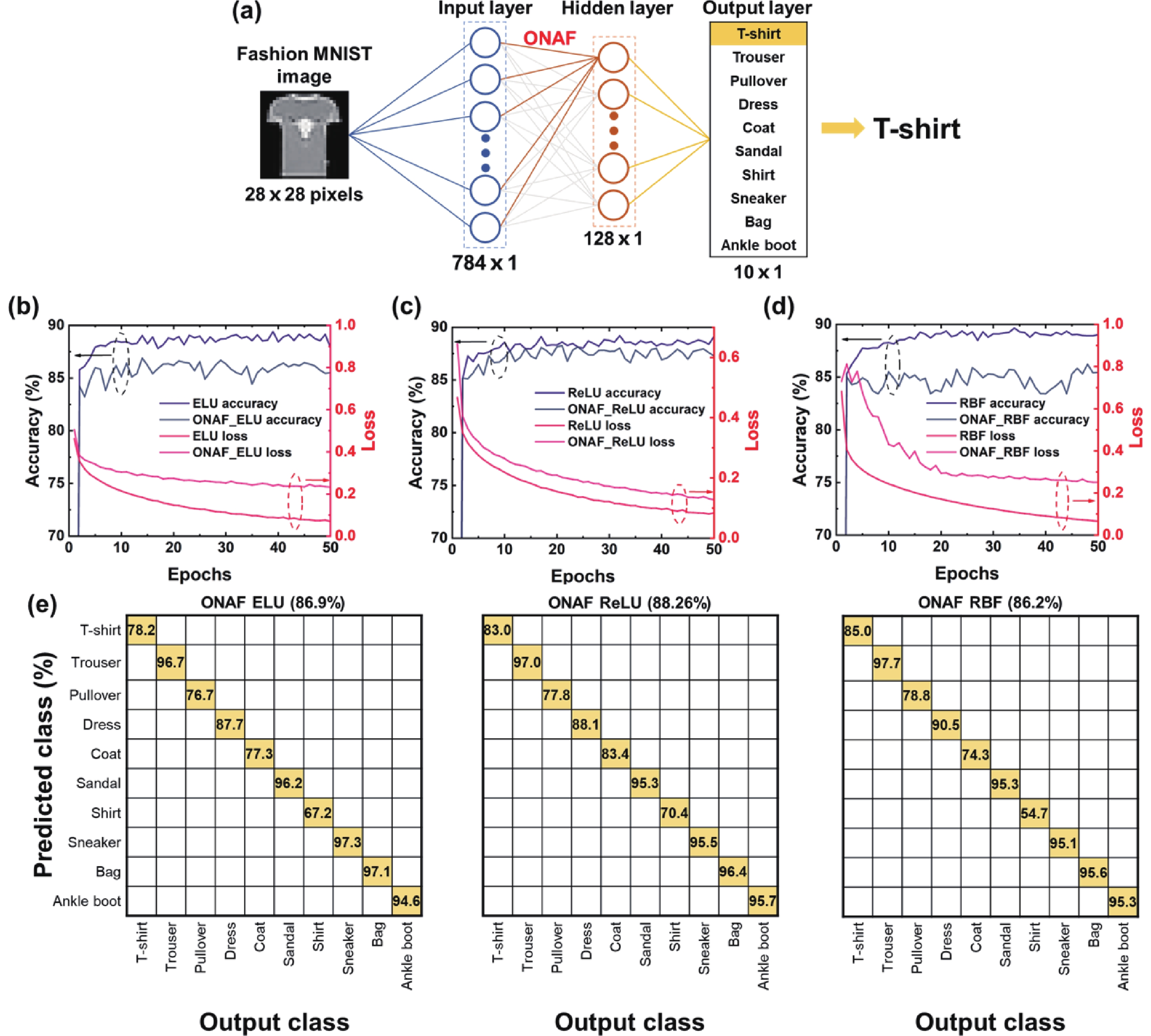 Photonic neural networks have garnered significant attention in recent years due to their ultra-high computational speed, broad bandwidth, and parallel processing capabilities. However, compared to conventional electronic nonlinear activation function (NAF), progress on efficient and easily implementable optical nonlinear activation function (ONAF) was barely reported. To address this issue, we proposed a programmable, low-loss ONAF device based on a silicon micro-ring resonator capped with the Antimony selenide (Sb2Se3) thin films, and with indium tin oxide (ITO) used as the microheater. Leveraging our self-developed phase-transformation kinetic and optical models, we successfully simulated the phase-transition behavior of Sb2Se3 and three different ONAFs—ELU, ReLU, and radial basis function (RBF) were achieved according to discernible optical responses of proposed devices under different phase-change extents. Classification results from the Fashion MNIST dataset demonstrated that these ONAFs can be considered as appropriate substitutes for traditional NAF. This indicated the bright prospect of the proposed device for nonlinear activation function in future photonic neural networks.