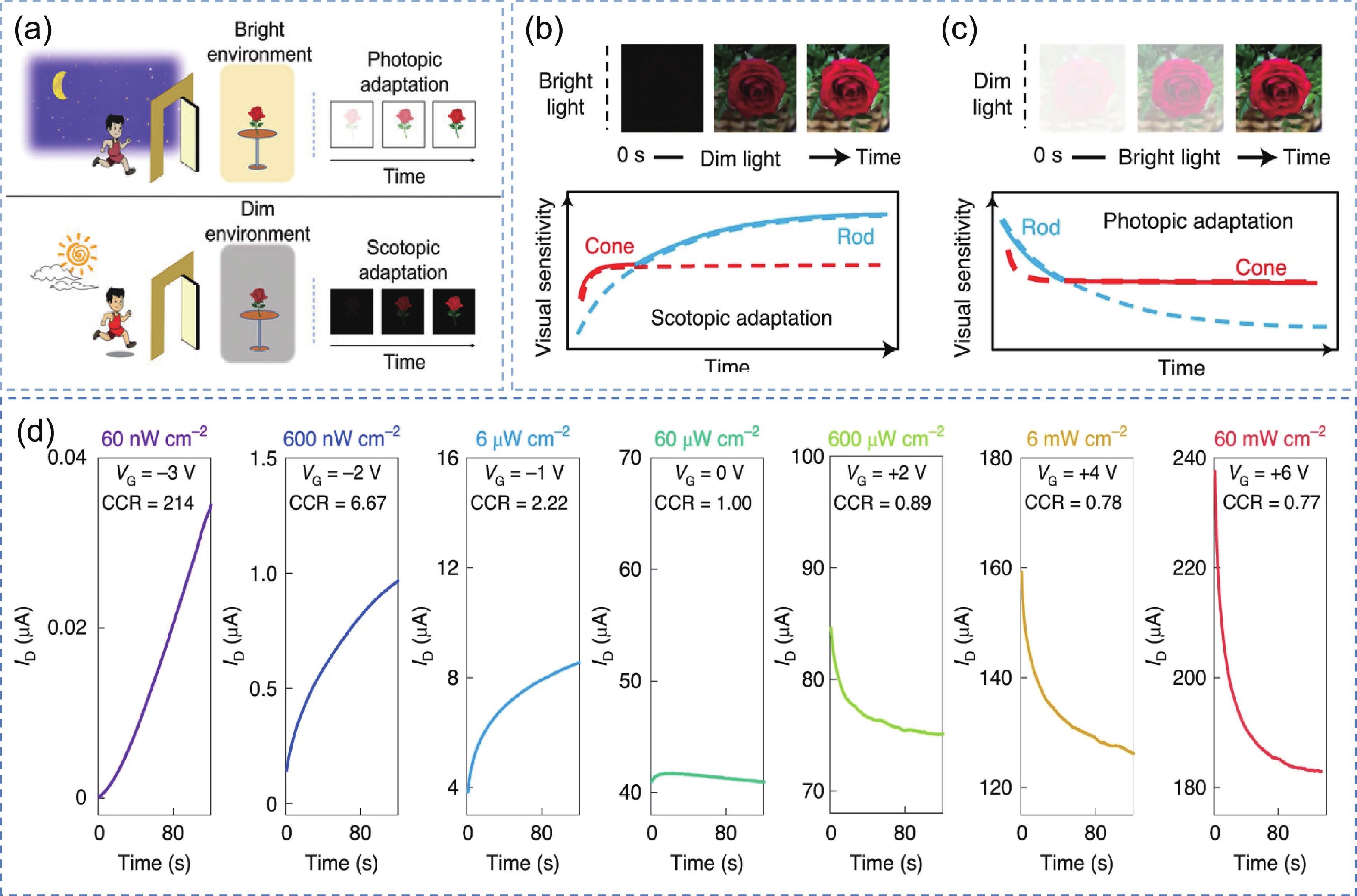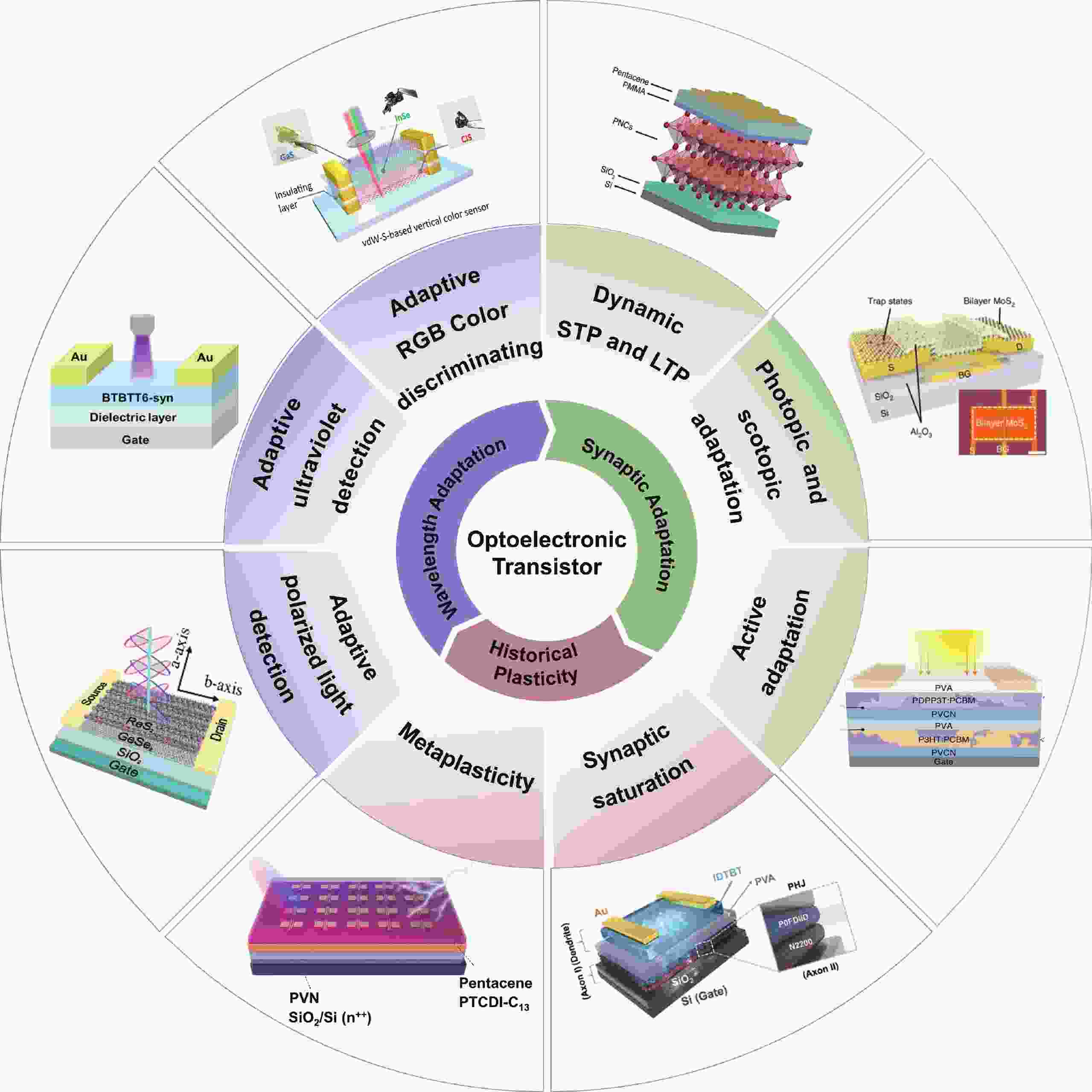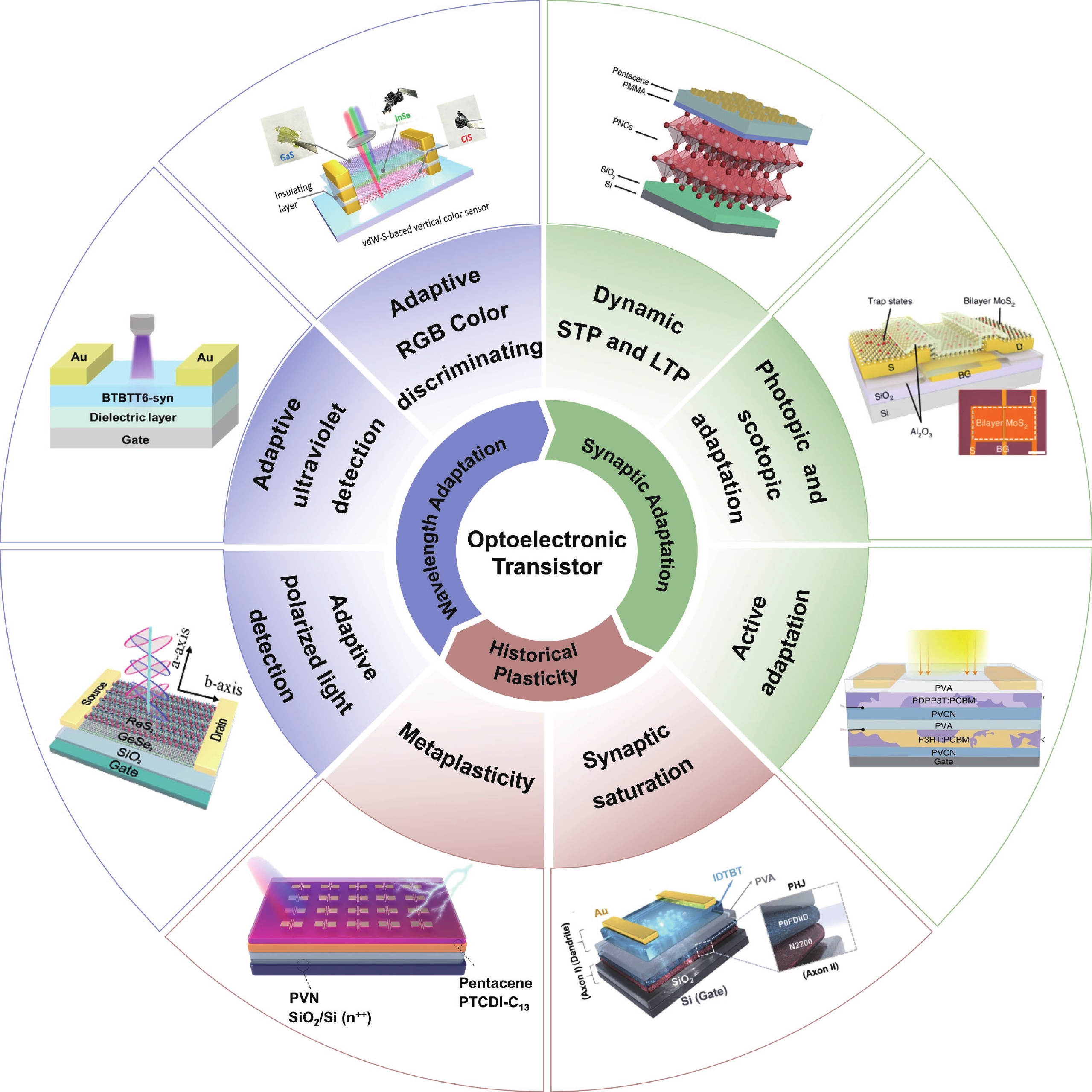 Recently, for developing neuromorphic visual systems, adaptive optoelectronic devices become one of the main research directions and attract extensive focus to achieve optoelectronic transistors with high performances and flexible functionalities. In this review, based on a description of the biological adaptive functions that are favorable for dynamically perceiving, filtering, and processing information in the varying environment, we summarize the representative strategies for achieving these adaptabilities in optoelectronic transistors, including the adaptation for detecting information, adaptive synaptic weight change, and history-dependent plasticity. Moreover, the key points of the corresponding strategies are comprehensively discussed. And the applications of these adaptive optoelectronic transistors, including the adaptive color detection, signal filtering, extending the response range of light intensity, and improve learning efficiency, are also illustrated separately. Lastly, the challenges faced in developing adaptive optoelectronic transistor for artificial vision system are discussed. The description of biological adaptive functions and the corresponding inspired neuromorphic devices are expected to provide insights for the design and application of next-generation artificial visual systems.
