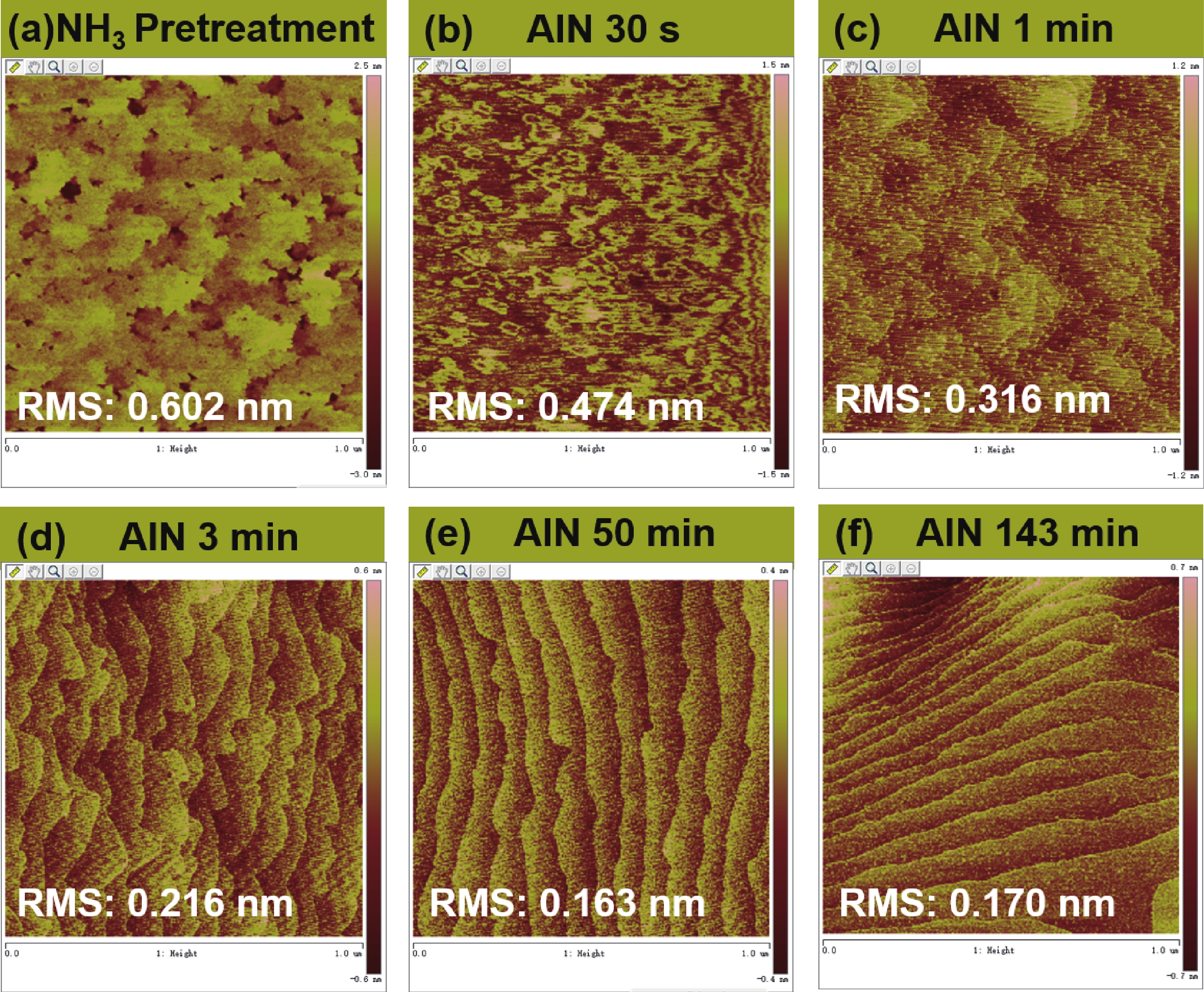 High-quality AlN epitaxial layers with low dislocation densities and uniform crystal quality are essential for next-generation optoelectronic and power devices. This study reports the epitaxial growth of 6-inch AlN films on 17 nm AlN/sapphire templates using metal?organic chemical vapor deposition (MOCVD). Comprehensive characterization reveals significant advancements in crystal quality and uniformity. Atomic force microscopy (AFM) shows progressive surface roughness reduction during early growth stages, achieving stabilization at a root mean square (RMS) roughness of 0.216 nm within 3 min, confirming successful 2D growth mode. X-ray rocking curve (XRC) analysis indicates a marked reduction in the (0002) reflection full width at half maximum (FWHM), from 445 to 96 arcsec, evidencing effective dislocation annihilation. Transmission electron microscopy (TEM) demonstrates the elimination of edge dislocations near the AlN template interface. Stress analysis highlights the role of a highly compressive 17 nm AlN template (5.11 GPa) in facilitating threading dislocation bending and annihilation, yielding a final dislocation density of ~1.5 × 107 cm?2. Raman spectroscopy and XRC mapping confirm excellent uniformity of stress and crystal quality across the wafer. These findings demonstrate the feasibility of this method for producing high-quality, large-area, atomically flat AlN films, advancing applications in optoelectronics and power electronics.