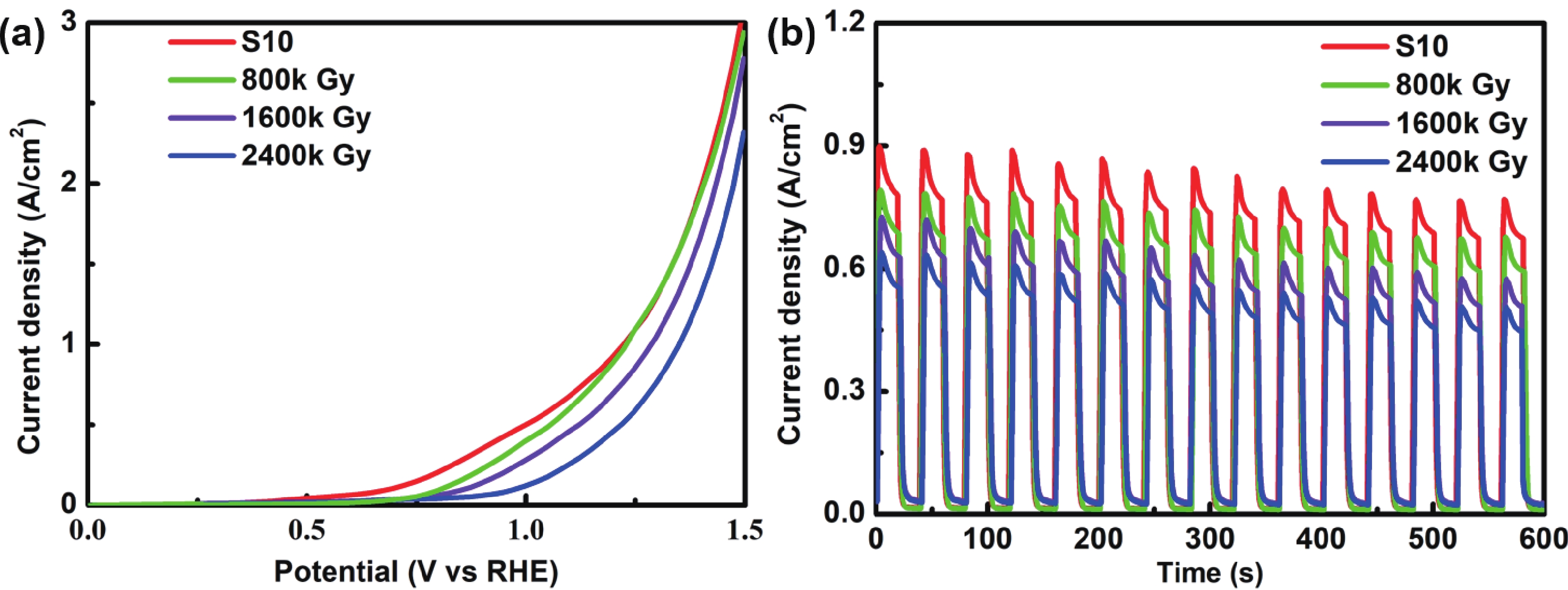 Abstract: 4H silicon carbide (4H-SiC) has gained a great success in high-power electronics, owing to its advantages of wide bandgap, high breakdown electric field strength, high carrier mobility, and high thermal conductivity. Considering the high carrier mobility and high stability of 4H-SiC, 4H-SiC has great potential in the field of photoelectrochemical (PEC) water splitting. In this work, we demonstrate the irradiation-resistant PEC water splitting based on nanoporous 4H-SiC arrays. A new two-step anodizing approach is adopted to prepare 4H-SiC nanoporous arrays with different porosity, that is, a constant low-voltage etching followed by a pulsed high-voltage etching. The constant-voltage etching and pulsed-voltage etching are adopted to control the diameter of the nanopores and the depth of the nanoporous arrays, respectively. It is found that the nanoporous arrays with medium porosity has the highest PEC current, because of the enhanced light absorption and the optimized transportation of charge carriers along the walls of the nanoporous arrays. The performance of the PEC water splitting of the nanoporous arrays is stable after the electron irradiation with the dose of 800 and 1600 kGy, which indicates that 4H-SiC nanoporous arrays has great potential in the PEC water splitting under harsh environments.