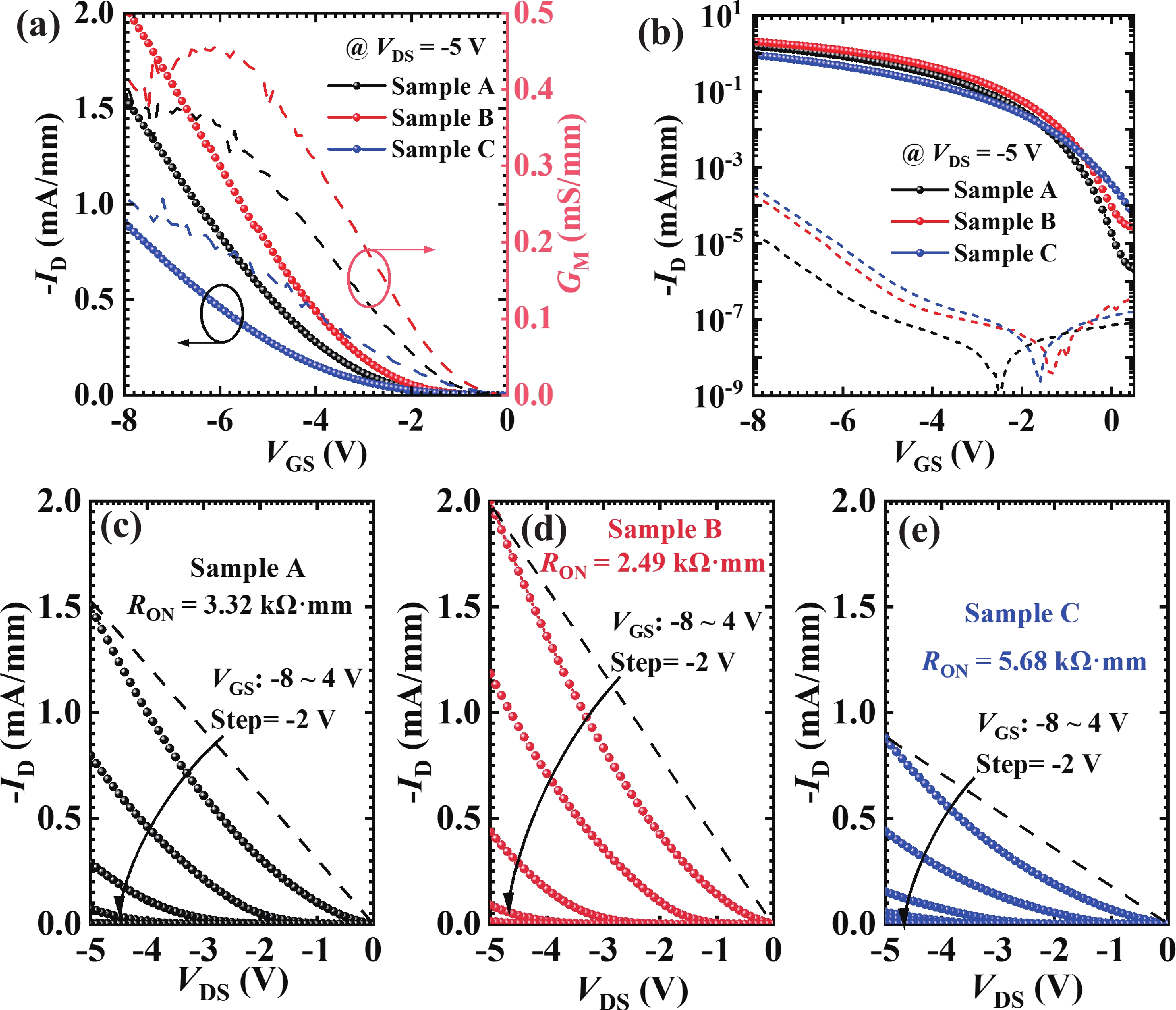 Abstract: Pre-ohmic-annealing (POA) treatment of P-GaN/AlN/AlGaN epitaxy under N2 atmosphere was demonstrated to effectively achieve good p-type ohmic contact as well as decreased epitaxy sheet resistance. Ohmic contact resistance (Rc) extracted by transfer length method reduced from 38 to 23 Ω·mm with alleviated contact barrier height from 0.55 to 0.51 eV after POA treatment. X-ray photoelectron spectroscopy and Hall measurement confirmed that POA treatment was able to reduce surface state density and improve the hole concentration of p-GaN. Due to the decreased Rc and improved two-dimensional hole gas (2DHG) density, an outstanding-performance GaN E-mode p-channel MOSFET was successfully realized.
