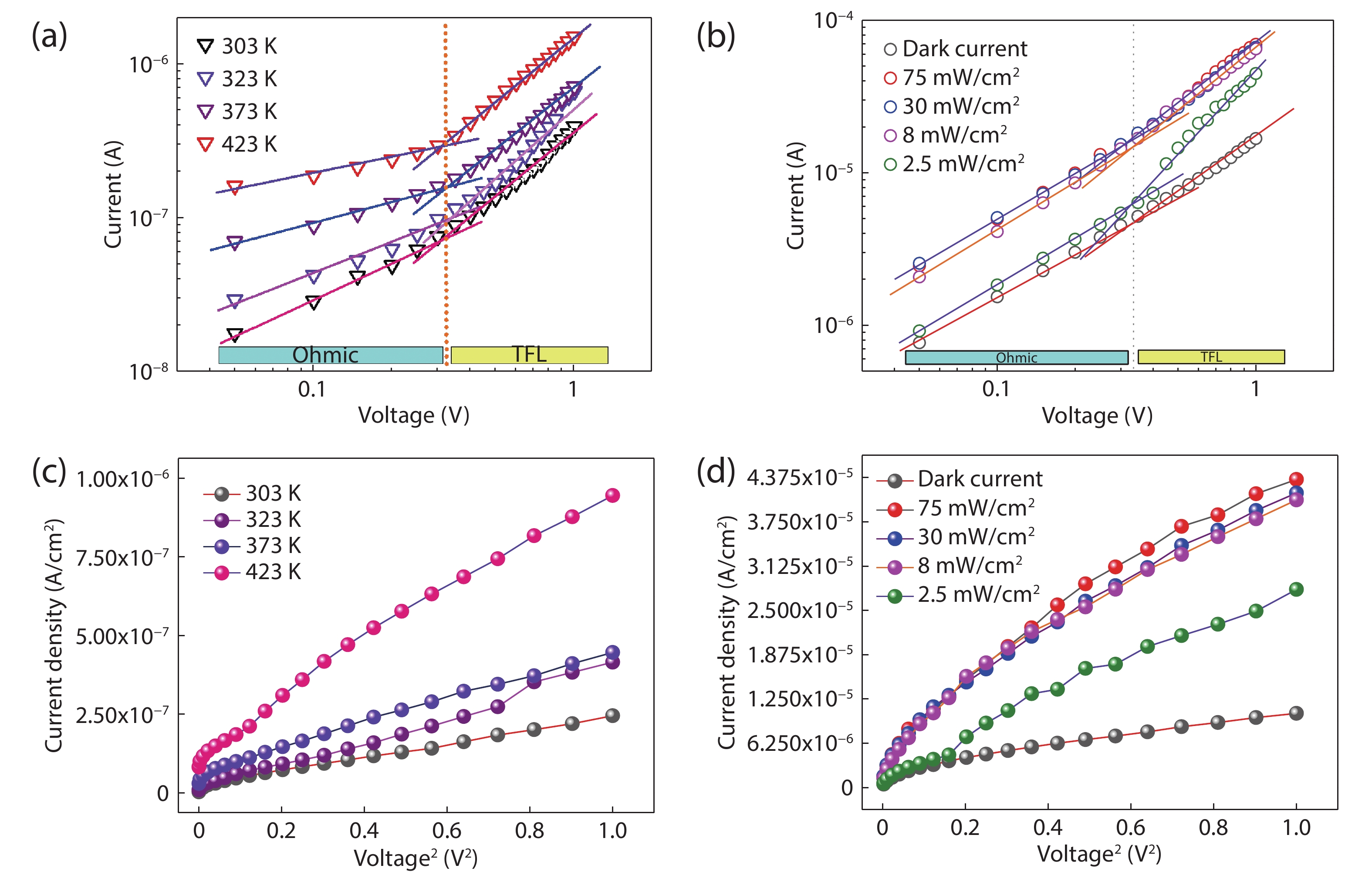 Key words: double-perovskite, charge-transport mechanism, space-charge limited current (SCLC), three-terminal device, voltage-dependent photo-switching