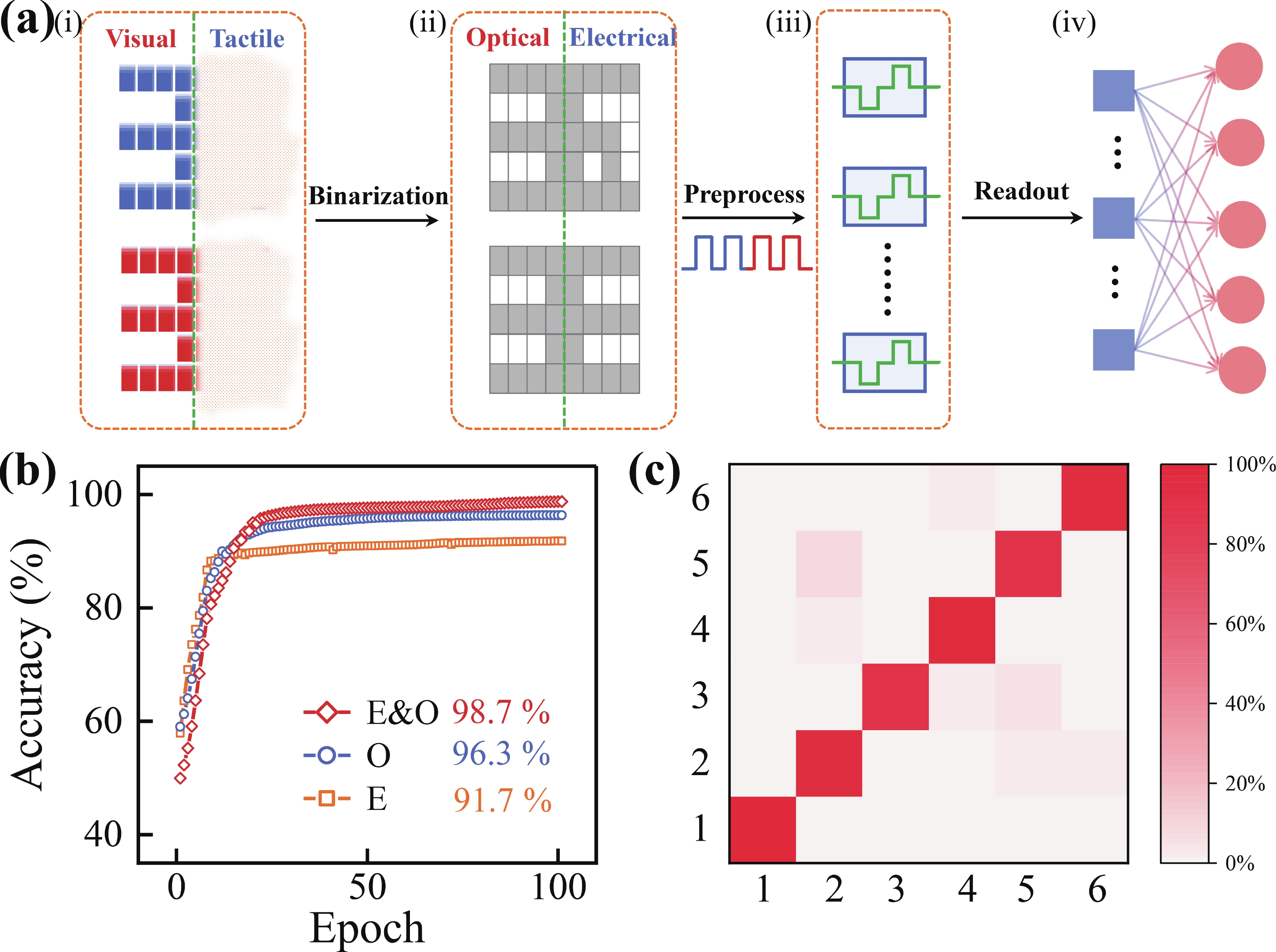 Abstract: Optoelectronic memristor is generating growing research interest for high efficient computing and sensing-memory applications. In this work, an optoelectronic memristor with Au/a-C:Te/Pt structure is developed. Synaptic functions, i.e., excitatory post-synaptic current and pair-pulse facilitation are successfully mimicked with the memristor under electrical and optical stimulations. More importantly, the device exhibited distinguishable response currents by adjusting 4-bit input electrical/optical signals. A multi-mode reservoir computing (RC) system is constructed with the optoelectronic memristors to emulate human tactile-visual fusion recognition and an accuracy of 98.7% is achieved. The optoelectronic memristor provides potential for developing multi-mode RC system.