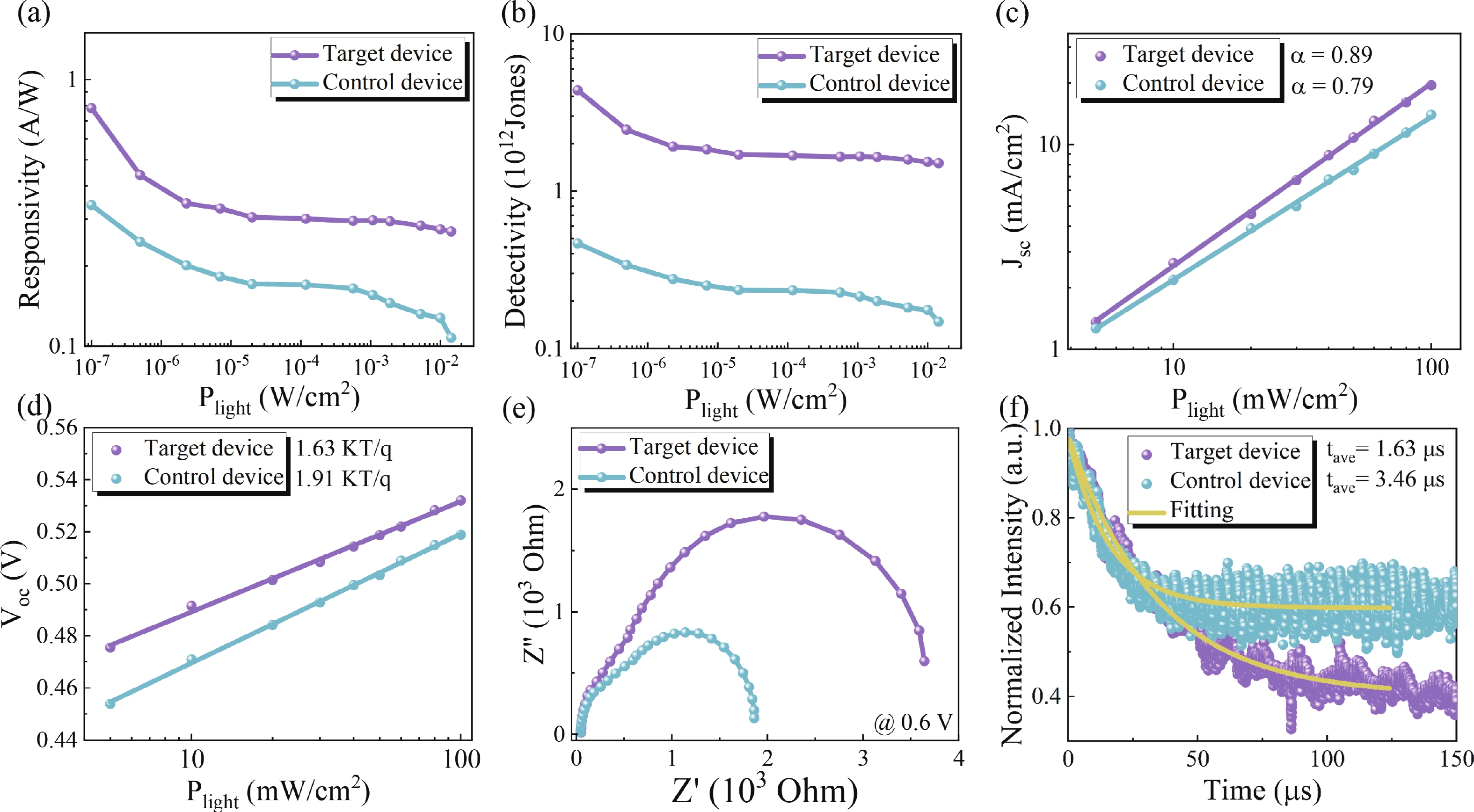 Abstract: Quantum dot (QD)-based infrared photodetector is a promising technology that can implement current monitoring, imaging and optical communication in the infrared region. However, the photodetection performance of self-powered QD devices is still limited by their unfavorable charge carrier dynamics due to their intrinsically discrete charge carrier transport process. Herein, we strategically constructed semiconducting matrix in QD film to achieve efficient charge transfer and extraction. The p-type semiconducting CuSCN was selected as energy-aligned matrix to match the n-type colloidal PbS QDs that was used as proof-of-concept. Note that the PbS QD/CuSCN matrix not only enables efficient charge carrier separation and transfer at nano-interfaces but also provides continuous charge carrier transport pathways that are different from the hoping process in neat QD film, resulting in improved charge mobility and derived collection efficiency. As a result, the target structure delivers high specific detectivity of 4.38 × 1012 Jones and responsivity of 782 mA/W at 808 nm, which is superior than that of the PbS QD-only photodetector (4.66 × 1011 Jones and 338 mA/W). This work provides a new structure candidate for efficient colloidal QD based optoelectronic devices.