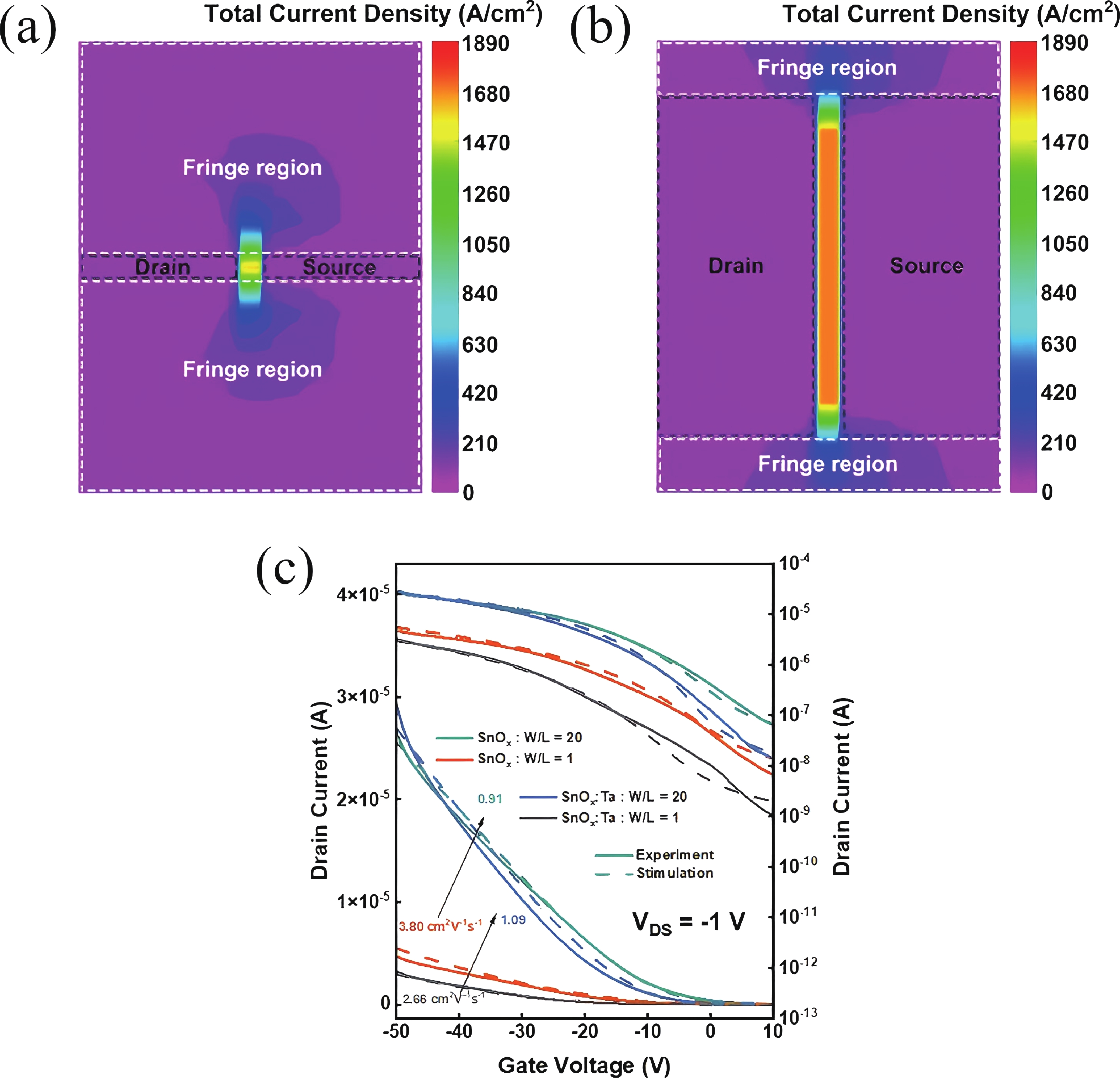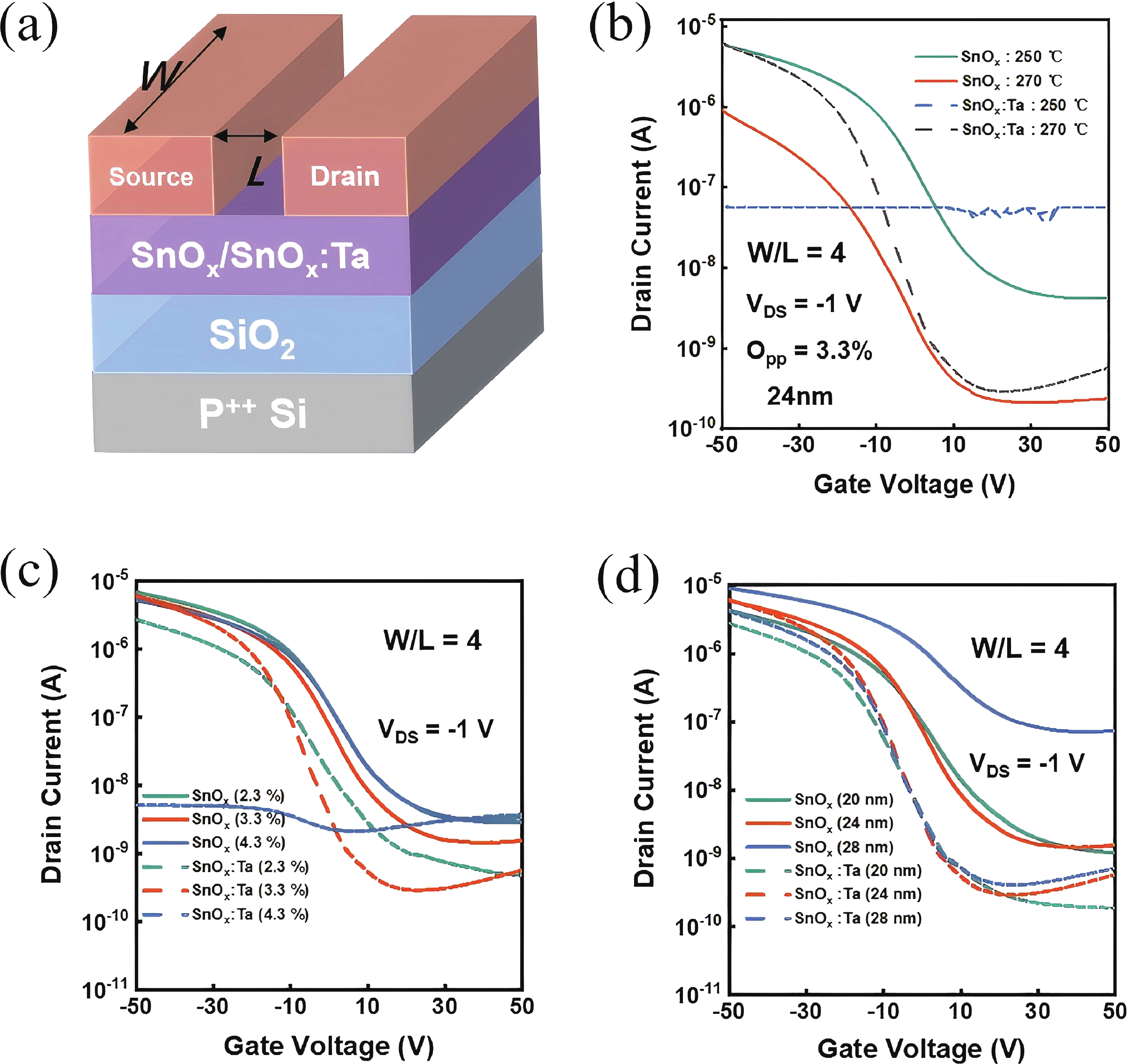 Key words: tin monoxide, p-type thin film transistors, Ta doping, fringe effect, on/off current ratio