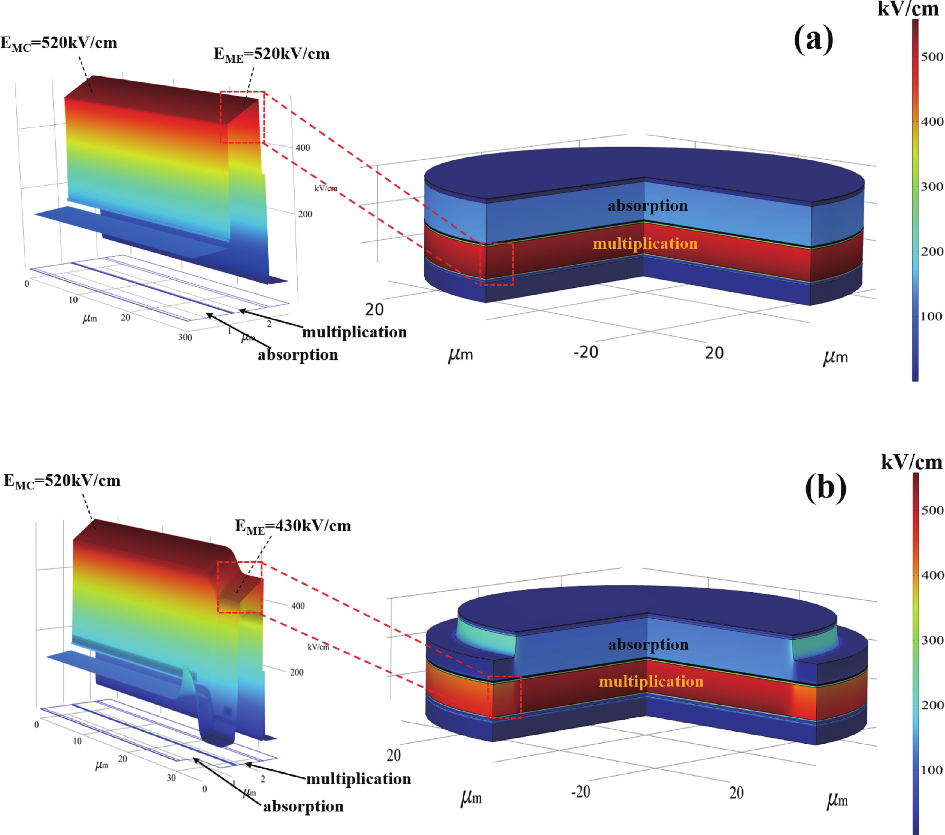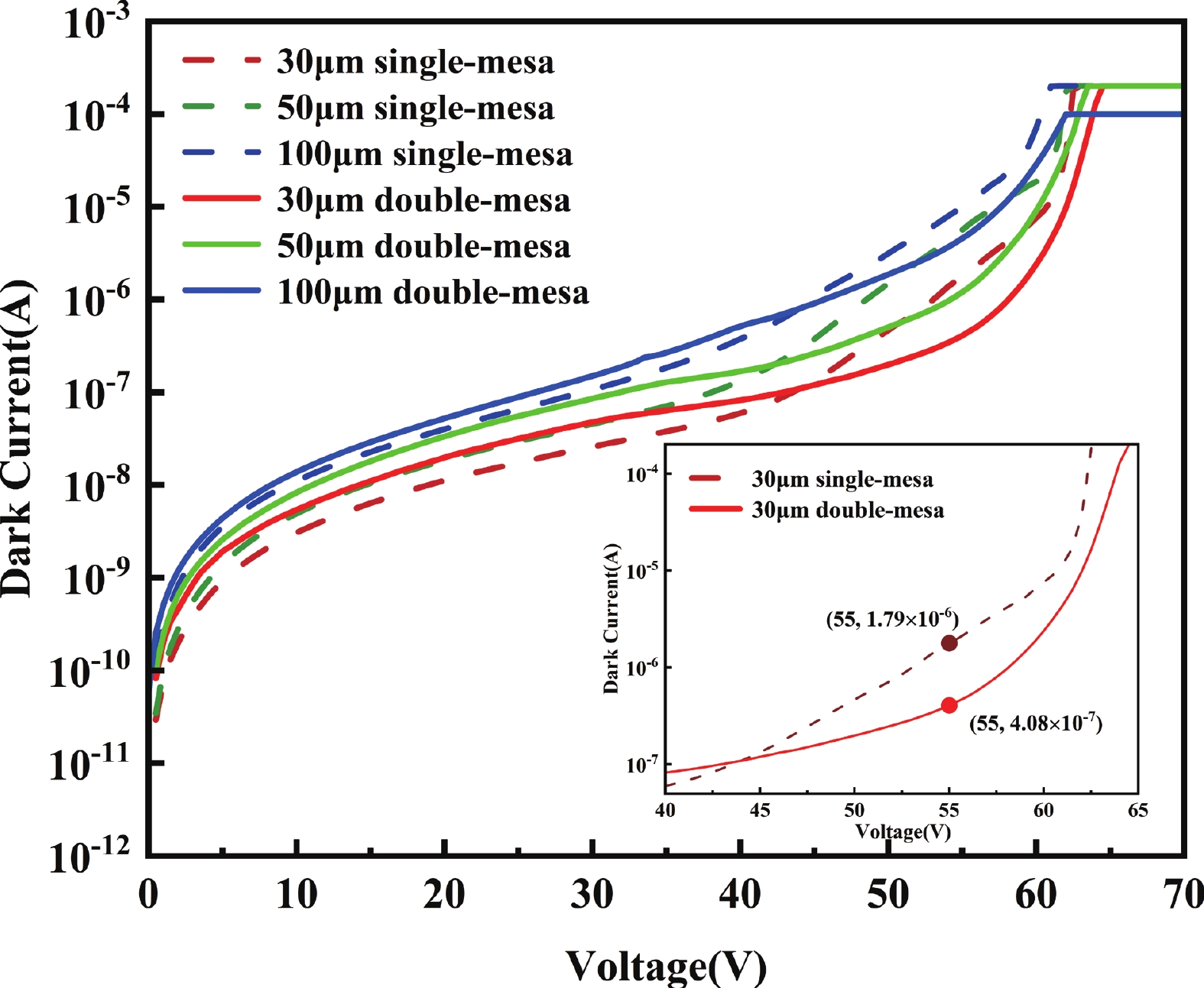 Abstract: Avalanche photodiode (APD) is a kind of photodetector with important applications in optical communication, light detection and ranging (LIDAR) and other fields. APDs fabricated using the recently developed AlGaAsSb as the multiplication material exhibit excellent noise performance. In this work, we report a low-noise separate absorption, grading, charge, and multiplication (SAGCM) InGaAs/AlGaAsSb APD operating at 1550 nm. A double-mesa structure was fabricated to reduce the dark current. Numerical simulations were conducted to compare two different mesa-structured APDs. By analyzing the electric field distribution, it was found that the electric field at the edge of the multiplication region in the double-mesa APD is nearly 100 kV/cm lower than that of the single-mesa structure. Experimental results demonstrate that after device punch-through, the double-mesa APD’s dark current can be reduced by up to four times compared to the single-mesa APD. Quantitative analysis of the dark current components in the AlGaAsSb APD further confirms that the low sidewall electric field in the double-mesa structure effectively suppresses the trap-assisted tunneling. Additionally, noise measurements indicate a k-value of approximately 0.014, which is significantly lower than that of traditional multiplication materials. This work provides preliminary validation for further performance improvements in low noise and low dark current AlGaAsSb APDs.