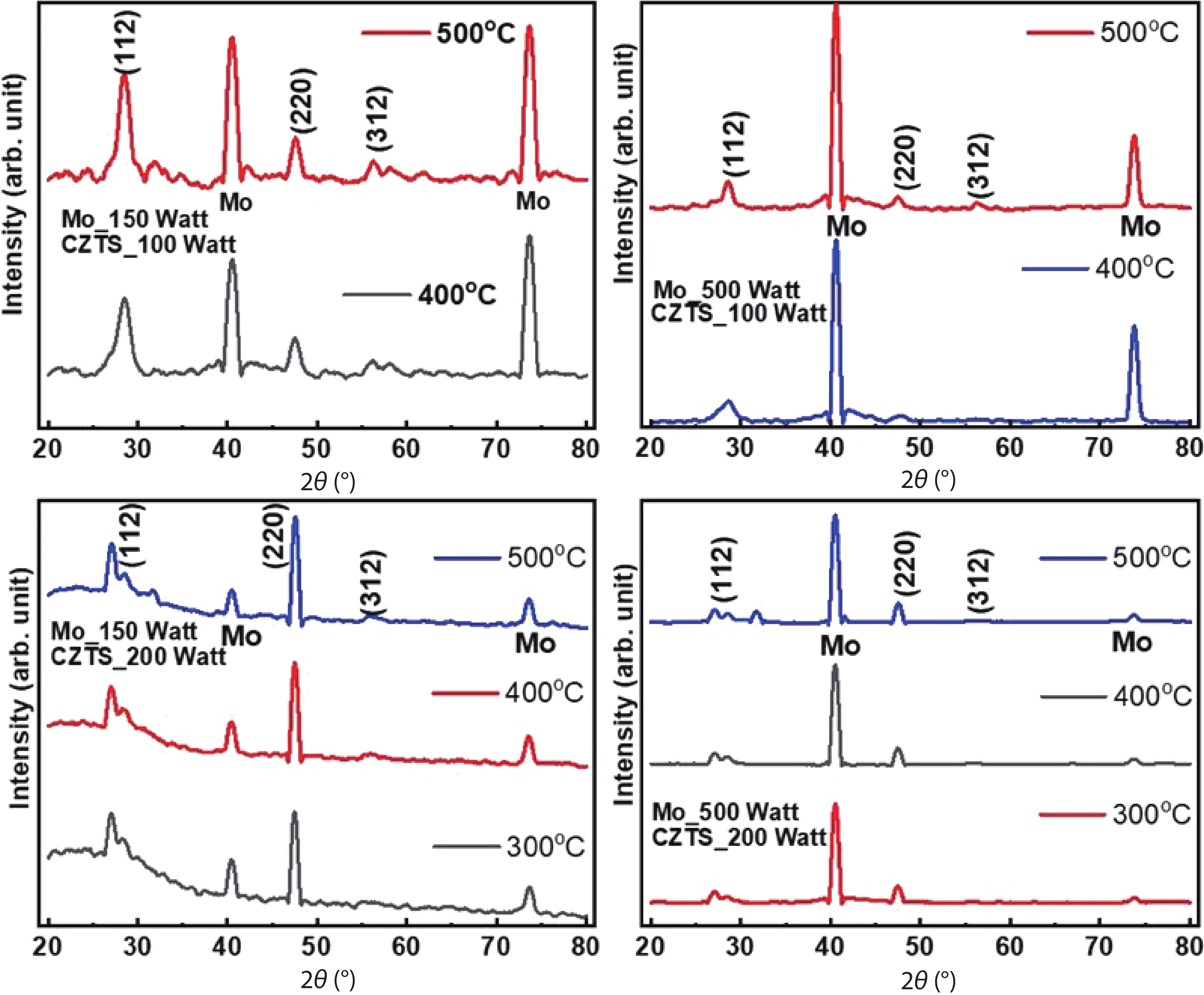 Fig. 2.  (Color online) X ray diffractograms of CZTS/Mo heterojunction deposited at various deposition powers and treated at RTP temperatures.
