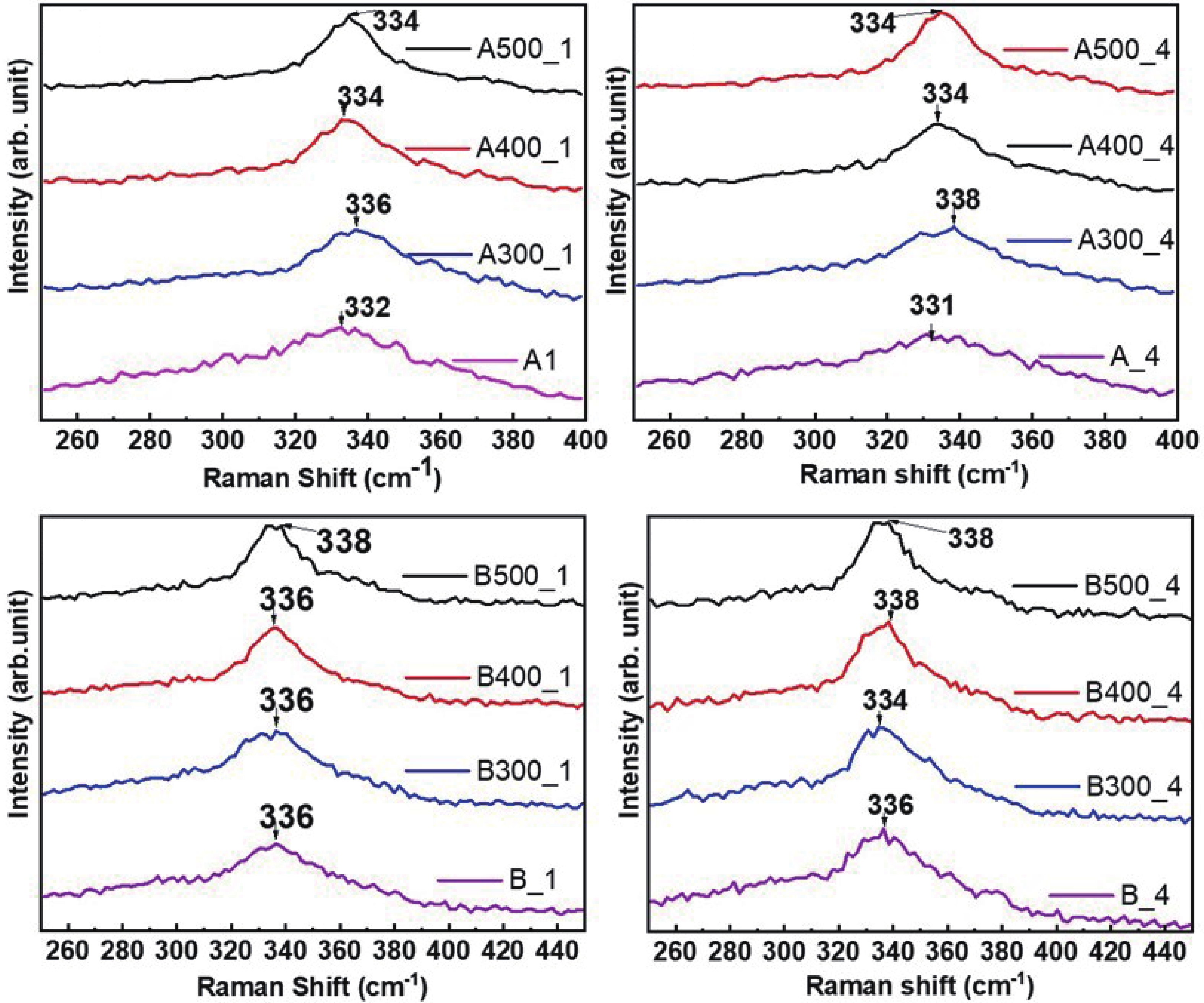 Fig. 3.  (Color online) Raman spectrographs of CZTS thin films grown at different experimental conditions.