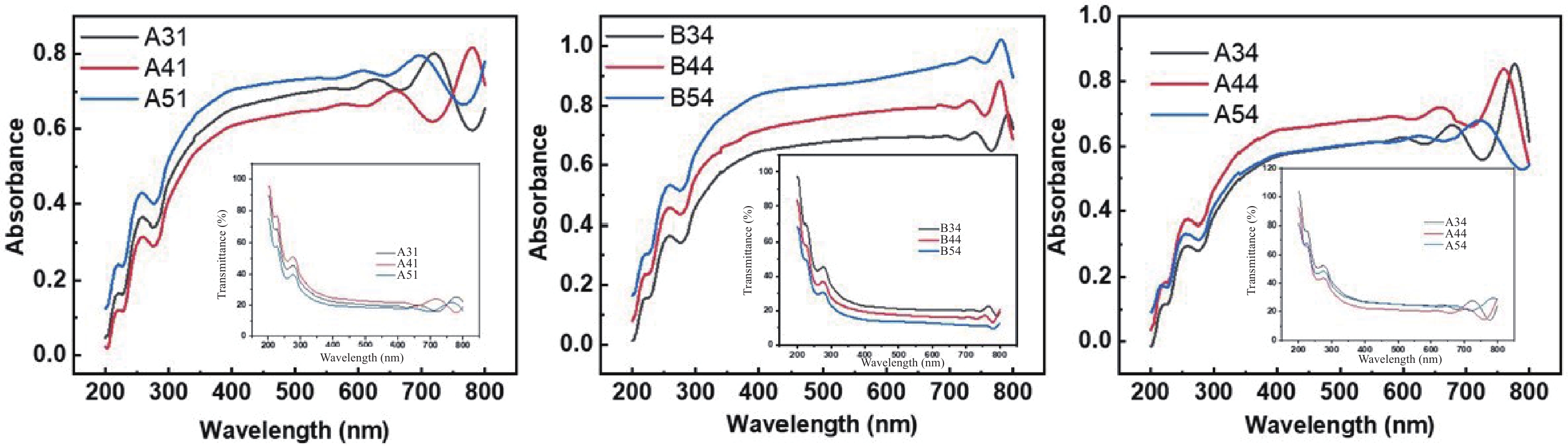 Fig. 6.  (Color online) Absorbance and transmittance plots of CZTS deposited at different RTP conditions.