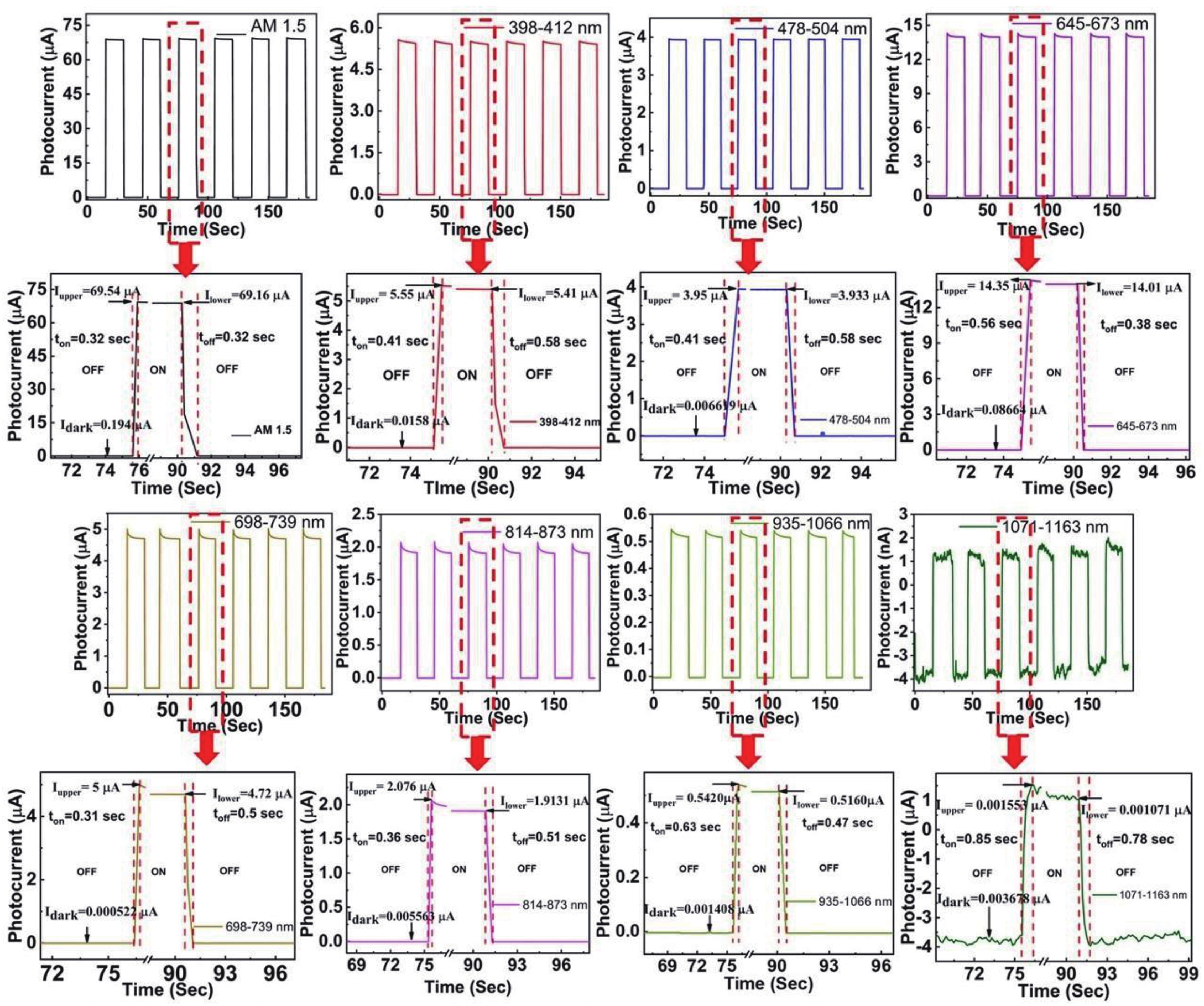 Fig. 9.  (Color online) Photoresponse, dark current, photocurrent, rise time, fall time of CZTS based nanosystems with CdS deposited for 5 min.