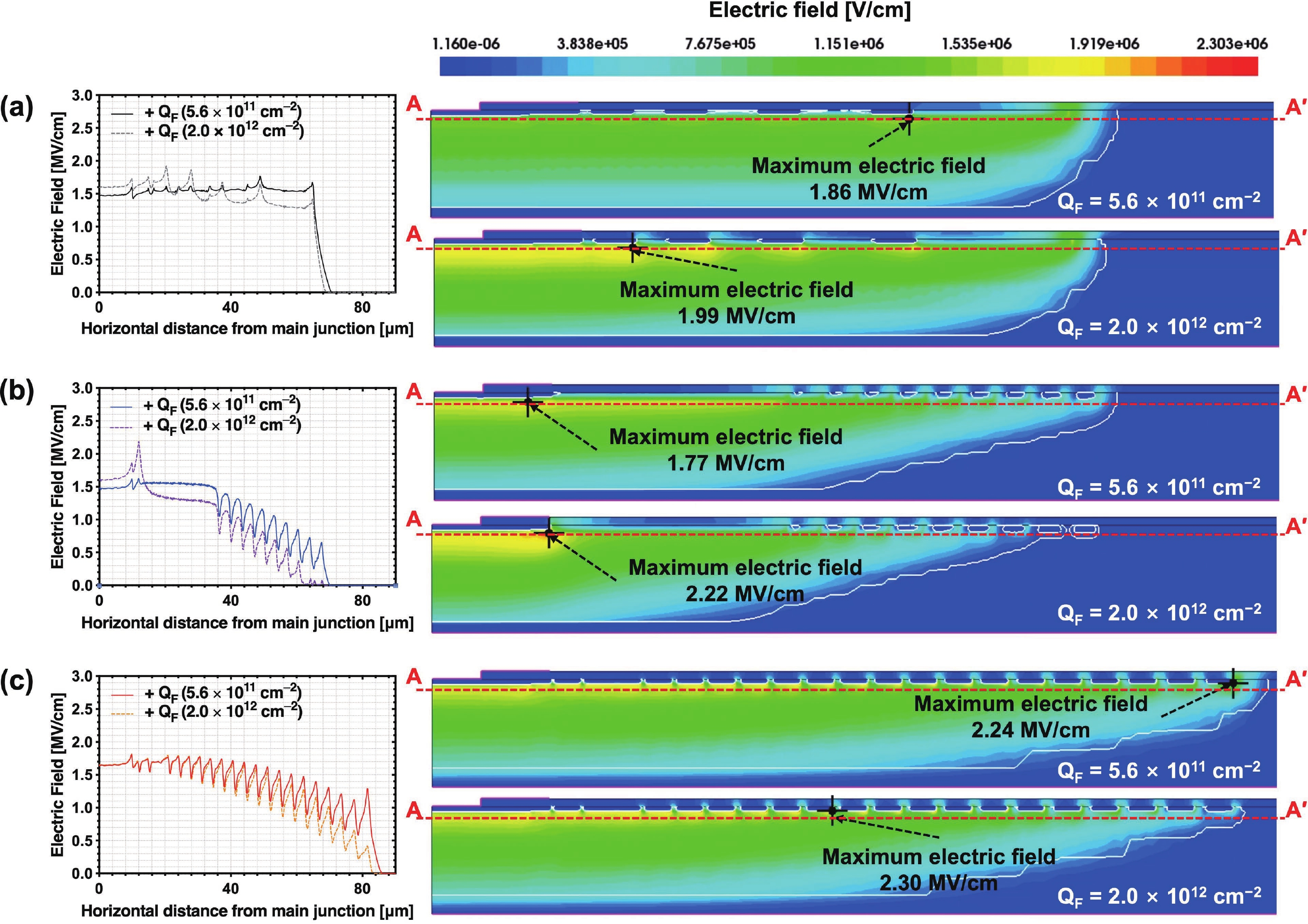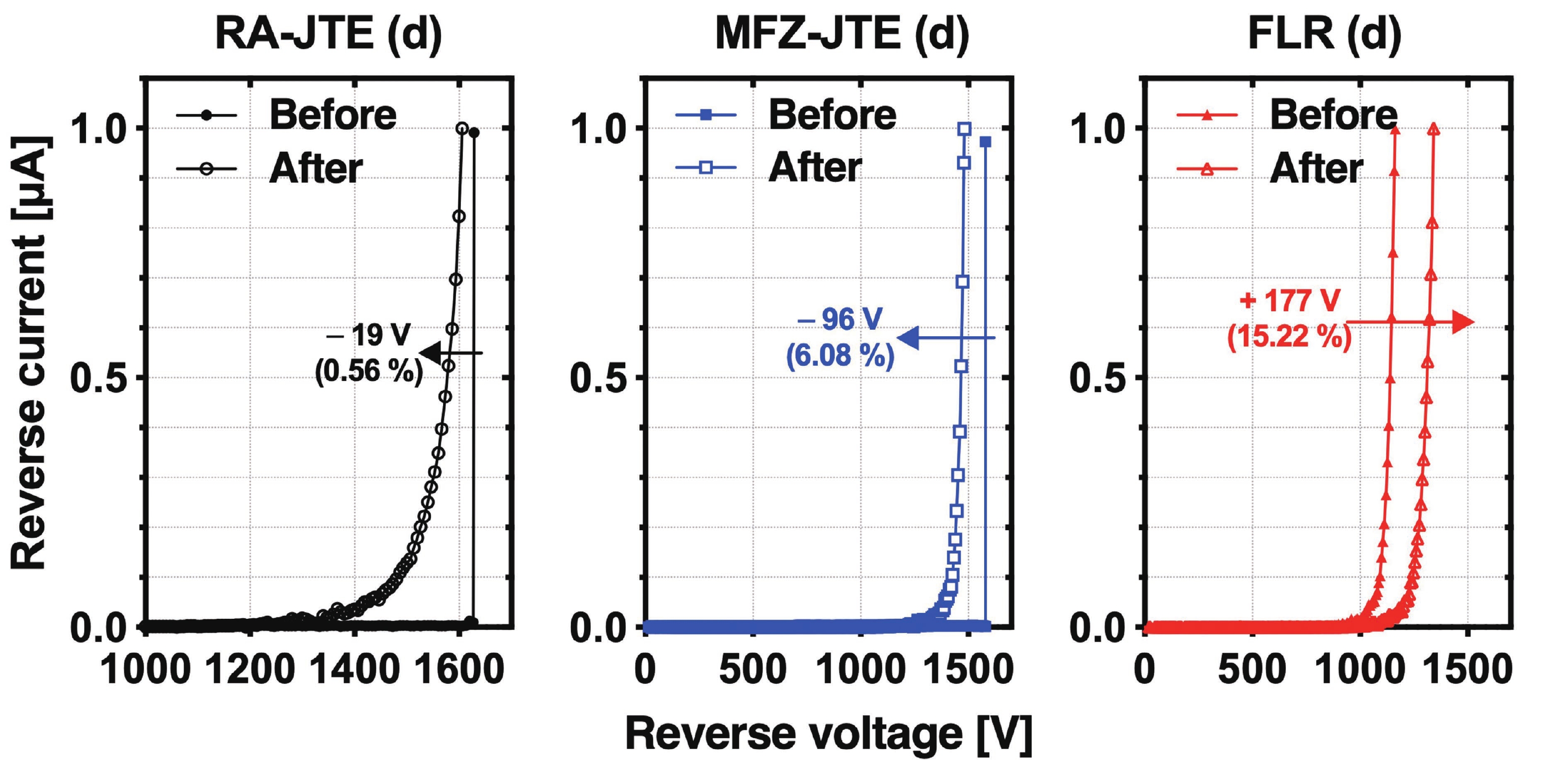 Abstract: This work presents a systematic analysis of proton-induced total ionizing dose (TID) effects in 1.2 kV silicon carbide (SiC) power devices with various edge termination structures. Three edge terminations including ring-assisted junction termination extension (RA-JTE), multiple floating zone JTE (MFZ-JTE), and field limiting rings (FLR) were fabricated and irradiated with 45 MeV protons at fluences ranging from 1 × 1012 to 1 × 1014 cm?2. Experimental results, supported by TCAD simulations, show that the RA-JTE structure maintained stable breakdown performance with less than 1% variation due to its effective electric field redistribution by multiple P+ rings. In contrast, MFZ-JTE and FLR exhibit breakdown voltage shifts of 6.1% and 15.2%, respectively, under the highest fluence. These results demonstrate the superior radiation tolerance of the RA-JTE structure under TID conditions and provide practical design guidance for radiation-hardened SiC power devices in space and other high-radiation environments.