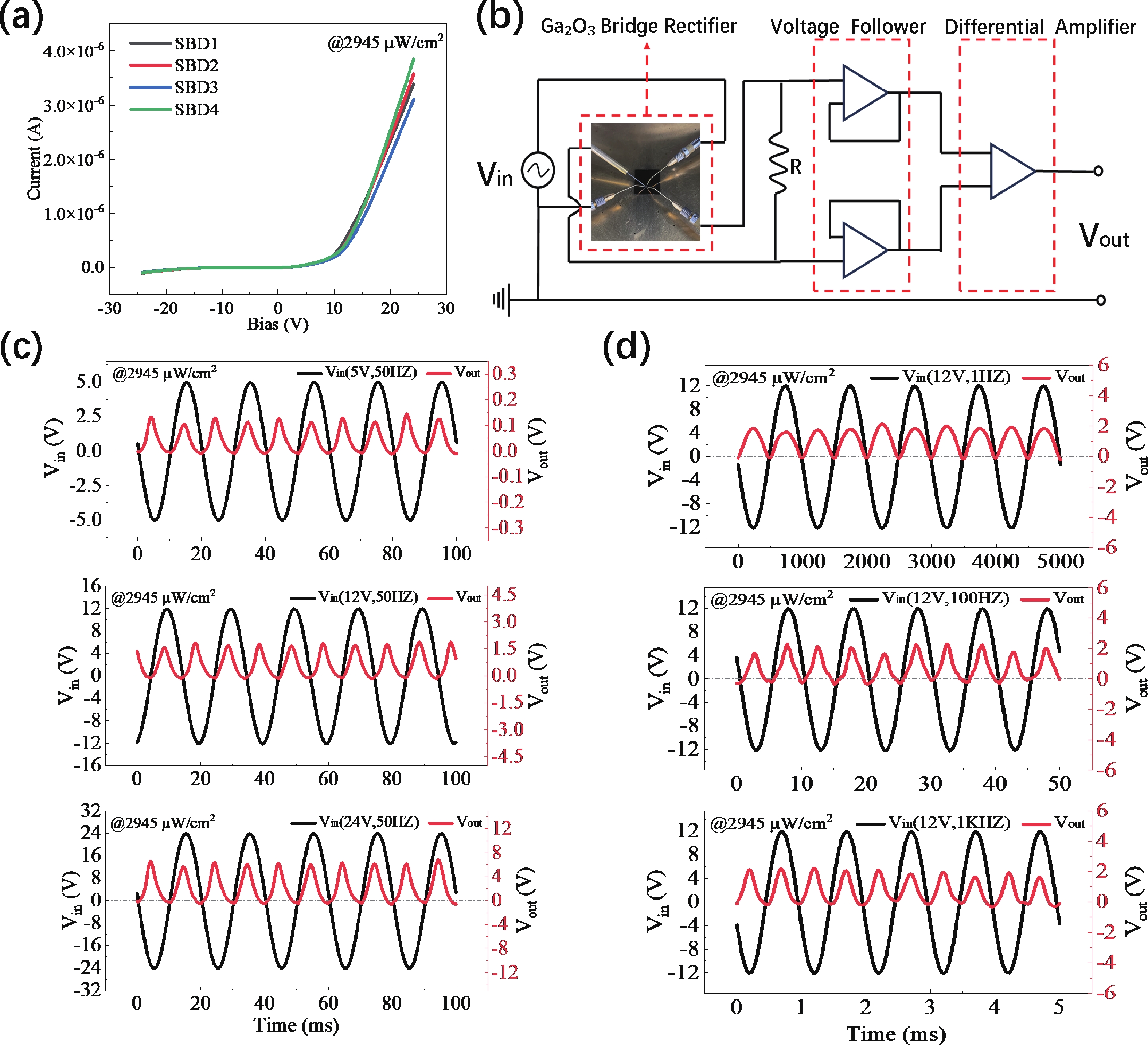 Haifeng Chen, Yuduo Zhang, Xiexin Sun, Jingguo Zong, Qin Lu, Yifan Jia, Zhenfu Feng, Zhan Wang, Lijun Li, Xiangtai Liu, Shaoqing Wang, Yue Hao. Solar-blind UV light-modulated β-Ga2O3 full-wave bridge rectifier[J]. Journal of Semiconductors, 2026, 47(1): 012301. doi: 10.1088/1674-4926/25040027