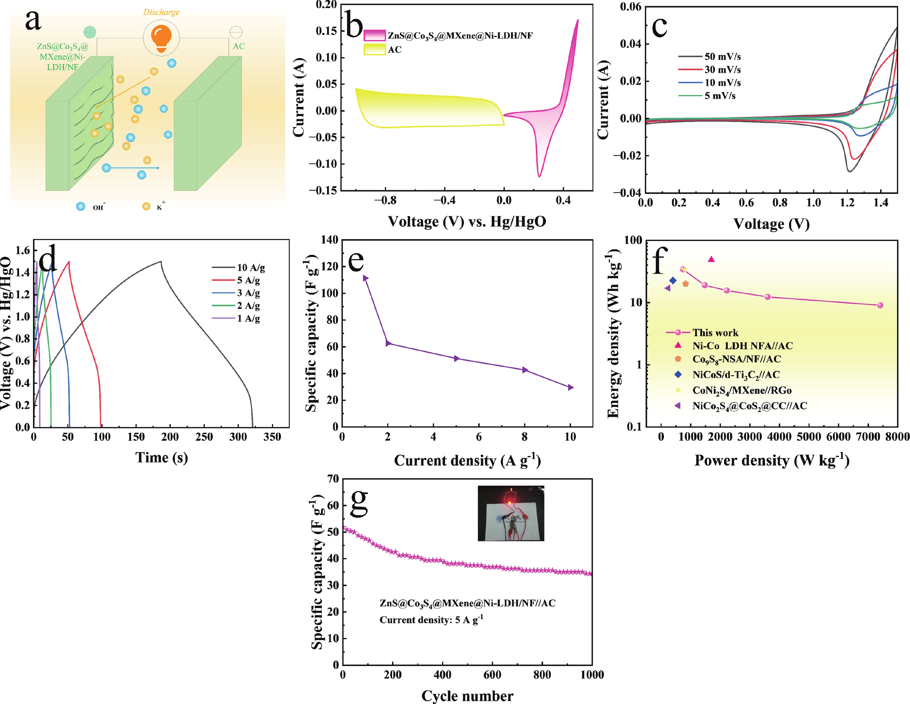 Abstract: Zeolite imidazolate framework (ZIF)-derived bimetallic sulfides and layered double hydroxides (LDHs) have emerged as promising electrode materials for supercapacitors, owing to their porous layered structures, high electrochemical activity, tunable molecular architectures, low cost, and high specific capacitance. In this study, a unique composite material comprising ZIF-derived ZnCo bimetallic sulfide and LDH with a honeycomb-like structure was in situ grown on nickel foil (NF) via a controlled self-sacrificial template strategy. In contrast to previous reports, the resulting ZnS@Co3S4@MXene@Ni-LDH/NF composite integrates the advantages of MXene, LDH, and sulfides, leading to significantly enhanced conductivity, structural stability, and catalytic activity. The ZnS@Co3S4@MXene@Ni-LDH/NF electrode exhibits a uniform network structure with a thickness of approximately 1 μm coated on NF, and delivers a high specific capacitance of 1356.1 F·g?1 at a current density of 2 A·g?1. Furthermore, an asymmetric supercapacitor assembled with ZnS@Co3S4@MXene@Ni-LDH/NF as the positive electrode and activated carbon as the negative electrode achieves a high energy density of 34.08 Wh·kg?1 and a power density of 742.3 W·kg?1 at 1 A·g?1. This device successfully powers LED lights for 5 min, demonstrating its practical applicability. These results underscore the outstanding electrochemical performance of the ZnS@Co3S4@MXene@Ni-LDH/NF electrode, highlighting its potential for applications in supercapacitors and related energy storage fields.