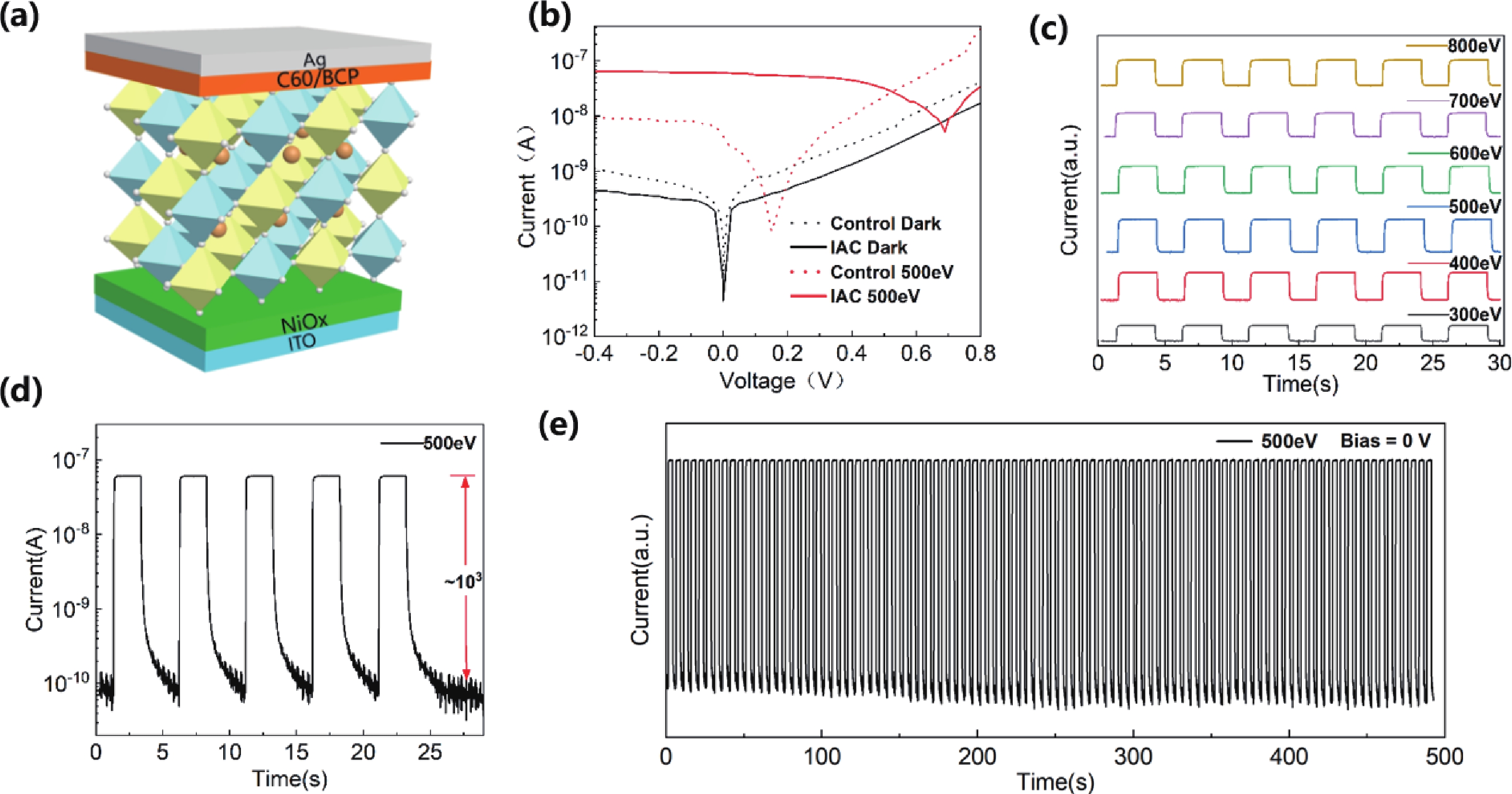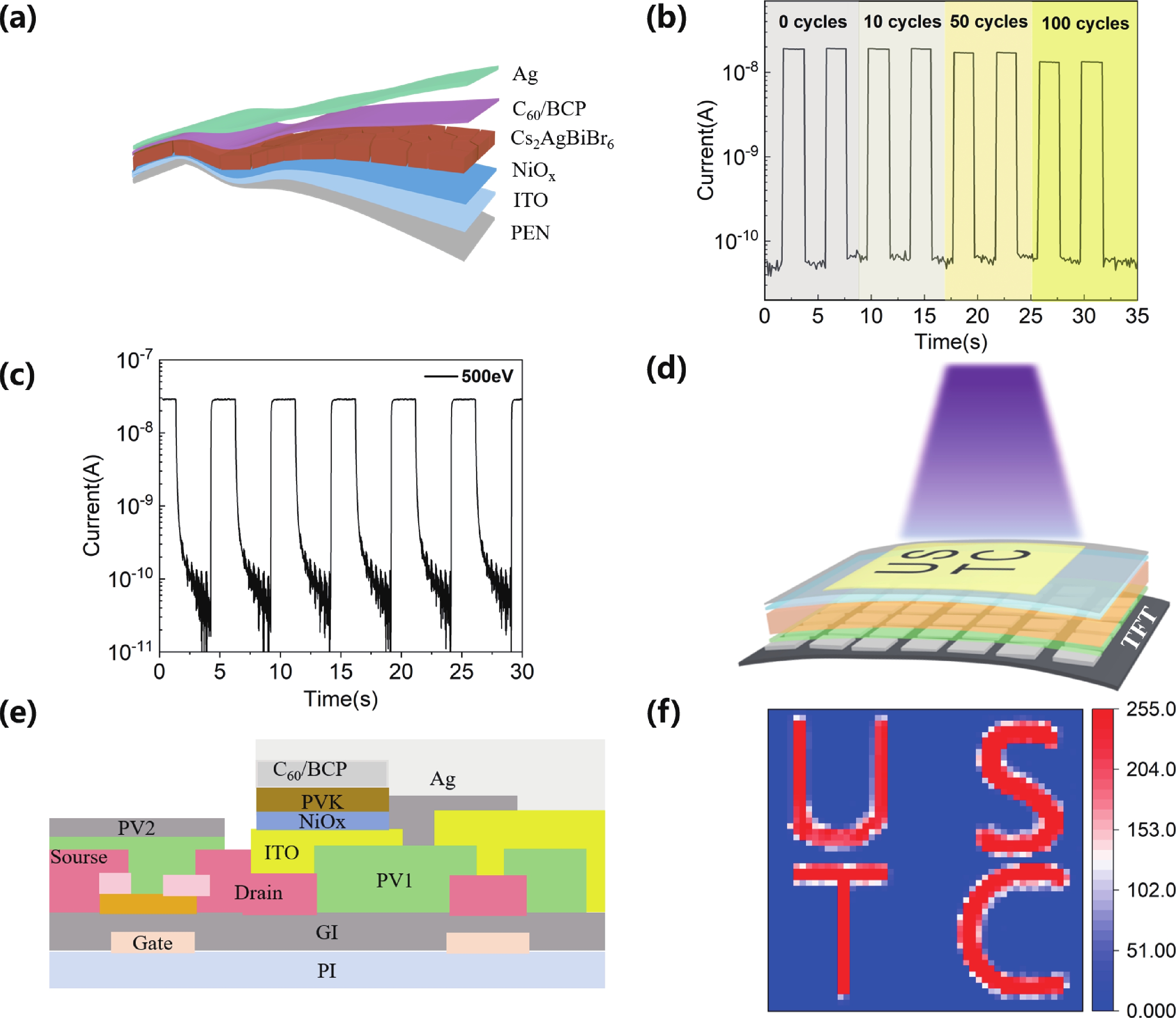 Abstract: Soft X-ray detectors play a vital role in materials science, high-energy physics and medical imaging. Cs2AgBiBr6, a lead-free double perovskite, has gained attention for its excellent optoelectronic properties, stability, and nontoxicity. However, its fast crystallization and requirement for high-temperature annealing (>250 °C) often lead to inferior film quality, limiting its application in flexible devices. This study introduces an alloying strategy that significantly improves the quality of Cs2AgBiBr6 thin films annealed at a reduced temperature of 150 °C. Devices based on the alloyed thin films exhibit an ultra-low dark current of 0.32 nA?cm?2 and a quantum efficiency of 725%. Furthermore, the first successful integration of Cs2AgBiBr6 with a thin-film transistor backplane demonstrates its superior imaging performance, indicating that Cs2AgBiBr6 is a promising material for next-generation soft X-ray sensors.