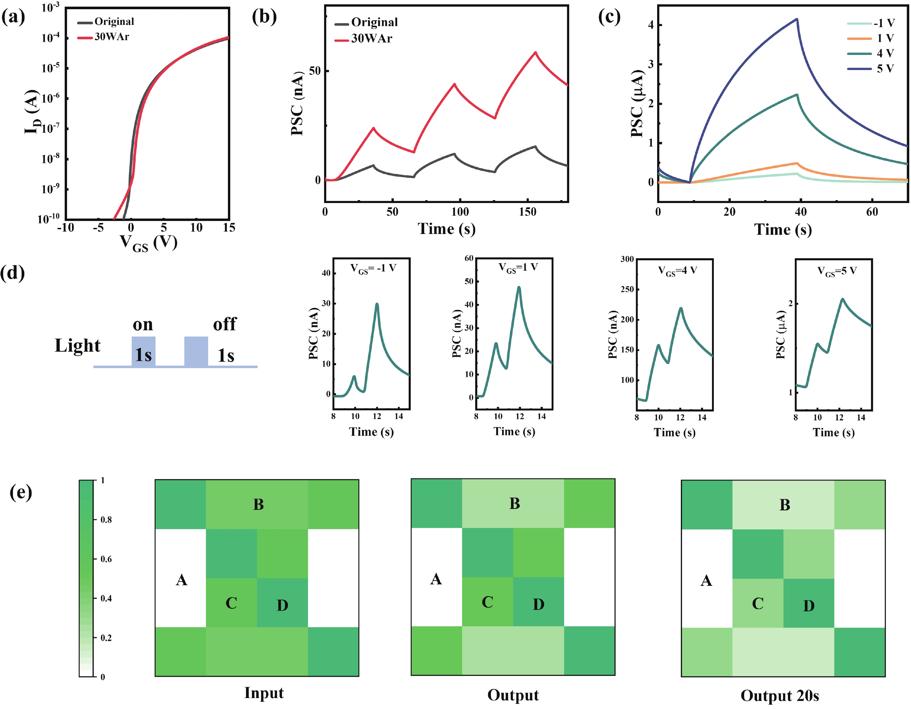 Abstract: Oxide semiconductor-based neuromorphic devices hold great potential for visual information processing, yet their performance is critically limited by photolithography-induced organic residues. This work systematically investigates the effects of photoresist contaminants on In?Ga?Zn?O thin-film transistors (IGZO TFTs), revealing that these residues introduce deep-level trap states that degrade both photo-responsivity and carrier transport dynamics. Through optimized plasma-assisted surface treatments, these adverse effects would be effectively eliminated. Additionally, we show that gate?voltage modulation can precisely control the relaxation kinetics of photocarriers in these devices. By applying these strategies to IGZO-based synaptic arrays, we achieve enhanced image contrast through controlled optoelectronic response modulation. Overall, our findings highlight the critical impact of photolithography-induced organic residues in IGZO optoelectronic synaptic devices and demonstrate an effective approach for performance enhancement through surface plasma treatment and gate?voltage modulation.