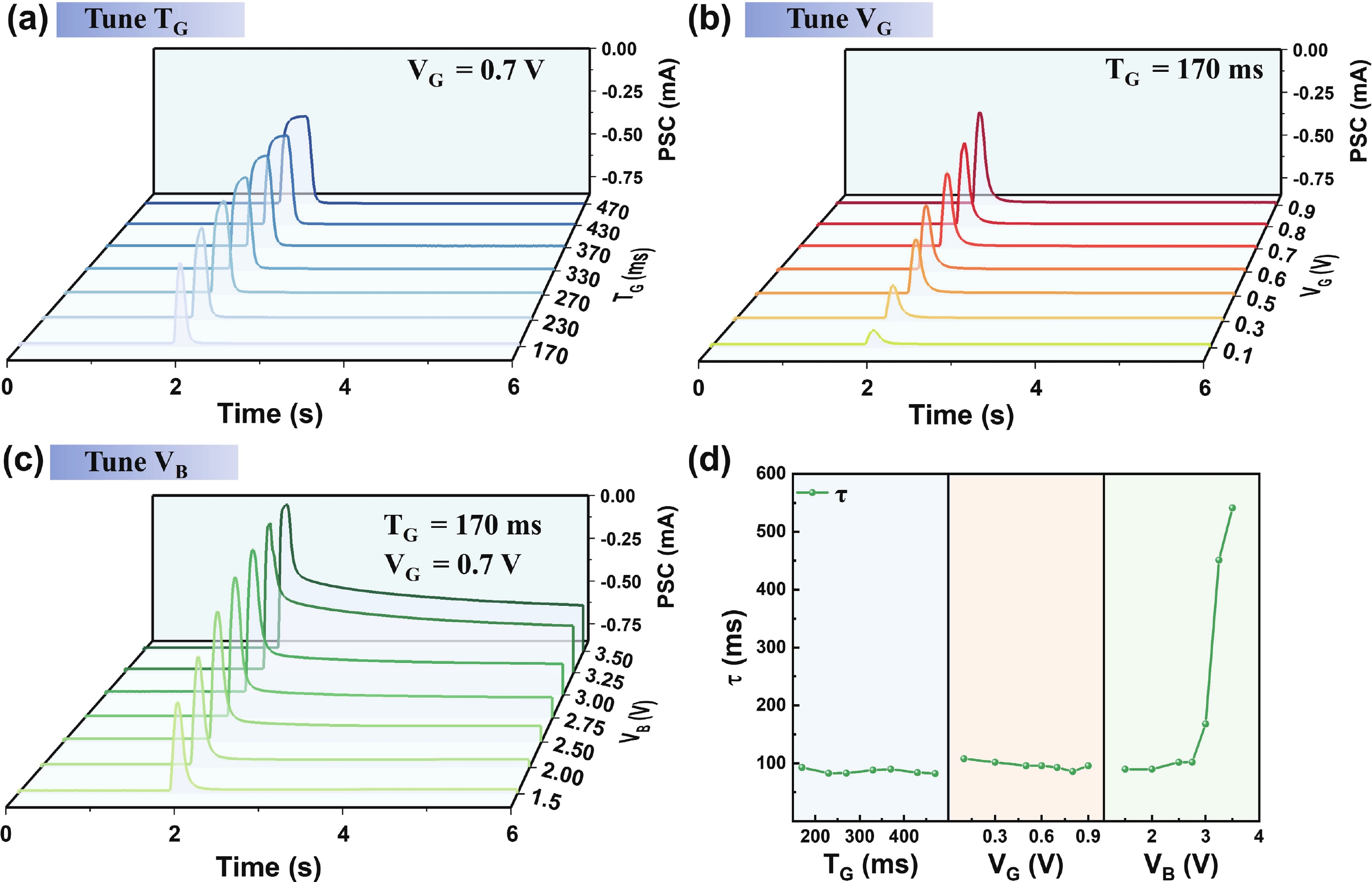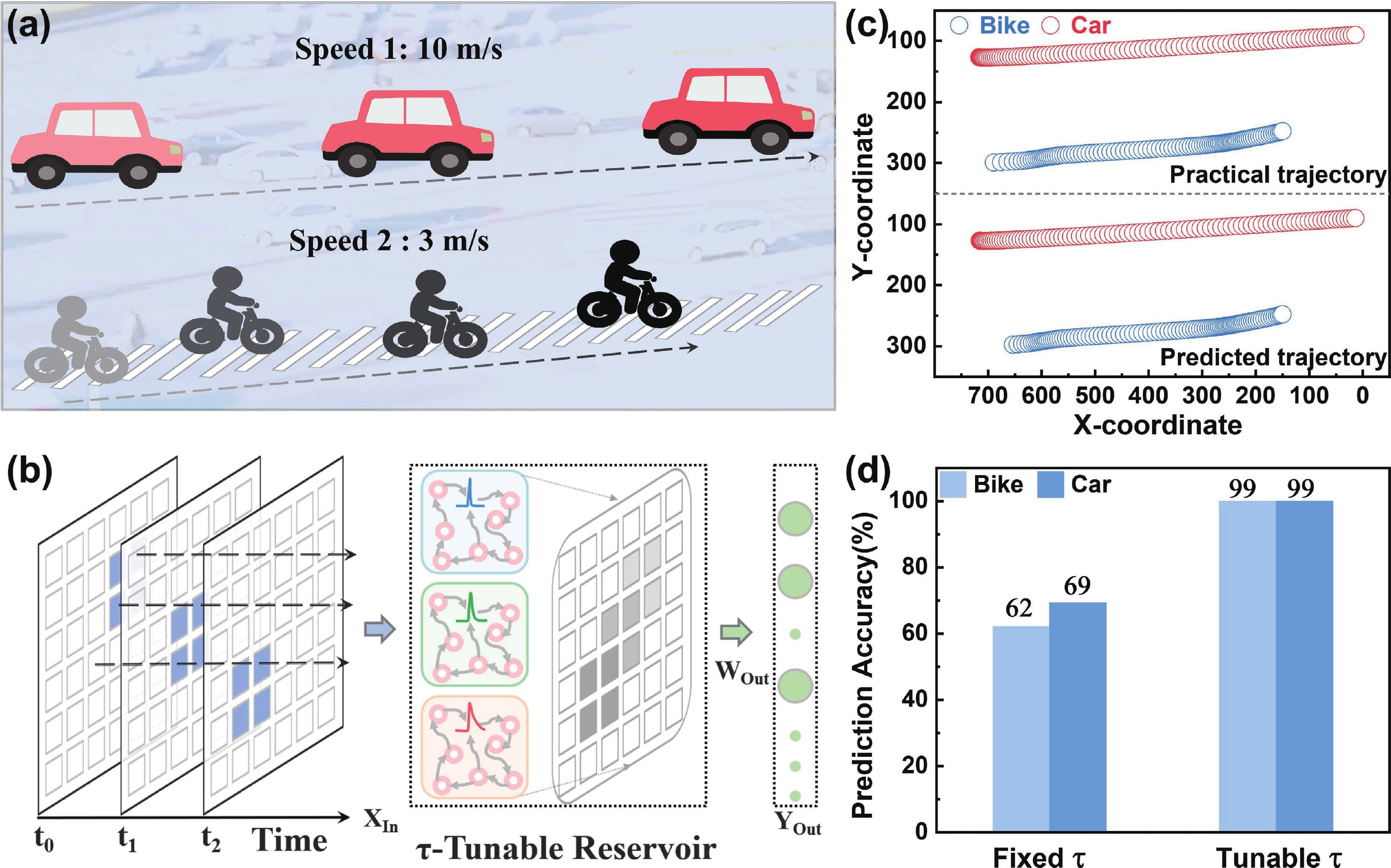 Abstract: Organic electrochemical transistor (OECT) devices demonstrate great promising potential for reservoir computing (RC) systems, but their lack of tunable dynamic characteristics limits their application in multi-temporal scale tasks. In this study, we report an OECT-based neuromorphic device with tunable relaxation time (τ) by introducing an additional vertical back-gate electrode into a planar structure. The dual-gate design enables τ reconfiguration from 93 to 541 ms. The tunable relaxation behaviors can be attributed to the combined effects of planar-gate induced electrochemical doping and back-gate-induced electrostatic coupling, as verified by electrochemical impedance spectroscopy analysis. Furthermore, we used the τ-tunable OECT devices as physical reservoirs in the RC system for intelligent driving trajectory prediction, achieving a significant improvement in prediction accuracy from below 69% to 99%. The results demonstrate that the τ-tunable OECT shows a promising candidate for multi-temporal scale neuromorphic computing applications.