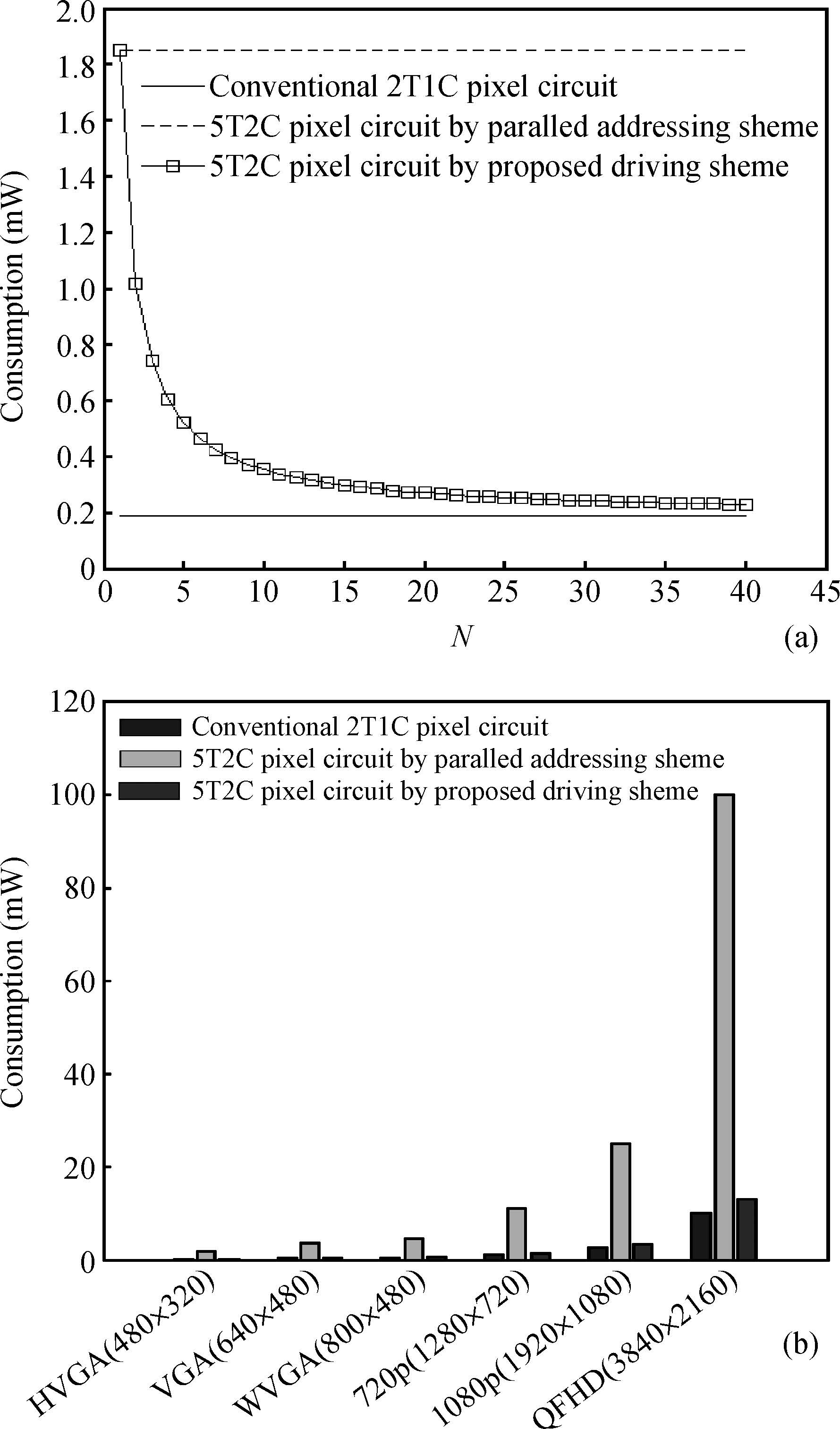 Abstract: A new voltage-programmed driving scheme named the mixed parallel addressing scheme is presented for AMOLED displays, in which one compensation interval can be divided into the first compensation frame and the consequent N-1 post-compensation frames without periods of initialization and threshold voltage detection. The proposed driving scheme has the advantages of both high speed and low driving power due to the mixture of the pipeline technology and the threshold voltage one-time detection technology. Corresponding to the proposed driving scheme, we also propose a new voltage-programmed compensation pixel circuit, which consists of five TFTs and two capacitors(5T2C). In-Zn-O thin-film transistors(IZO TFTs) are used to build the proposed 5T2C pixel circuit. It is shown that the non-uniformity of the proposed pixel circuit is considerably reduced compared with that of the conventional 2T1C pixel circuit. The number of frames(N) preserved in the proposed driving scheme are measured and can be up to 35 with the variation of the OLED current remaining in an acceptable range. Moreover, the proposed voltage-programmed driving scheme can be more valuable for an AMOLED display with high resolution, and may also be applied to other compensation pixel circuits.