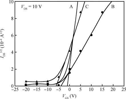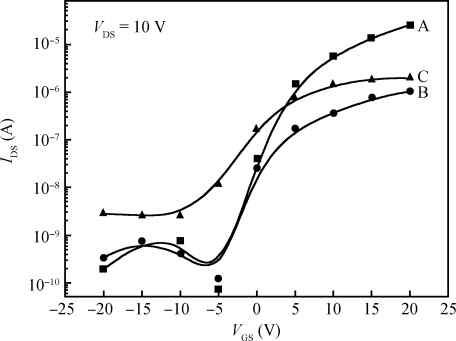 Abstract: Yttrium-doped IZO (YIZO) thin films with different thickness have been prepared on soda-lime glass (SLG) and P-Si substrates by radio frequency magnetron sputtering at room temperature. Structural morphology and optical properties of the films have been investigated. YIZO thin film transistors (TFTs) with the bottom-gate-structure are fabricated on P-Si substrates. The output and transfer characteristics of YIZO-TFT have been studied. It has been found that all YIZO thin films prepared at room temperature are amorphous, and the YIZO TFTs exhibit n-channel depletion mode. YIZO-TFT with active layer thickness of 20 nm shows an on/off ratio over 105, a sub-threshold swing of 2.20 V/decade at a low operating voltage of -1.0 V, and saturation mobility values over 0.57 cm2/(V· s).