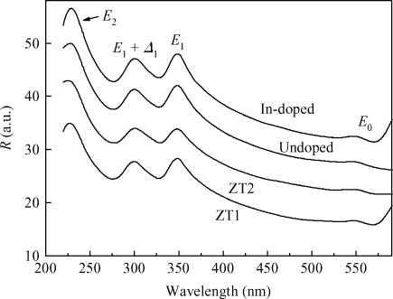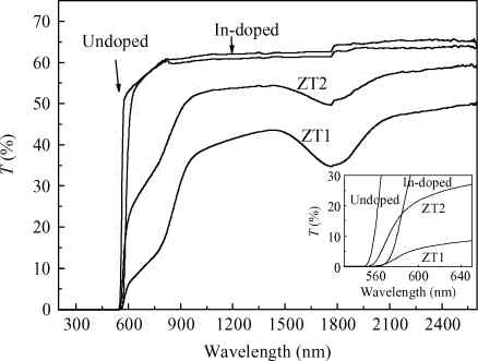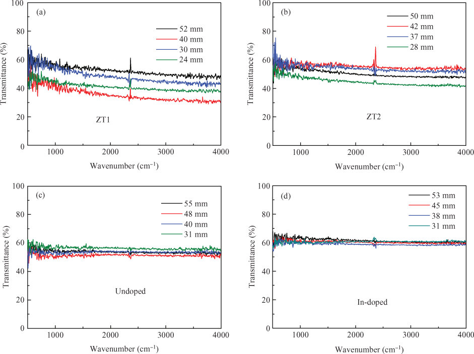 Abstract: The properties of undoped, Cr-doped, and In-doped bulk ZnTe crystals grown by the TGSG method were compared. Cr/In-doping leads to a slight red-shift of the absorption edge. Cr-doping also creates two characteristic absorption bands, centered at about 1750 nm and beneath the fundamental absorption edge. However, the fundamental reflectance spectra are not sensitive to the dopants. The resistivity of undoped, Cr-doped, and In-doped ZnTe is about 102 Ω · cm, 103 Ω · cm, and 108 Ω · cm, respectively. Only In-doped ZnTe has an IR transmittance higher than 60% in the range of 500 to 4000 cm-1. However, the IR transmittance of Cr-doped ZnTe is very low and decreases greatly as the wavenumber increases, which is mainly attributed to the scattering effects caused by some defects generated by Cr-doping.