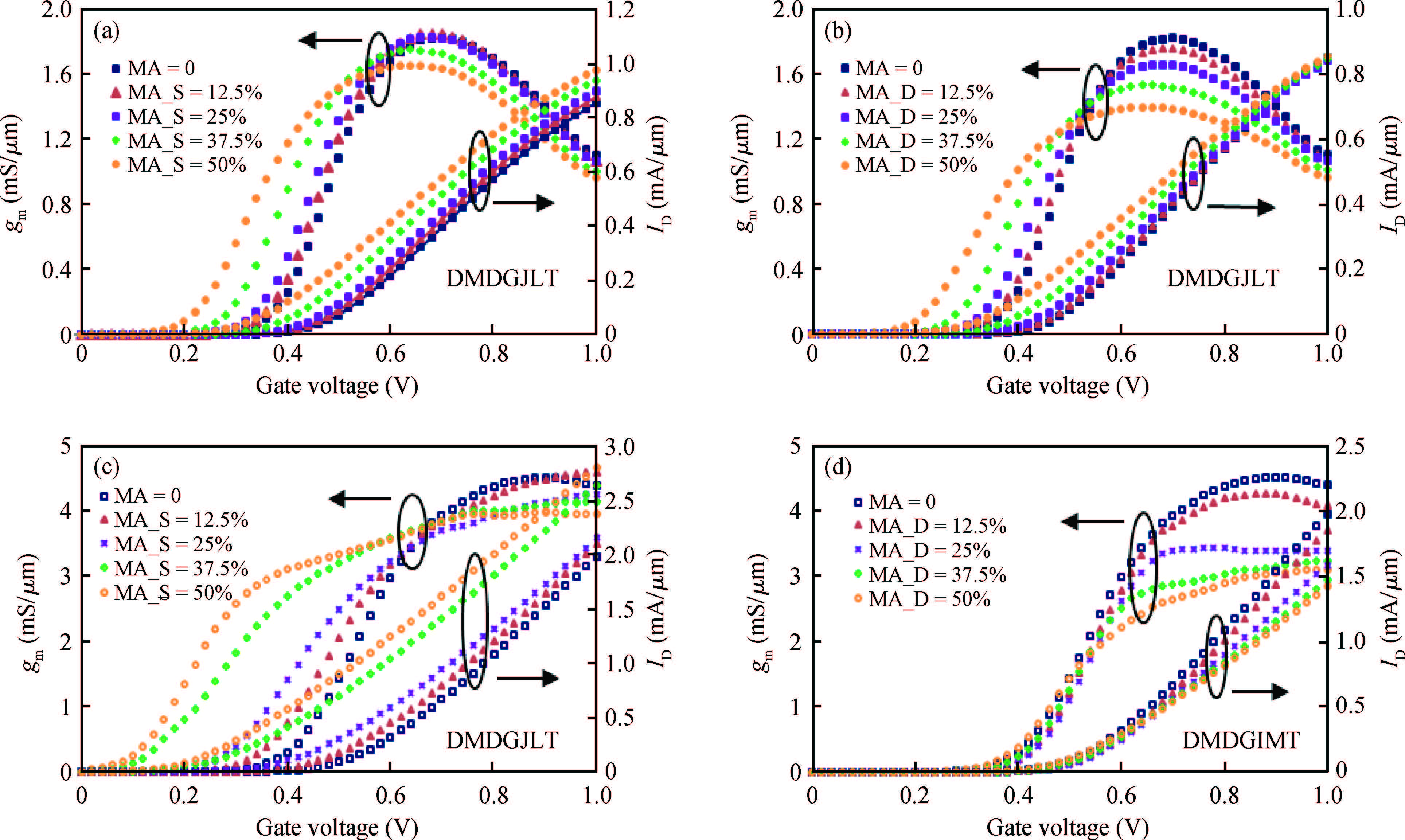Key words: dual material double gate (DMDG), junctionless transistor, inversion mode transistor, gate misalignment, analog FOMs