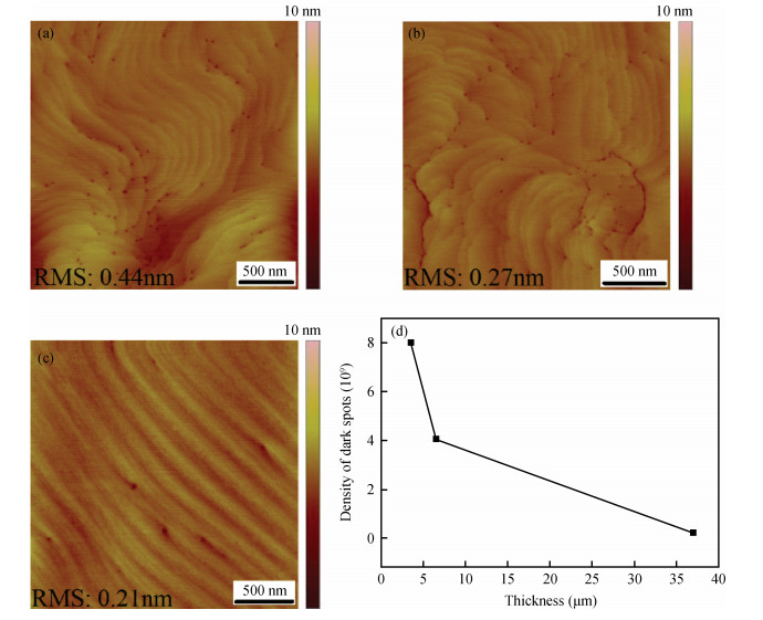 Abstract: AlN thick films were grown on c-plane sapphire substrates by hydride vapor phase epitaxy at high temperature. The evolution of the strain state and crystal quality of AlN with increase of thickness were investigated by transmission electron microscopy, field-emission scanning electron microscopy, Raman spectra and atomic force microscopy (AFM). As the thickness increased, the stress in the epilayers decreased gradually, which was attributed to the reaction of dislocations at the first several microns in thickness. When the thickness was more than 20 μm, the stress was almost fully relaxed due to the formation of cracks. Wet etching experiments indicated that the dislocation density decreased with the increase of thickness. The AFM images showed that the density of dark spots on the surface obviously decreased and the atomic steps became straight as the thickness increased.