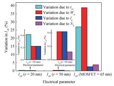 Fig. 12.  (Color online) Deviation in $I_{\rm {off}}$ current for JLDG VeSFET at $r =$ 20, 50 nm and MOSFET