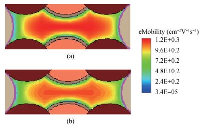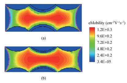 Fig. 2.  (Color online) Electron mobility distribution of the device with $\pm$ 3$\sigma $ variation in channel doping concentration. (a) 0.9 × 10$^{\mathrm{15}}$ cm$^{\mathrm{-3}}$. (b) 1.1 × 10$^{\mathrm{16}}$ cm$^{\mathrm{-3}}$
