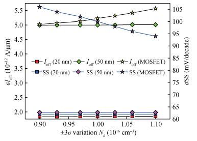 Fig. 7.  (Color online) Deviation in off current and subthreshold slope of the device JLDG VeSFET at $r= 20$, 50 nm and MOSFET (65 nm) with variation in channel doping concentration
