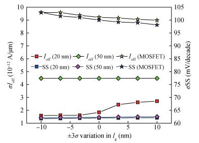 Fig. 9.  (Color online) Deviation in off current and subthreshold slope of the device JLDG VeSFET at $r =$ 20, 50 nm and MOSFET (65 nm) with variation in geometric gate length