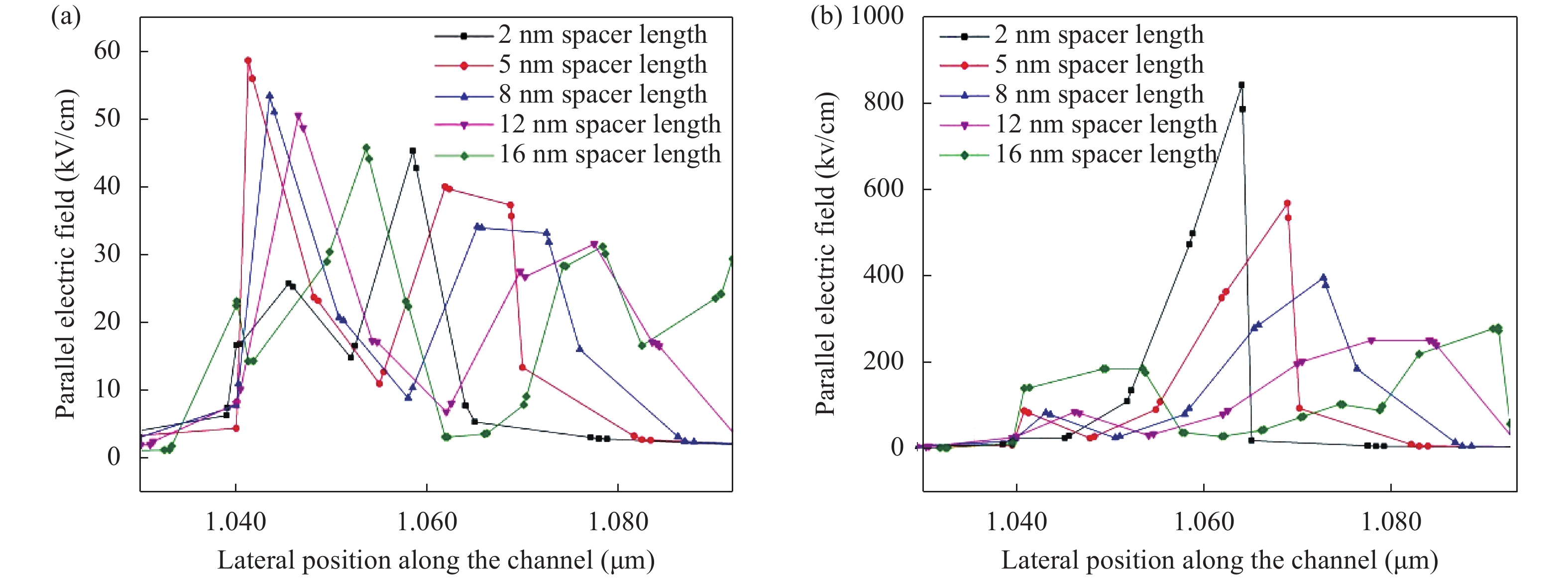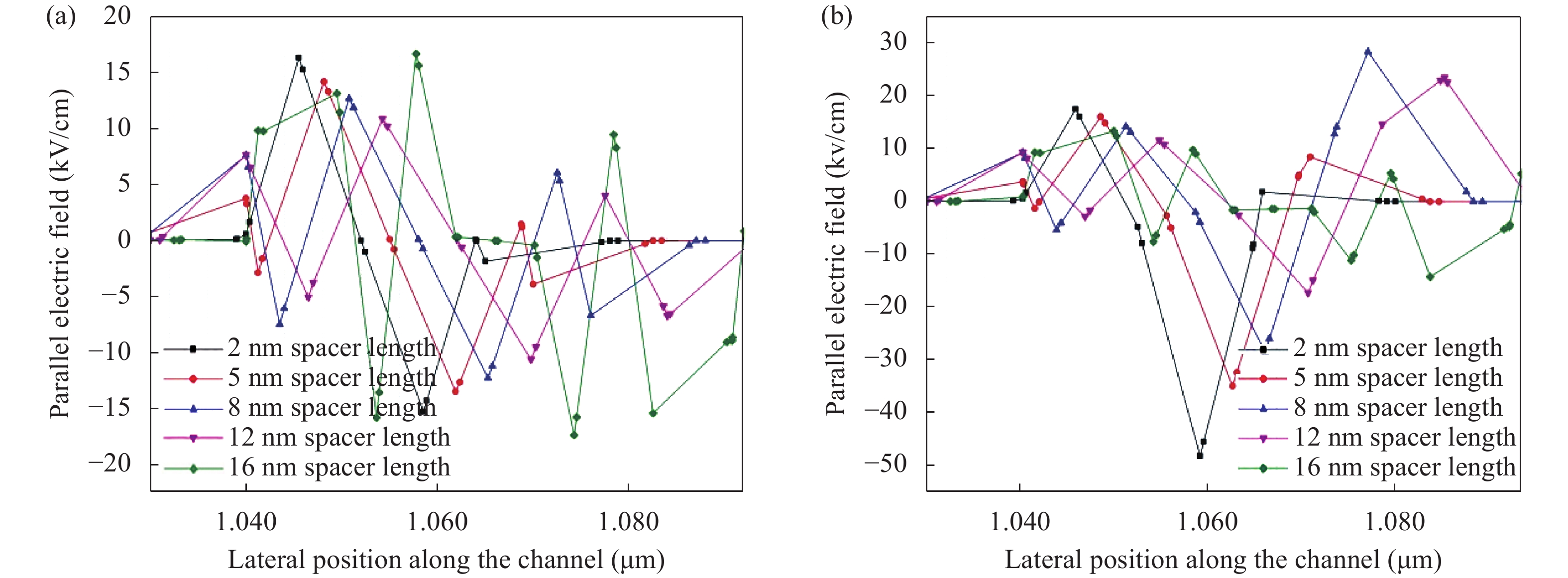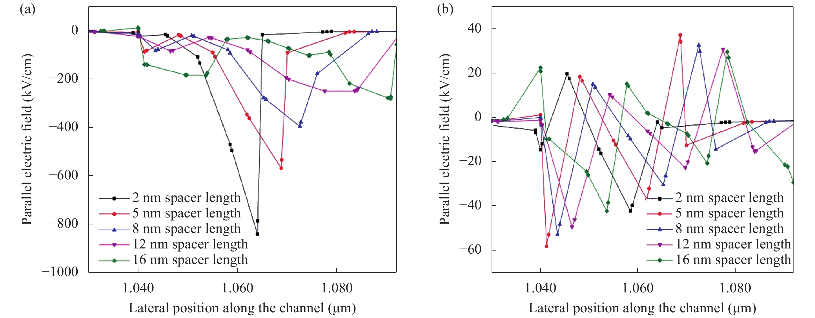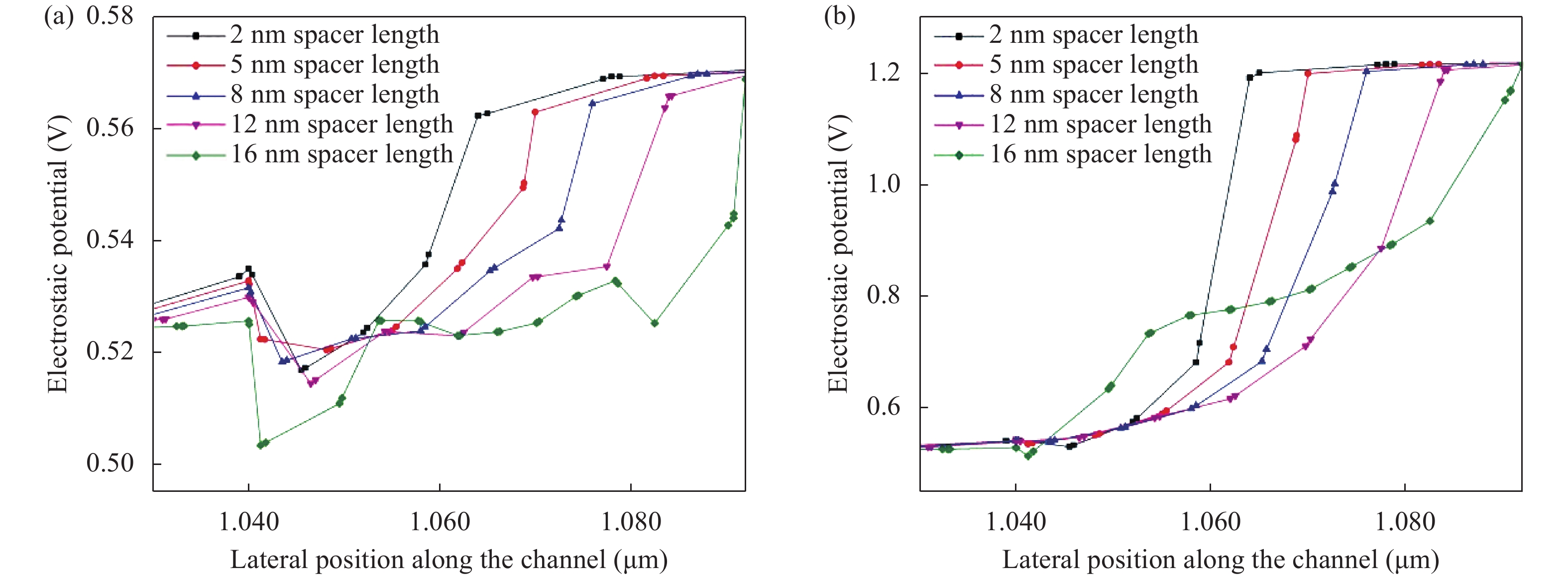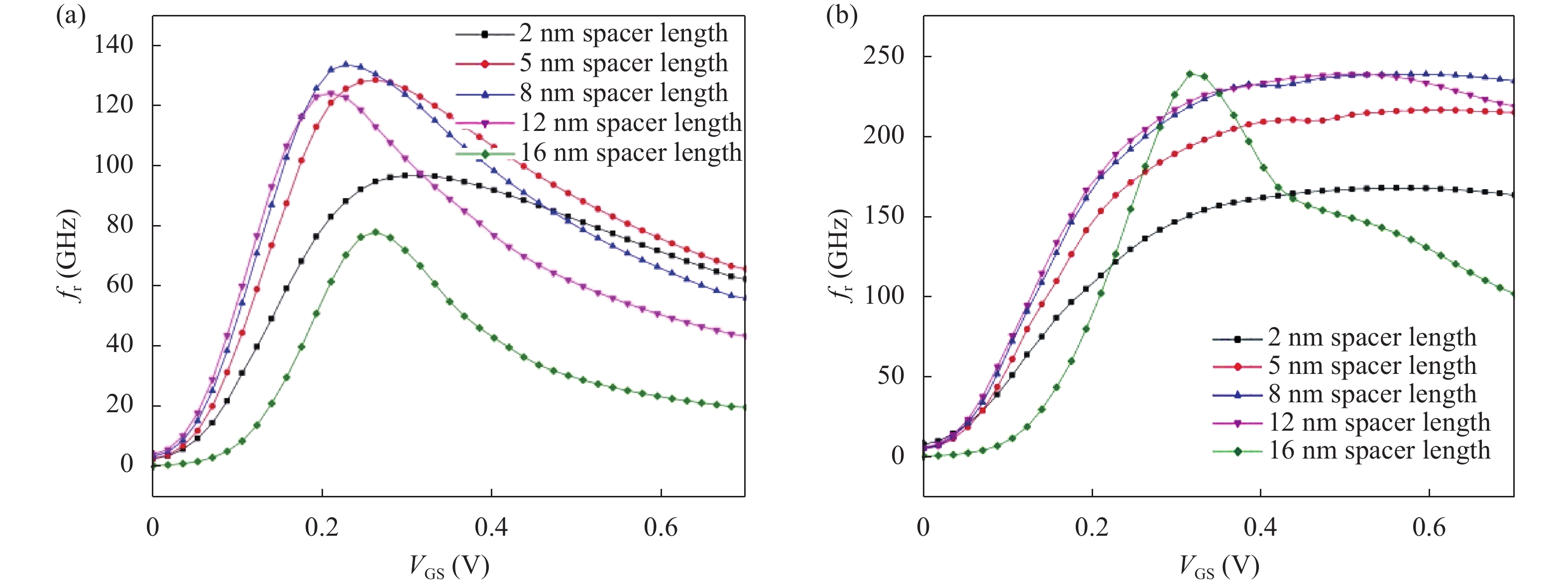 | Device spacer region, Lsp, hk | SS (mV/decade) | Ion (μA) | Ioff (nA) | Ion/Ioff | TGF (V?1) | gm (S) | gd (S) | Cgg (fF) | fT (GHz) | Gain, AV (gm/gd)(dB) |