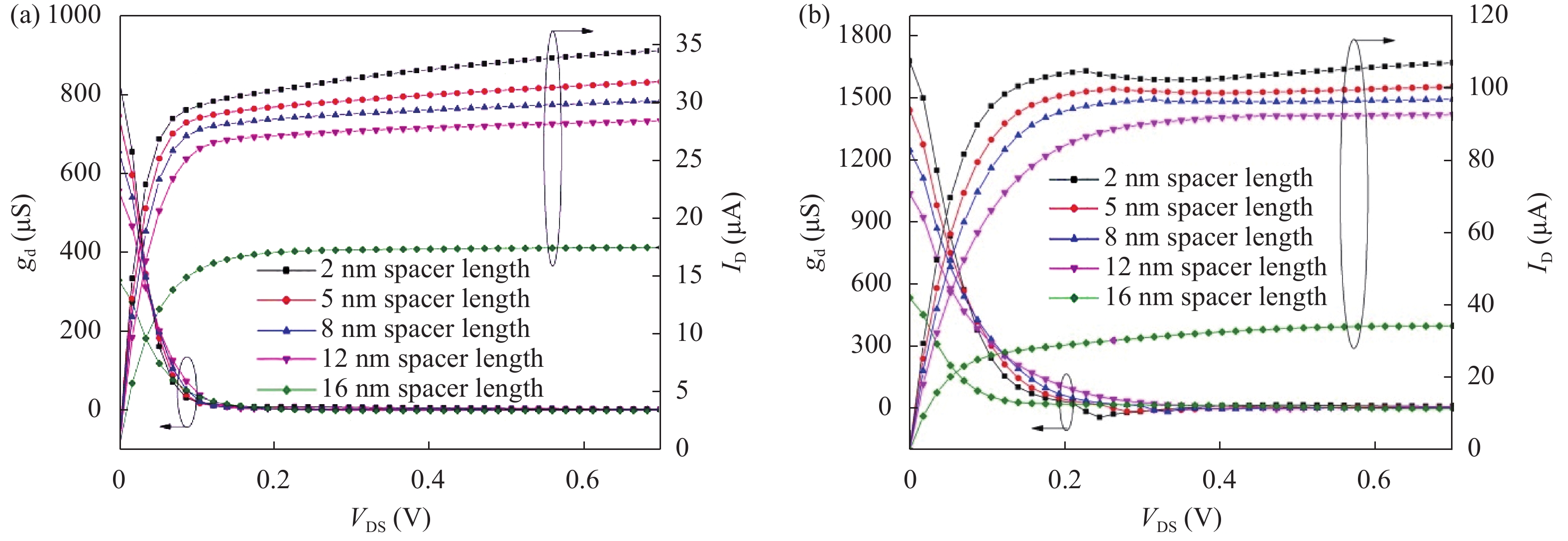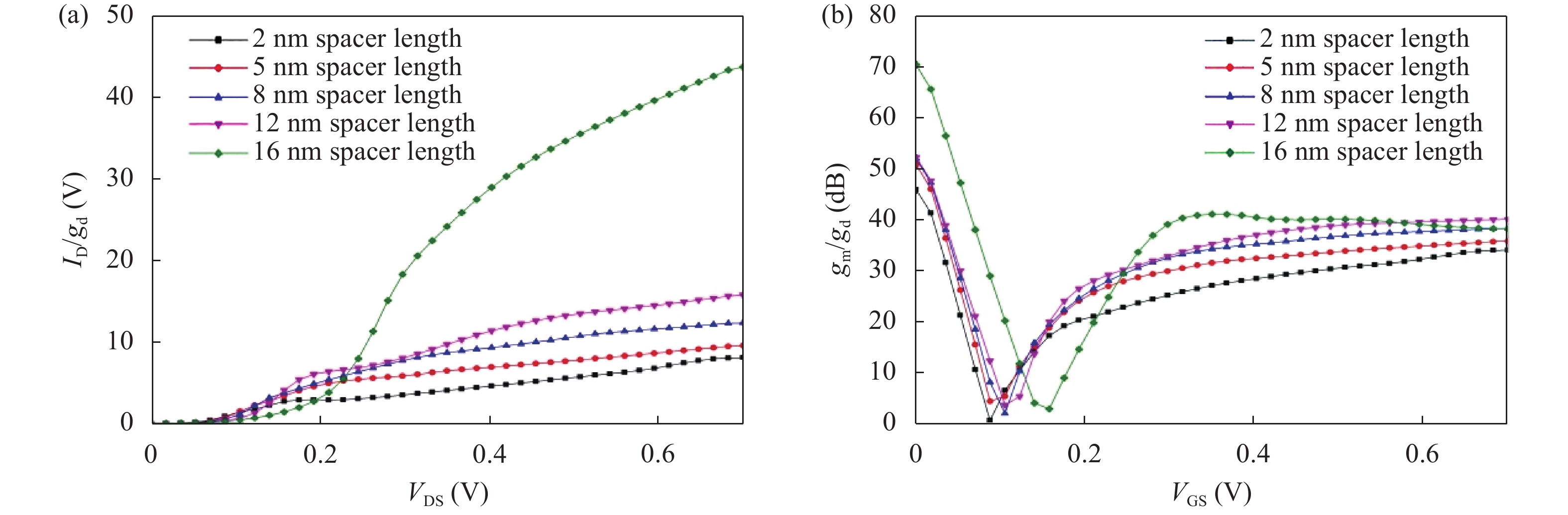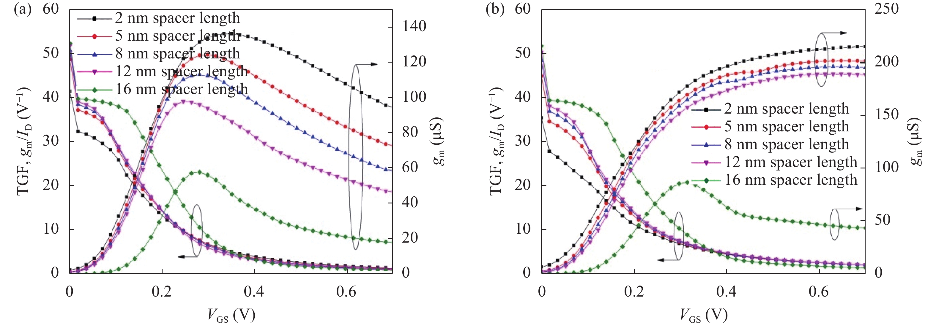 | Device spacer region, Lsp, hk | gm (S) | gd (S) | gm/gd (dB) | VEA (V) | TGF (V?1) | ||