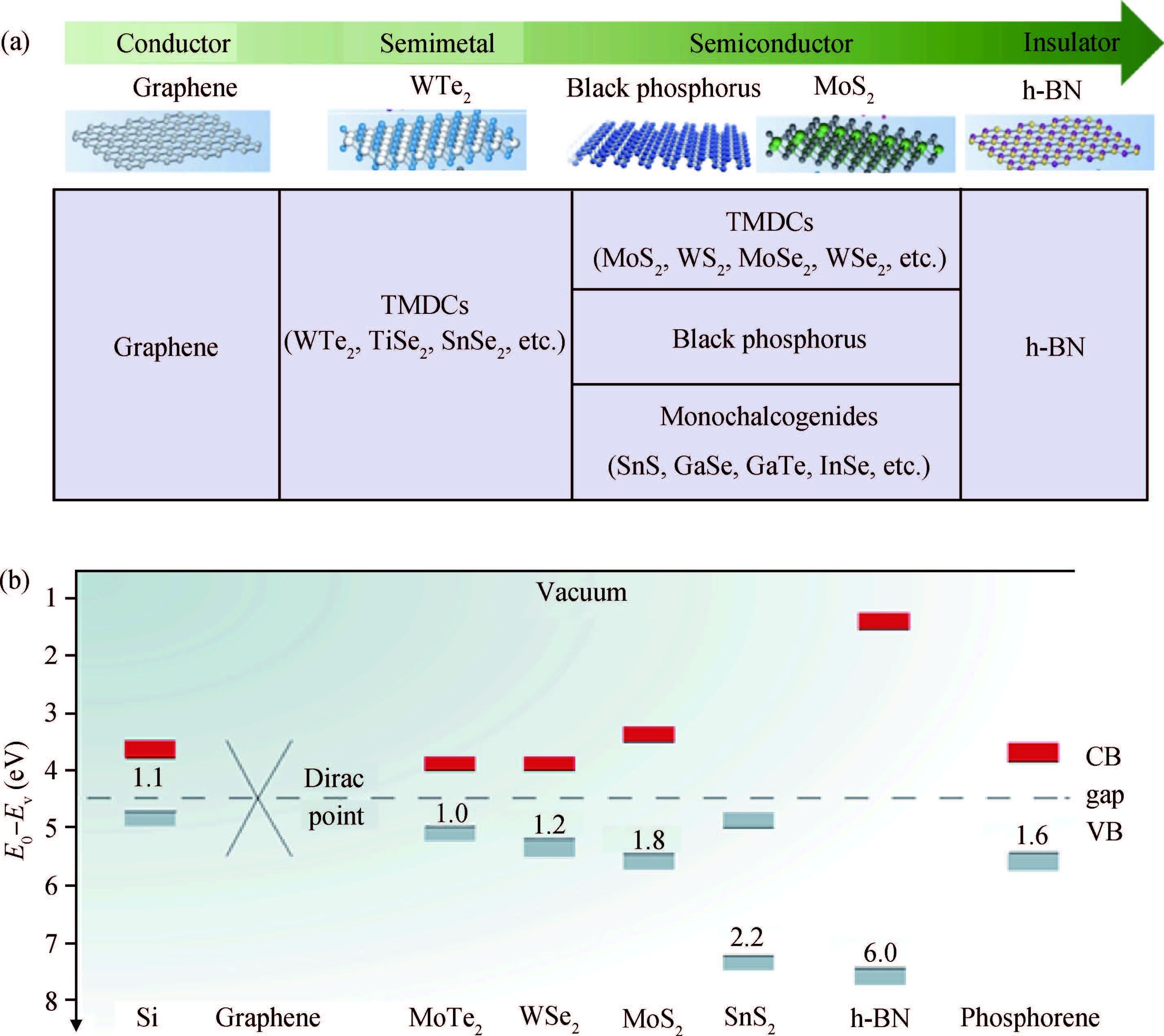 Fig. 1.  (Color online) The broad library of two-dimensional materials. (a) Two-dimensional materials library covering from conductor to insulator. (b) Energy level of two-dimensional materials compared with that of Si [9].