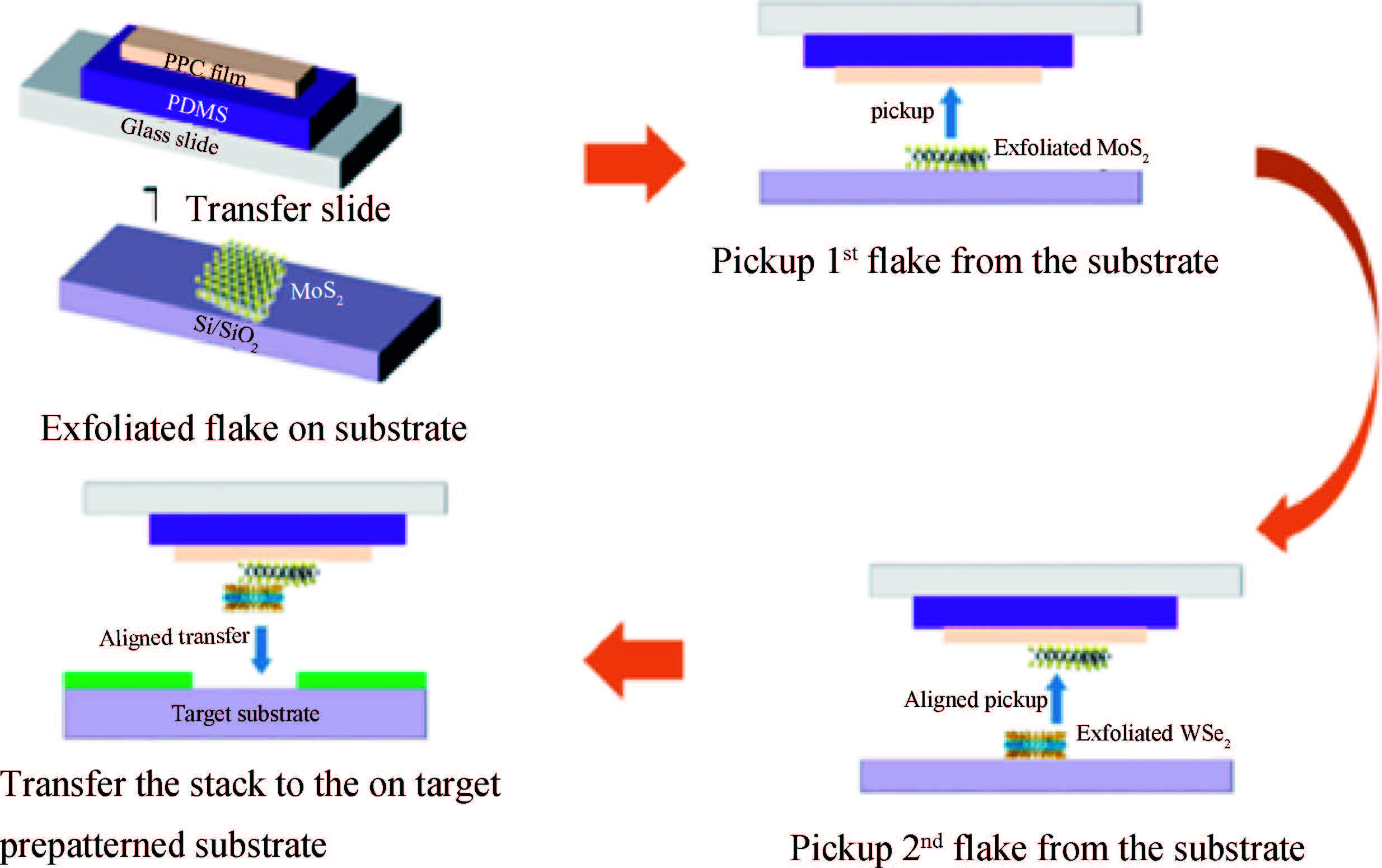 Fig. 2.  (Color online) Pick up and dry transfer techniques for building van der Waals heterostructure.